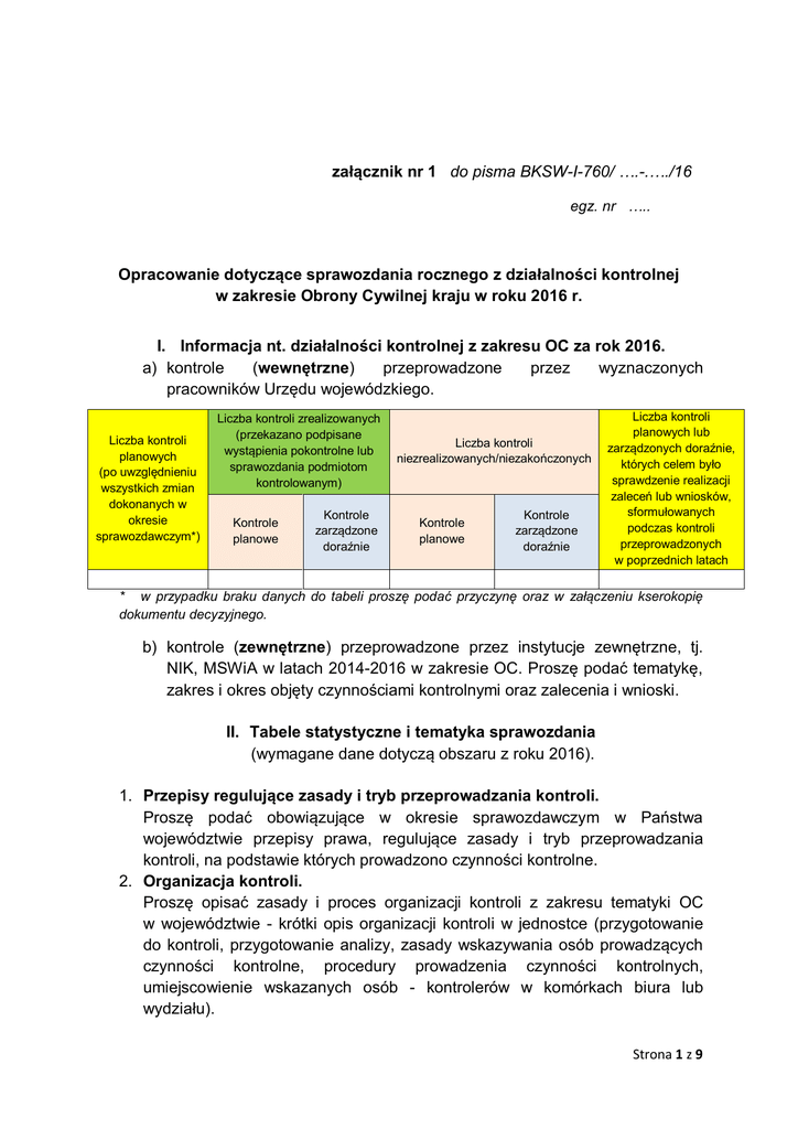 załącznik nr 1 do pisma BKSW-I-760/ ….-.…./16 egz. nr ….. Opracowanie dotyczące sprawozdania rocznego z działalności kontrolnej w zakresie Obrony Cywilnej kraju w roku 2016 r. I. Informacja nt. działalności kontrolnej z zakresu OC za rok 2016. a) kontrole (wewnętrzne) przeprowadzone przez wyznaczonych pracowników Urzędu wojewódzkiego. Liczba kontroli planowych (po uwzględnieniu wszystkich zmian dokonanych w okresie sprawozdawczym*) Liczba kontroli zrealizowanych (przekazano podpisane wystąpienia pokontrolne lub sprawozdania podmiotom kontrolowanym) Kontrole planowe Kontrole zarządzone doraźnie Liczba kontroli niezrealizowanych/niezakończonych Kontrole planowe Kontrole zarządzone doraźnie Liczba kontroli planowych lub zarządzonych doraźnie, których celem było sprawdzenie realizacji zaleceń lub wniosków, sformułowanych podczas kontroli przeprowadzonych w poprzednich latach * w przypadku braku danych do tabeli proszę podać przyczynę oraz w załączeniu kserokopię dokumentu decyzyjnego. b) kontrole (zewnętrzne) przeprowadzone przez instytucje zewnętrzne, tj. NIK, MSWiA w latach 2014-2016 w zakresie OC. Proszę podać tematykę, zakres i okres objęty czynnościami kontrolnymi oraz zalecenia i wnioski. II. Tabele statystyczne i tematyka sprawozdania (wymagane dane dotyczą obszaru z roku 2016). 1. Przepisy regulujące zasady i tryb przeprowadzania kontroli. Proszę podać obowiązujące w okresie sprawozdawczym w Państwa województwie przepisy prawa, regulujące zasady i tryb przeprowadzania kontroli, na podstawie których prowadzono czynności kontrolne. 2. Organizacja kontroli. Proszę opisać zasady i proces organizacji kontroli z zakresu tematyki OC w województwie - krótki opis organizacji kontroli w jednostce (przygotowanie do kontroli, przygotowanie analizy, zasady wskazywania osób prowadzących czynności kontrolne, procedury prowadzenia czynności kontrolnych, umiejscowienie wskazanych osób - kontrolerów w komórkach biura lub wydziału). Strona 1 z 9 3. Dane dotyczące charakterystyki kontroli z zakresu OC w województwie. Proszę zamieścić następujące dane w poniższej tabeli. Podać komórkę organizacyjną i stanowisko służbowe. staż pracy związany z prowadzeniem czynności kontrolnych z OC** Uwagi Liczba osób z poszczególnych komórek organizacyjnych realizujących czynności kontrolne z zakresu OC. Osoby koordynujące kontrole (zaangażowane w planowanie i koordynację kontroli z zakresu OC). Liczba osób, które faktycznie uczestniczyły w czynnościach kontrolnych w 2016 r. Liczba komórek organizacyjnych, w których przeprowadzono kontrole z zakresu OC. Ponadto proszę podać jaki był: Dane Uwagi Średni czas trwania kontroli od dnia podpisania upoważnienia do kontroli do dnia przekazania projektu wystąpienia pokontrolnego jednostce kontrolowanej (w dniach roboczych)*. Średni czas trwania kontroli od dnia przekazania projektu wystąpienia pokontrolnego do dnia przekazania jednostce kontrolowanej podpisanego wystąpienia pokontrolnego (w dniach roboczych)*. Średni czas trwania kontroli od dnia podpisania upoważnienia do kontroli do dnia przekazania podpisanego sprawozdania z kontroli (w dniach roboczych)*. * w przypadku zakończenia postępowania kontrolnego innym dokumentem niż sprawozdanie lub wystąpienie pokontrolne, proszę o podanie czasu realizacji kontroli do momentu podpisania upoważnienia do momentu podpisania dokumentu kończącego kontrolę. ** liczba lat pracy/służby, podczas których osoby wykazane w tabeli uczestniczyły w działaniach kontrolnych, realizowanych na podstawie ustawy o kontroli w administracji rządowej, decyzji nr 65 MSW lub obowiązujących wcześniej w tym zakresie regulacji prawnych. 4. Sposób i proces planowania kontroli w zakresie OC . Krótki opis dotyczący: procedury, zasad i formy planowania kontroli. Do opisu należy dołączyć analizę ryzyka sporządzoną na potrzeby wskazania tematów kontroli z zakresu OC do rocznego planu kontroli na 2016 (jeżeli taką analizę sporządzono, opracowano plan kontroli i prowadzono kontrole). Strona 2 z 9 5. Liczba przeprowadzonych kontroli z zakresu OC w roku 2016. Proszę o wypełnienie tabeli z uwzględnieniem podziału na: 1) gospodarowanie sprzętem OC, 2) utrzymanie stanu technicznego budowli ochronnych oraz urządzeń specjalnych OC, 3) system wykrywania i alarmowania, realizacja zadań specjalnych związanych z organizacją SWO i SWA, 4) funkcjonowanie wojewódzkich formacji OC, 5) szkolenia dla OC, 6) pozostałe kontroli. W tabelach należy dokonać pełnej kwalifikacji kontroli. Oznacza to, że jeżeli w danym wierszu tabeli zostanie wykazana kontrola, musi być ona przyporządkowana do właściwych kolumn, opisujących ją w trzech nw. aspektach: a) Czy kontrola była ujęta w rocznym palnie kontroli czy zarządzona doraźnie? b) Czy kontrola została przeprowadzona w trybie zwykłym lub uproszczonym? c) Czy celem kontroli było badanie nowego problemu, sprawdzenie realizacji zaleceń wydanych podczas wcześniej przeprowadzonych kontroli lub kompleksowa ocena prawidłowości funkcjonowania jednostki? Jeżeli w wyniku tych kontroli były kierowane wnioski lub zawiadomienia do właściwych organów, należy je wyróżnić i przedstawić dodatkowo w formie opisowej. W sprawozdaniu należy wykazać/zaznaczyć kontrole przeprowadzone w powiatach/gminach oraz kontrole wewnętrzne w biurze/wydziale UW. Tabela do wypełnienia z uwzględnieniem podziału wym. w pkt. 5 ppkt. 1-6. Tryb zwykły (Roczny plan kontroli) **** Poza planem **** Tryb uproszczony **** Kontrole mające charakter kompleksowy Kontrole mające charakter sprawdzający Kontrole mające charakter problemowy Kontrole mające charakter kompleksowy Kontrole mające charakter sprawdzający Kontrole mające charakter problemowy Kontrole mające charakter kompleksowy w takiej formie należy wypełnić tabelę dla pozostałego podziału wym. w pkt 5 ppkt. 1 - 6. Kontrole maj
