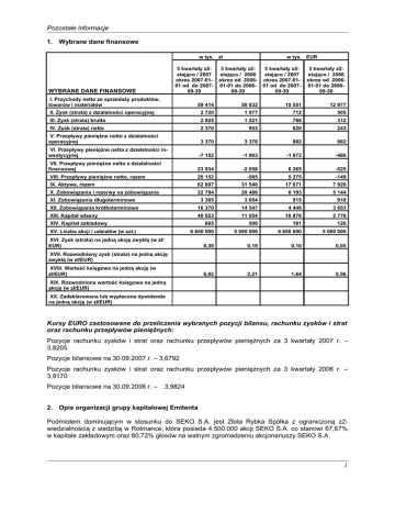Pozostałe informacje 1. Wybrane dane finansowe w tys. zł w tys. EUR 3 kwartały z2stająco / 2007 okres 2007-0101 od do 200709-30 3 kwartały z2stająco / 2006 okres od 200601-01 do 200609-30 3 kwartały z2stająco / 2007 okres 2007-0101 od do 200709-30 3 kwartały z2stająco / 2006 okres od 200601-01 do 200609-30 59 414 50 832 15 551 12 977 II. Zysk (strata) z działalności operacyjnej 2 720 1 977 712 505 III. Zysk (strata) brutto 2 925 1 221 766 312 IV. Zysk (strata) netto 2 370 953 620 243 V. Przepływy pieniężne netto z działalności operacyjnej WYBRANE DANE FINANSOWE I. Przychody netto ze sprzedaży produktów, towarów i materiałów 3 370 3 376 882 862 VI. Przepływy pieniężne netto z działalności inwestycyjnej -7 152 -1 903 -1 872 -486 VII. Przepływy pieniężne netto z działalności finansowej 23 934 -2 058 6 265 -525 VIII. Przepływy pieniężne netto, razem 20 152 -585 5 275 -149 IX. Aktywa, razem 62 807 31 540 17 071 7 920 X. Zobowiązania i rezerwy na zobowiązania 22 784 20 486 6 193 5 144 XI. Zobowiązania długoterminowe 3 365 3 654 915 918 XII. Zobowiązania krótkoterminowe 16 370 14 547 4 449 3 653 XIII. Kapitał własny 40 023 11 054 10 878 2 776 665 500 181 126 6 650 000 5 000 000 6 650 000 5 000 000 0,39 0,19 0,10 0,05 6,02 2,21 1,64 0,56 XIV. Kapitał zakładowy XV. Liczba akcji / udziałów (w szt.) XVI. Zysk (strata) na jedną akcję zwykłą (w zł/ EUR) XVII. Rozwodniony zysk (strata) na jedną akcję zwykłą (w zł/EUR) XVIII. Wartość księgowa na jedną akcję (w zł/EUR) XIX. Rozwodniona wartość księgowa na jedną akcję (w zł/EUR) XX. Zadeklarowana lub wypłacona dywidenda na jedną akcję (w zł/EUR) Kursy EURO zastosowane do przeliczenia wybranych pozycji bilansu, rachunku zysków i strat oraz rachunku przepływów pieniężnych: Pozycje rachunku zysków i strat oraz rachunku przepływów pieniężnych za 3 kwartały 2007 r. – 3,8205 Pozycje bilansowe na 30.09.2007 r. – 3,6792 Pozycje rachunku zysków i strat oraz rachunku przepływów pieniężnych za 3 kwartały 2006 r. – 3,9170 Pozycje bilansowe na 30.09.2006 r. – 3,9824 2. Opis organizacji grupy kapitałowej Emitenta Podmiotem dominującym w stosunku do SEKO S.A. jest Złota Rybka Spółka z ograniczoną z2wiedzialnością z siedzibą w Rotmance, która posiada 4.500.000 akcji SEKO S.A. co stanowi 67,67% w kapitale zakładowym oraz 80,72% głosów na walnym zgromadzeniu akcjonariuszy SEKO S.A. 1 Pozostałe informacje SEKO S.A. jest właścicielem 90,0% udziałów w spółce Złota Rybka Bis Sp. z o.o., które dają 90,0% udziałów w głosach na Zgromadzeniu Wspólników. Kapitał zakładowy spółki Złota Rybka Bis Sp. z o.o. wynosi 50,0 tys. zł. Z dniem 3 września 2007 r. spółka ta przejęła w pełni działalność handlową polegającą na dystrybucji na terenie Trójmiasta przetworów rybnych produkowanych przez Spółkę, w tym zarządzanie siecią sklepów rybnych działających pod marką "Złota Rybka", prowadzoną dotychczas przez Złotą Rybkę sp. z o.o. SEKO S.A. jest właścicielem 2 693 udziałów w spółce POLRYB Sp. z o.o., które stanowią 50,0% kapitału zakładowego spółki i dają 50,0% udziałów w głosach na Zgromadzeniu Wspólników. Ponadto SEKO S.A. korzysta z osobistego przywileju powoływania dwóch spośród trzech członków zarządu spółki. Przedmiotem działalności POLRYB Sp. z o.o. jest obróbka ryby bałtyckiej (głównie śledzia i szprota), filetowanie flądry na eksport do Danii, obróbka ryb słodkowodnych na rynek krajowy (pstrąg) oraz filetowanie makreli na eksport do Francji. 3. Skutki zmian w strukturze SEKO S.A. W III kwartale 2007 roku nie wystąpiły zmiany w strukturze SEKO S.A. 4. Stanowisko Zarządu SEKO publikowanych prognoz S.A. odnośnie możliwości zrealizowania wcześniej SEKO S.A. opublikowało prognozy wyników finansowych na 2007 r. w prospekcie emisyjnym zatwierdzonym przez Komisję Nadzoru Finansowego w dniu 21 lutego 2007 r. Prognozy te przewidywały osiągnięcie w 2007 r. następujących wielkości finansowych: - przychody ze sprzedaży netto 95 700 tys. zł - zysk z działalności operacyjnej 4 740 tys. zł - zysk z działalności operacyjnej powiększony o amortyzację 6 060 tys. zł - zysk brutto przed opodatkowaniem 4 320 tys. zł - zysk netto 3 460 tys. zł Biorąc pod uwagę wyniki Spółki osiągnięte w trzecim kwartale oraz narastająco w ciągu trzech kwartałów 2007 r., a także obecną sytuację rynkową (w szczególności istotny wzrost cen niektórych surowców wykorzystywanych przez Spółkę) Zarząd SEKO S.A. podtrzymuje opublikowaną prognozę. W przypadku zaistnienia zdarzeń, które mogą spowodować istotną zmianę prognozowanych wyników Spółka niezwłocznie przekaże stosowną korektę prognoz. 5. Akcjonariusze posiadający co najmniej 5% głosów na WZA, zmiany w stanie posiadania akcjonariuszy w okresie od przekazania poprzedniego raportu kwartalnego. Na dzień 2 listopada 2007 r. następujący akcjonariusze posiadali co najmniej 5% akcji na WZA Spółki: Akcjonariusz Złota Rybka Sp. z o.o. z siedzibą w Rotmance Opera TFI SA Liczba akcji Wartość nominalna akcji (tys. PLN) Udział w kapitale Liczba głosów (%) Udział w głosach (%) 4 500 000 450,0 67,67 9 000 000 80,72 575 292 57,5 8,65 575 292 5,16 2 Pozostałe informacje W okresie od przekazania ostatniego raportu kwartalnego, tj. od dnia 6 sierpnia 2007 r. do dnia 2 listopada 2007 r. nie wystąpiły zmiany w stanie posiadania akcji przez akcjonariuszy posiadających co najmniej 5% głosów na WZA. 6. Zestawienie stanu posiadania akcji SEKO S.A. przez Osoby Zarządzające i Nadzorujące wraz ze wskazaniem zmiany w stanie posiadania od przekazania poprzedniego raportu kwartalnego. Zarząd Spółki Na dzień 2 listopada 2007 r. Kazimierz Kustra, Prezes Zarządu Spółki, nie posiada bezpośrednio żadnych akcji SEKO S.A., natomiast posiada 2 000 udziałów o wartości 100 000,00 zł w spółce Złota Rybka Sp. z o.o. w