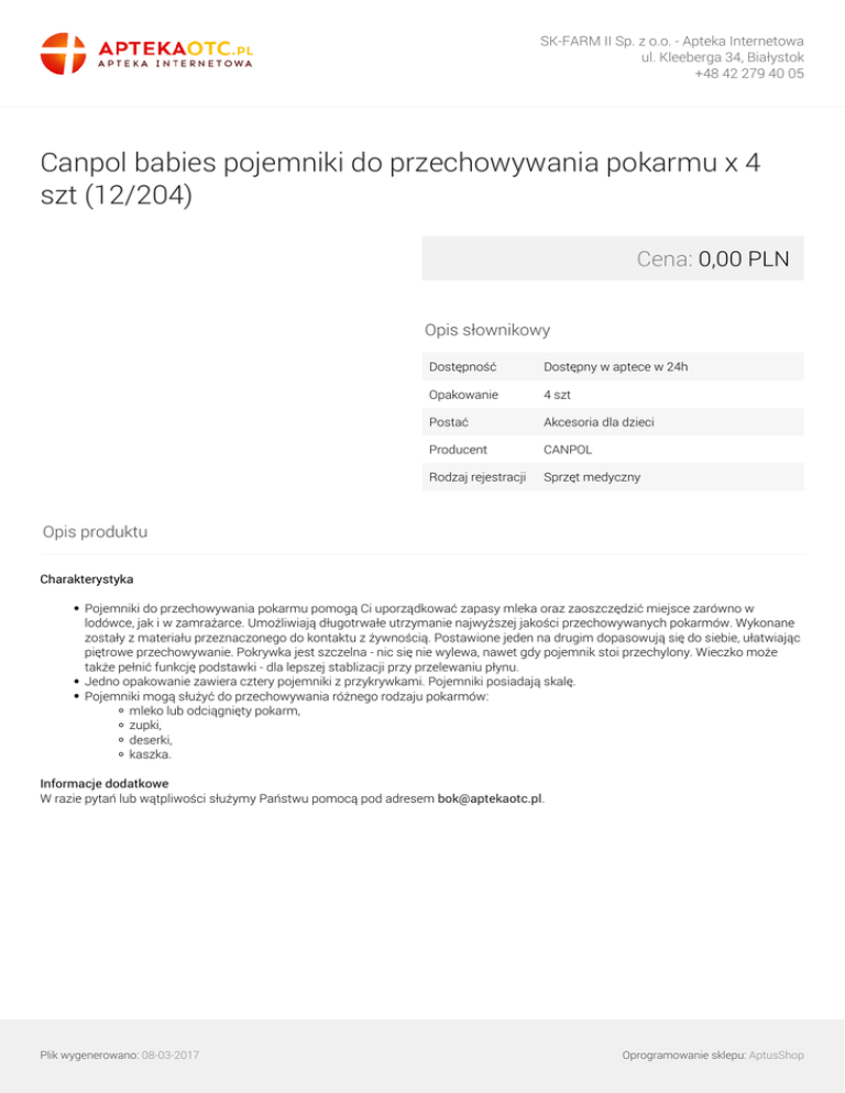 SK-FARM II Sp. z o.o. - Apteka Internetowa ul. Kleeberga 34, Białystok +48 42 279 40 05 Canpol babies pojemniki do przechowywania pokarmu x 4 szt (12/204) Cena: 0,00 PLN Opis słownikowy Dostępność Dostępny w aptece w 24h Opakowanie 4 szt Postać Akcesoria dla dzieci Producent CANPOL Rodzaj rejestracji Sprzęt medyczny Opis produktu Charakterystyka Pojemniki do przechowywania pokarmu pomogą Ci uporządkować zapasy mleka oraz zaoszczędzić miejsce zarówno w lodówce, jak i w zamrażarce. Umożliwiają długotrwałe utrzymanie najwyższej jakości przechowywanych pokarmów. Wykonane zostały z materiału przeznaczonego do kontaktu z żywnością. Postawione jeden na drugim dopasowują się do siebie, ułatwiając piętrowe przechowywanie. Pokrywka jest szczelna - nic się nie wylewa, nawet gdy pojemnik stoi przechylony. Wieczko może także pełnić funkcję podstawki - dla lepszej stablizacji przy przelewaniu płynu. Jedno opakowanie zawiera cztery pojemniki z przykrywkami. Pojemniki posiadają skalę. Pojemniki mogą służyć do przechowywania różnego rodzaju pokarmów: mleko lub odciągnięty pokarm, zupki, deserki, kaszka. Informacje dodatkowe W razie pytań lub wątpliwości służymy Państwu pomocą pod adresem [email protected]. Plik wygenerowano: 08-03-2017 Powered by TCPDF (www.tcpdf.org) Oprogramowanie sklepu: AptusShop