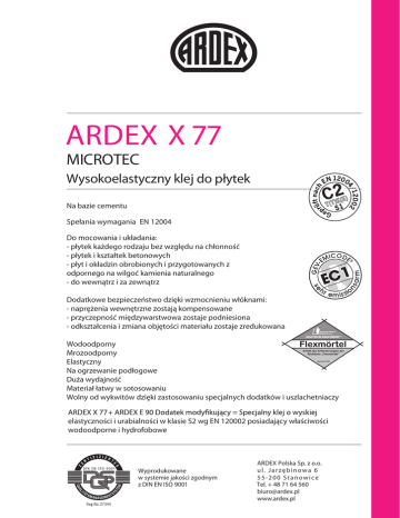 ARDEX X 77 MICROTEC Wysokoelastyczny klej do płytek Na bazie cementu Spełania wymagania EN 12004 Do mocowania i układania: - płytek każdego rodzaju bez względu na chłonność - płytek i kształtek betonowych - płyt i okładzin obrobionych i przygotowanych z odpornego na wilgoć kamienia naturalnego - do wewnątrz i za zewnątrz Dodatkowe bezpieczeństwo dzięki wzmocnieniu włóknami: - naprężenia wewnętrzne zostają kompensowane - przyczepność międzywarstwowa zostaje podniesiona - odkształcenia i zmiana objętości materiału zostaje zredukowana Wodoodporny Mrozoodporny Elastyczny Na ogrzewanie podłogowe Duża wydajność Materiał łatwy w sotosowaniu Wolny od wykwitów dzięki zastosowaniu specjalnych dodatków i uszlachetniaczy elastyczności i urabialności w klasie S2 wg EN 120002 posiadający właściwości wodoodporne i hydrofobowe Wyprodukowane w systemie jakości zgodnym z DIN EN ISO 9001 ARDEX Polska Sp. z o.o. ul. Jarzębinowa 6 55-200 Stanowice Tel. + 48 71 64 560 [email protected] www.ardex.pl ARDEX X 77 MICROTEC Wysokoelastyczny klej do płytek Zakres stosowania: Stosowany do wewnątrz i na zewnątrz, na ściany i podłogi. Elastyczny klej o lekkiej puszystej konsystencji. Układanie i mocowanie: - płytek każdego rodzaju bez względu na ich chłonność - mozaiki ze szkła i porcelany - płyt i kształtek betonowych - płyt z kamieni naturalnych odpornych na wilgoć Osadzanie: - odpowiednich płyt budowlanych np. gipsowo-kartonowych - płyt izolacyjnych z twardej pianki, styropianu, wełny mineralnej obustronnie pokrywane zaprawą- docieplenia) Osadzanie i układanie płytek w basenach Osadzanie ceramicznych okładzin na fasadach Osadzanie i układanie płytek na jeszcze kurczących się podłożach betonowych i murowanych ( mających minimum 3 miesiące ) Na podłożach przy ogrzewaniu podłogowym stosować metodę platerowania – nakładanie kleju również na płytkę. Opis materiału: Proszek na bazie specjalistycznych cementów, wypełniaczy, wzbogacone specjalnymi dodatkami , włóknami MICROTEC oraz elastycznymi tworzywami sztucznymi. Przy mieszaniu z wodą powstaje jednorodna , elastyczna zaprawa o dużej wytrzymałości. Czas pracy wynosi 3 godziny po zmieszaniu z wodą. Zaprawa twardnieje poprzez hydratację i wysychanie. Przygotowane podłoża: Podłoże może być suche lub wilgotne, musi być trwałe, nośne, mocne, wolne od kurzu i środków oddzielających. Wewnątrz podłoża chłonne, gipsowe - szlifowane lub z jastrychu anhydrytowego powinny być zagruntowane środkiem ARDEX P52 rozcieńczonym z wodą w stosunku 1:3. Na podłoża niechłonne np.: metal, szkło, powłoki lakiernicze, tworzywa sztuczne we wnętrzach należy zagruntować środkiem ARDEX P82. Wewnątrz na stare płytki można zastosować produkt ARDEX P4 lub wykonać cienkie szpachlowanie kontaktowe klejem ARDEX X77. Na zewnątrz budynków, oraz na powierzchniach stale narażonych na działanie wilgoci przed przyklejeniem płytek należy nanieść jako warstwę sczepną i uszczelniającą ARDEX 8+9. (tarasy/balkony/łazienki itp) Układanie płytek stosując klej ARDEX X77 wykonuje się po wyschnięciu środka gruntującego, warstwy szpachli kontaktowej lub warstwy uszczelniającej. Przygotowanie i stosowanie materiału: Do czystego naczynia do mieszania wlewa się czystą wodę i intensywnie mieszając sypie się proszek ARDEX X77, aby uzyskać jednorodną, konsystencję bez grudek. Po wymieszaniu robimy przerwę ok. 1 minuty i mieszamy ponownie. Otrzymujemy jednorodną łatwą w nakładaniu puszysta masę klejącą. W celu wymieszania 25 kg proszku ARDEX X77 potrzebne jest ok. 11 litra wody. Konsystencja zaprawy zależy od rodzaju, wielkości i ciężaru układanych płytek. W celu przygotowania kleju o jeszcze lepszych własnościach – wysoko elastyczny, wodoodporny, należy zmieszać proszek ARDEX X77 z E90. Proporcje mieszania w tym przypadku wynoszą: 25 kg ARDEX X77- proszek 4,5 kg ARDEX E 90 9,0 l wody Zaprawa ARDEX X77 jest nanoszona na podłoże i tak rozprowadzana za pomocą zębatej packi aby zapewnić klejenie płytek na całej ich powierzchni. Podłoże, rodzaj, wielkość i odwrotna strona płytek decydują o doborze wielkości packi zębatej. Przy powierzchniach wystawionych na duże obciążenia zaleca się nanoszenie zaprawy także na tylną powierzchnię płytki, aby uzyskać możliwie pełne podsadzenie okładziny. Chropowate i nierówne podłoża można przeszpachlować i wyrównać przy użyciu ARDEX X77. Po stwardnieniu warstwy wyrównującej można wykonać układanie okładzin. Jednorazowo nałożone powierzchnie kleju powinny być jedynie tak duże aby można było łatwo ułożyć płytki w jeszcze wilgotną warstwę zaprawy. Ułożone płytki można korygować do 30 minut od ich położenia. Przy klejeniu płyt tłumiących i izolujących nanosi się zaprawę w formie pasów lub kęsów na odwrotnej stronie płyt. Jeżeli przeznaczone do osadzania i klejenia płyty nie posiadają powierzchni porowatej, należy w takim przypadku powierzchnię najpierw otworzyć mechanicznie ( szlifowanie grubym ziarnem ) tak by zwiększyć przyczepność. Przy układaniu mozaiki pokrytej z przodu przyklejoną siatką papierową na szkle lub porcelanie, należy nałożyć tak dużo zaprawy ARDEX X77, aby przy dociśnięciu mozaiki w przestrzeniach do fugowania pojawił się klej. W takim przypadku konieczne jest również dodatkowe fugowanie za pomocą ARDEX X77. W razie wątpliwości należy przeprowadzić klejenie próbne. ARDEX X77 należy stosować w temperaturze powyżej 5°C. Wyższe temperatury skracają, niższe wydłużają czas pracy, stosowania i obciążenia gotowej powierzchni. Zaleca się: Przy osadzaniu płytek na płytach budowlanych należy zwrócić uwagę na to, aby były one stabilnie, sztywno umocowane na konstrukcji. W przypadku wykonania uszczelnień podpłytkowych zgodnych z instrukcją pod tytułem: Wskazówki odnośnie wykonania uszczel