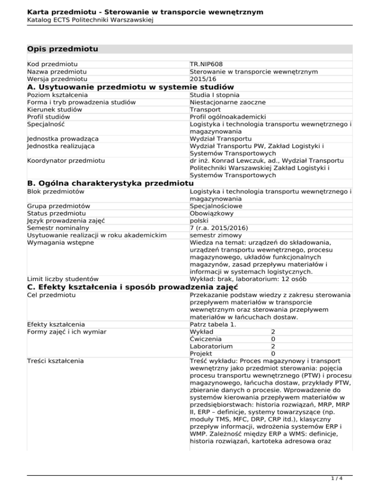 Karta przedmiotu - Wydział Transportu Politechniki Warszawskiej