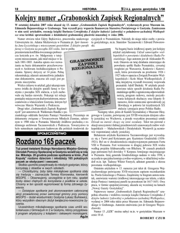 12 HISTORIA NOWA gazeta gostyñska 1/08 Kolejny numer Grabonoskich Zapisek Regionalnych W ostatniej dekadzie 2007 roku ukaza³ siê 13. numer Grabonoskich Zapisek Regionalnych, wydawanych przez Muzeum im. Edmunda Bojanowskiego w Grabonogu. Tom wyszed³ przy wsparciu finansowym Starostwa Powiatowego w Gostyniu. Zamieszono w nim szeæ artyku³ów, recenzjê ksi¹¿ki Dariusza Czwojdraka Z dziejów ludnoci ¿ydowskiej w po³udniowo-zachodniej Wielkopolsce oraz krótkie sprawozdanie z dzia³alnoci grabonoskiej placówki muzealnej w roku 2006. Numer otwiera tekst Edyty B¹tkiewicz, pracownika naukowego cyzyjnych w Poznañskiem. Nale¿a³y do niego tak¿e osoby z powiaUniwersytetu im. Adama Mickiewicza w Poznaniu pt. Spór kanoni- tu gostyñskiego, m.in. Stanis³aw Taczanowski i Edward Potworowka Jana £yczyñskiego z mieszczanami gostyñskimi. Z dziejów parafii ski. farnej w Gostyniu na pocz¹tku XIX wieku. Jest to próba Na bogatej bazie ród³owej oparty jest kolejny przestawienia konfliktu ówczesnego proboszartyku³ zatytu³owany Udzia³ samorz¹dów wielcza kocio³a p.w. w. Ma³gorzaty z tutejkopolskich w powstaniu i dzia³alnoci Radia Poszymi mieszczanami, jaki mia³ miejsce w laznañskiego. Jego autorem jest dr Aleksander Pitach 1801-1803. Autorka opiera swe rozwawoñ. Omawia on tutaj dzia³ania zmierzaj¹ce do ¿ania na bazie dokumentów przechowywapowo³ania spó³ki Radio Poznañskie, czwartej nych w Archiwum Archidiecezjalnym w Porozg³oni po Warszawie, Krakowie i Katowiznaniu. Sprawy dotyczy a¿ 14 pism. Pe³n¹ cach, która powstawa³a na prze³omie 1926 i rekonstrukcjê zdarzeñ uniemo¿liwia jednak¿e 1927 roku w oparciu o Zwi¹zek Powiatów Wielstan dokumentów, znaczna ich czêæ jest po kopolskich i Ko³o Miast Wielkopolskich. Z prostu nieczytelna. tak¹ inicjatyw¹ wyszed³ ówczesny wojewoda Wielce ciekawy to artyku³, gdy¿ ukazuje nam poznañski Adolf Bniñski. W artykule przednowe ród³a do dziejów parafii farnej w Gostawiono tak¿e sposób dzia³ania Radia Postyniu z pocz¹tku XIX stulecia, a tych zachoznañskiego spó³ki z ograniczon¹ odpowiedzialwa³o siê bardzo niewiele. Pokazuje te¿ relacje noci¹, program radiowy, metody pozyskipomiêdzy miejscowym duchowieñstwem, mieszwania kolejnych s³uchaczy oraz k³opoty ficzañstwem a w³acicielem Gostynia, którym by³ nansowe, które ostatecznie spowodowa³y jej wówczas Marcin Wêsierski z Podrzecza. likwidacjê w po³owie lat trzydziestych XX Drugi tekst Grabonoskich Zapisek Regionalstulecia i przejêcie przez Polskie Radio. nych jest autorstwa dr. Waldemara Handke z poNastêpny tekst, pióra dr Kamili Szymañskiej z Muzeum Okrêznañskiego oddzia³u Instytutu Pamiêci Narodowej. Prezentuje on gowego w Lesznie, powiêcony jest XVIII-wiecznym dziejom szkodokumenty zwi¹zane z Towarzystwem M³odych Ziemian, za³o¿o- ³y jezuickiej we Wschowie, a przede wszystkim prezentacji sztuki nym w 1908 roku w Poznaniu. Materia³y ród³owe pochodz¹ z ro- Dziwak na staroæ chc¹cy siê ¿eniæ oszukany. Tekst ten powsta³ z dzinnego archiwum Taczanowskich z Podrzecza. Towarzystwo to okazji uroczystoci lubnej przedstawicieli szanowanych rodów wielby³o naturalnym zapleczem kadrowym dla polskich rodowisk de- kopolskich Ma³achowskich i Dzia³yñskich. Wystawili j¹ uczniowie wspomnianej szko³y jezuickiej. SPO£ECZEÑSTWO Bohaterem artyku³u Kazimierza Taczanowskiego jest wywodz¹cy siê z Turwi pod Kocianem gen. Kazimierz Grudzielski (18561921). By³ on w dwudziestoleciu miêdzywojennym patronem Fortu VIII w Poznaniu. Fort wzniesiono w drugiej po³owie XIX wieku Tu¿ przed wiêtami Bo¿ego Narodzenia MiejskoGminny wed³ug projektu feldmarsza³ka von Blüchera. W czasach pruskich Orodek Pomocy Spo³ecznej w Gostyniu wcieli³ siê w rolê jego patronami byli dowódcy V Korpusu Armijnego stacjonuj¹cego w. Miko³aja. 20 grudnia podczas spotkania w kinie Pod w Poznaniu. Imiê genera³a Grudzielskiego nadano w roku 1930, a Kopu³¹ rozdano dzieciom i m³odzie¿y 165 pokanych uczyni³a to specjalna komisja cywilno-wojskowa, w sk³ad której wchodzi³ m.in. kpt. Tadeusz Wiktor Fenrych, adiutant genera³a z okresu paczek ze s³odyczami i owocami. S³odkie upominki powêdrowa³y do m³odych gostynian, którzy powstania wielkopolskiego. korzystaj¹ z obiadów w swych szko³ach. Ostatnim artyku³em w 13. numerze jest tekst dr. Grzegorza Woj Chcielibymy, ¿eby takie miko³ajkowe spotkania sta³y ciechowskiego powiêcony XVII-wiecznym zapisom rocznikarskim siê tradycj¹ zaznaczy³a Teresa Klonowska, kierownik ks. Paw³a Gotockiego z Ponieca. Znajdziemy tu biogram autora notaMGOPS. Obserwujemy, szczególnie w tym roku, spadek tek, omówienie wartoci ród³owej interesuj¹cego nas tekstu, a tak¿e liczby dzieci chêtnych do korzystania z posi³ków w szkole. dzieje Ponieca i tamtejszej parafii na przestrzeni lat 1617-1651. Owa Chcemy w ten sposób wypromowaæ tê formê zdrowego ¿y- praca, w formie spopularyzowanej, ukaza³a siê wczeniej na ³amach wienia. Nowej Gazety Gostyñskiej. Dzisiejsze spotkanie jest ukoronowaniem ca³orocznej Najnowszy numer Grabonoskich Zapisek Regionalnych uzuakcji prowadzonej przez samorz¹d gminny przy pomocy pe³nia obszerna i wnikliwa recenzja ksi¹¿ki Dariusza Czwojdraka Z MGOPS doda³ wiceburmistrz Gostynia £ukasz Burkiewicz, dziejów ludnoci ¿ydowskiej w po³udniowo-zachodniej Wielkopolsce, który wszystkim obecnym z³o¿y³ wi¹teczno-noworoczne ¿y- wydanej w 2004 roku tak¿e przez Muzeum im. Edmunda Bojanowczenia. skiego w Grabonogu. Autorem omówienia jest dr Grzegorz WojcieUczestnikom miko³ajkowego spotkanie czas umilili wo- chowski. lontariusze z Gimnazjum nr 2 w Gostyniu, którzy przygotowaNumer 13 GZR mo¿na nabyæ m.in. w gostyñskim Muzeum w li program artystyczny z kolêdami i ciekawymi monologami. cenie 10 z³. AgJa ROBERT CZUB Rozdano 165 paczek