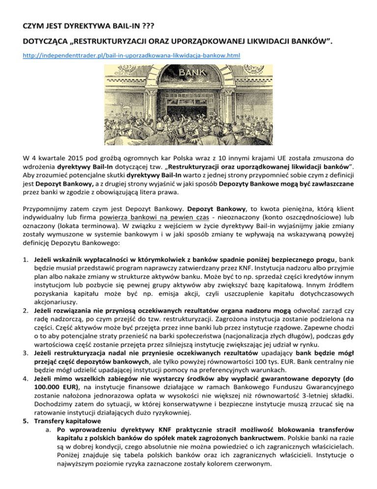 CZYM JEST DYREKTYWA BAIL-IN ??? DOTYCZĄCA „RESTRUKTURYZACJI ORAZ UPORZĄDKOWANEJ LIKWIDACJI BANKÓW”. http://independenttrader.pl/bail-in-uporzadkowana-likwidacja-bankow.html W 4 kwartale 2015 pod groźbą ogromnych kar Polska wraz z 10 innymi krajami UE została zmuszona do wdrożenia dyrektywy Bail-In dotyczącej tzw. „Restrukturyzacji oraz uporządkowanej likwidacji banków”. Aby zrozumieć potencjalne skutki dyrektywy Bail-In warto z jednej strony przypomnieć sobie czym z definicji jest Depozyt Bankowy, a z drugiej strony wyjaśnić w jaki sposób Depozyty Bankowe mogą być zawłaszczane przez banki w zgodzie z obowiązującą litera prawa. Przypomnijmy zatem czym jest Depozyt Bankowy. Depozyt Bankowy, to kwota pieniężna, którą klient indywidualny lub firma powierza bankowi na pewien czas - nieoznaczony (konto oszczędnościowe) lub oznaczony (lokata terminowa). W związku z wejściem w życie dyrektywy Bail-in wyjaśnijmy jakie zmiany zostały wymuszone w systemie bankowym i w jaki sposób zmiany te wpływają na wskazywaną powyżej definicję Depozytu Bankowego: 1. Jeżeli wskaźnik wypłacalności w którymkolwiek z banków spadnie poniżej bezpiecznego progu, bank będzie musiał przedstawić program naprawczy zatwierdzany przez KNF. Instytucja nadzoru albo przyjmie plan albo nakaże zmiany w strukturze aktywów banku. Może być to np. sprzedaż części kredytów innym instytucjom lub pozbycie się pewnej grupy aktywów aby zwiększyć bazę kapitałową. Innym źródłem pozyskania kapitału może być np. emisja akcji, czyli uszczuplenie kapitału dotychczasowych akcjonariuszy. 2. Jeżeli rozwiązania nie przyniosą oczekiwanych rezultatów organa nadzoru mogą odwołać zarząd czy radę nadzorczą, po czym przejść do tzw. restrukturyzacji. Zagrożona instytucja zostanie podzielona na części. Część aktywów może być przejęta przez inne banki lub przez instytucje rządowe. Zapewne chodzi o to aby potencjalne straty przenieść na barki społeczeństwa (nacjonalizacja złych długów), podczas gdy wartościowa część zostanie przejęta przez silniejszą instytucję zwiększając jej udział w rynku. 3. Jeżeli restrukturyzacja nadal nie przyniesie oczekiwanych rezultatów upadający bank będzie mógł przejąć część depozytów bankowych, ale tylko powyżej równowartości 100 tys. EUR. Bank centralny nie będzie mógł udzielić upadającej instytucji pomocy na preferencyjnych warunkach. 4. Jeżeli mimo wszelkich zabiegów nie wystarczy środków aby wypłacić gwarantowane depozyty (do 100.000 EUR), na instytucje finansowe działające w ramach Bankowego Funduszu Gwarancyjnego zostanie nałożona jednorazowa opłata w wysokości nie większej niż równowartość 3-letniej składki. Dochodzimy zatem do sytuacji, w której konserwatywne i bezpieczne instytucje muszą zrzucać się na ratowanie instytucji działających dużo ryzykowniej. 5. Transfery kapitałowe a. Po wprowadzeniu dyrektywy KNF praktycznie stracił możliwość blokowania transferów kapitału z polskich banków do spółek matek zagrożonych bankructwem. Polskie banki na razie są w dobrej kondycji, czego absolutnie nie można powiedzieć o ich zagranicznych właścicielach. Poniżej znajduje się tabela polskich banków oraz ich zagranicznych właścicieli. Instytucje o najwyższym poziomie ryzyka zaznaczone zostały kolorem czerwonym. 6. 7. 8. 9. b. Mimo iż kondycja Pekao, BZWBK, Millenium czy BPH jest relatywnie dobra, to w myśl nowego ustawodawstwa każdy z tych banków będzie mógł zostać w krótkim czasie wydrenowany z gotówki w imię ratowania centralni. KNF nie będzie miał narzędzi aby taki transfer zablokować tak długo, jak polskie banki będą spełniały wymogi kapitałowe. Ochrona Europejskiego Banku Centralnego. Do tej pory, gdy banki z południa Europy miały problem z płynnością zaciągały kredyt w banku centralnym lub odsprzedawały mu w cenie nominalnej bezwartościowe aktywa (niespłacalne kredyty lub śmieciowe obligacje). Dzięki temu EBC przejmował zobowiązania banków komercyjnych, co z kolei dawało czytelny sygnał - prowadźcie ryzykowną politykę, bo i tak Was wyratujemy. Obecne zmiany mają na celu oczyszczenie sytuacji. Z drugiej strony, kondycja EBC może być na tyle zła, że nie jest on w stanie przejąć więcej toksycznych aktywów. Przekazanie Brukseli resztek suwerenności. Jeszcze do niedawna nadzór nad krajowym system bankowym sprawował KNF. Mimo iż można zarzucić mu wiele błędów, to nasz system na tle innych krajów jest naprawdę w niezłej kondycji. Godząc się na wprowadzenie dyrektywy przekazujemy nadzór nad naszym systemem bankowym w ręce instytucji, które absolutnie nie są w stanie podnieść poziomu bezpieczeństwa. Chodzi wyłącznie o zwiększenie poziomu centralizacji przy podejmowaniu kluczowych decyzji. Podsumowanie. Wprowadzenie dyrektywy, na którą tak silnie naciskała Komisja Europejska nie ma nic wspólnego z podniesieniem bezpieczeństwa w systemie bankowym, a przynajmniej nie w Polsce. Pozwala ona bowiem na szybkie wydrenowanie krajowych banków z kapitału, byleby tylko nie dopuścić do upadku którejkolwiek z ważniejszych zdaniem UE instytucji finansowych. Poważnym problemem jest także oddanie nadzoru nad bankami w ręce biurokratów z Brukseli. Zgodnie z nowym prawem, jeżeli lokalny bank wpadnie w problemy, to unijny nadzór może odwołać zarząd oraz nakazać sprzedaż wartościowych aktywów innej grupie bankowej, co z kolei zwiększy konsolidację w systemie. Mniejsza ilość banków mających jednocześnie duży udział znacznie podnosi ryzyko systemowe. Jeżeli chodzi o strukturę systemu bankowego w Europie, to niestety zmierzamy w kierunku nakreślonym przez USA, gdzie 5 największych banków ma 80% udział w rynku. Na koniec warto się odnieść do samej gwarancji 100.000 euro. a. Załóżmy, że upada średniej wielkości bank na południu Europy. b. Jego zarząd ma wyb