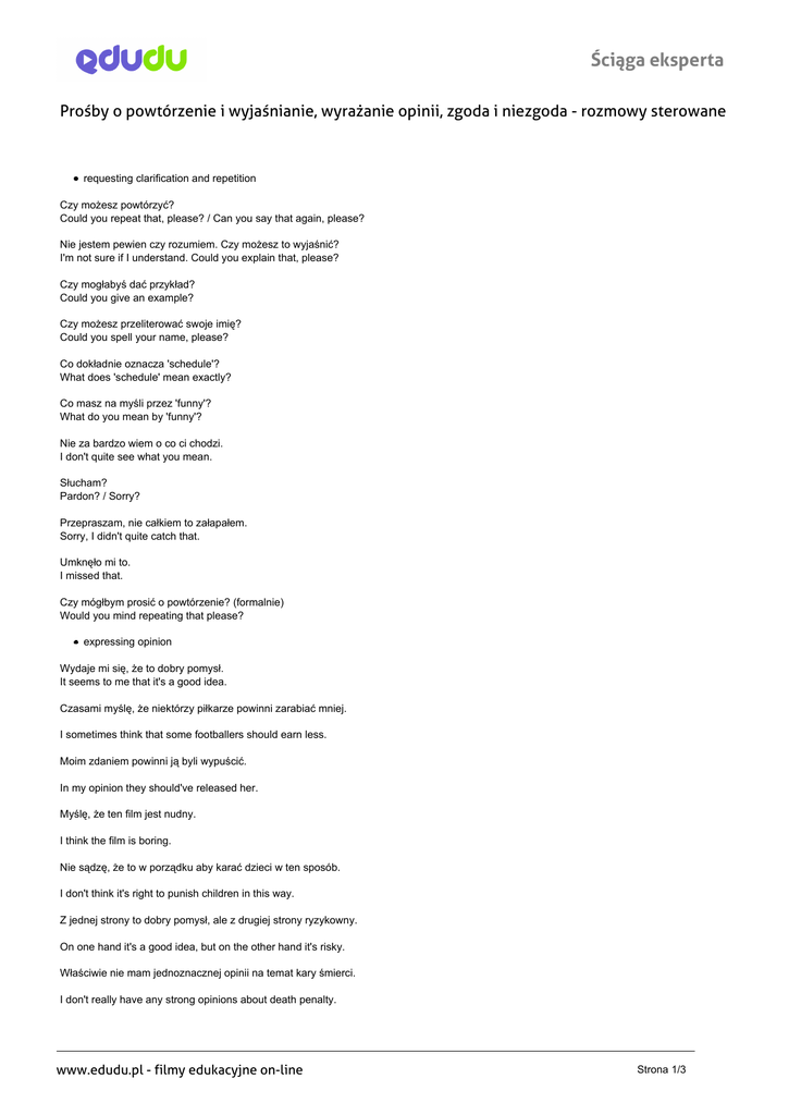 Ściąga eksperta Prośby o powtórzenie i wyjaśnianie, wyrażanie opinii, zgoda i niezgoda - rozmowy sterowane requesting clarification and repetition Czy możesz powtórzyć? Could you repeat that, please? / Can you say that again, please? Nie jestem pewien czy rozumiem. Czy możesz to wyjaśnić? I'm not sure if I understand. Could you explain that, please? Czy mogłabyś dać przykład? Could you give an example? Czy możesz przeliterować swoje imię? Could you spell your name, please? Co dokładnie oznacza 'schedule'? What does 'schedule' mean exactly? Co masz na myśli przez 'funny'? What do you mean by 'funny'? Nie za bardzo wiem o co ci chodzi. I don't quite see what you mean. Słucham? Pardon? / Sorry? Przepraszam, nie całkiem to załapałem. Sorry, I didn't quite catch that. Umknęło mi to. I missed that. Czy mógłbym prosić o powtórzenie? (formalnie) Would you mind repeating that please? expressing opinion Wydaje mi się, że to dobry pomysł. It seems to me that it's a good idea. Czasami myślę, że niektórzy piłkarze powinni zarabiać mniej. I sometimes think that some footballers should earn less. Moim zdaniem powinni ją byli wypuścić. In my opinion they should've released her. Myślę, że ten film jest nudny. I think the film is boring. Nie sądzę, że to w porządku aby karać dzieci w ten sposób. I don't think it's right to punish children in this way. Z jednej strony to dobry pomysł, ale z drugiej strony ryzykowny. On one hand it's a good idea, but on the other hand it's risky. Właściwie nie mam jednoznacznej opinii na temat kary śmierci. I don't really have any strong opinions about death penalty. www.edudu.pl - filmy edukacyjne on-line Strona 1/3 Ściąga eksperta Z mojej perspektywy to zły pomysł. www.edudu.pl - filmy edukacyjne on-line Strona 2/3 Ściąga eksperta From my perspective it's a bad idea. Jeżeli chodzi o mnie, Polacy pracują za dużo. As far as I'm concerned, Poles work too much. agreeing Dokładnie tak myślę. That's exactly what I think. Zgadzam się całkowicie. I agree entirely. / I couldn't agree more. Tak, zgadzam się. Yes, I agree. Zgadza się. / Masz rację. Right / That's right / You're right. Tak przypuszczam. I suppose so. Dokładnie! Exactly! Zgadzam się do pewnego stopnia. I agree up to a point. disagreeing To może być prawda, ale nie sądzę. That may be true but I don't think so. Nie jestem pewien czy się z tobą zgadzam I'm not sure if I agree with you. Być może, ale nie sądzisz że on kłamie? Perhaps, but don't you think that he's lying? Mylisz się. You're wrong. Nie mogę się z tobą zgodzić. I can't agree with you. Chyba nie mówisz poważnie. You can't be serious. Bzdura! (kolokwialnie) Rubbish! www.edudu.pl - filmy edukacyjne on-line Powered by TCPDF (www.tcpdf.org) Strona 3/3