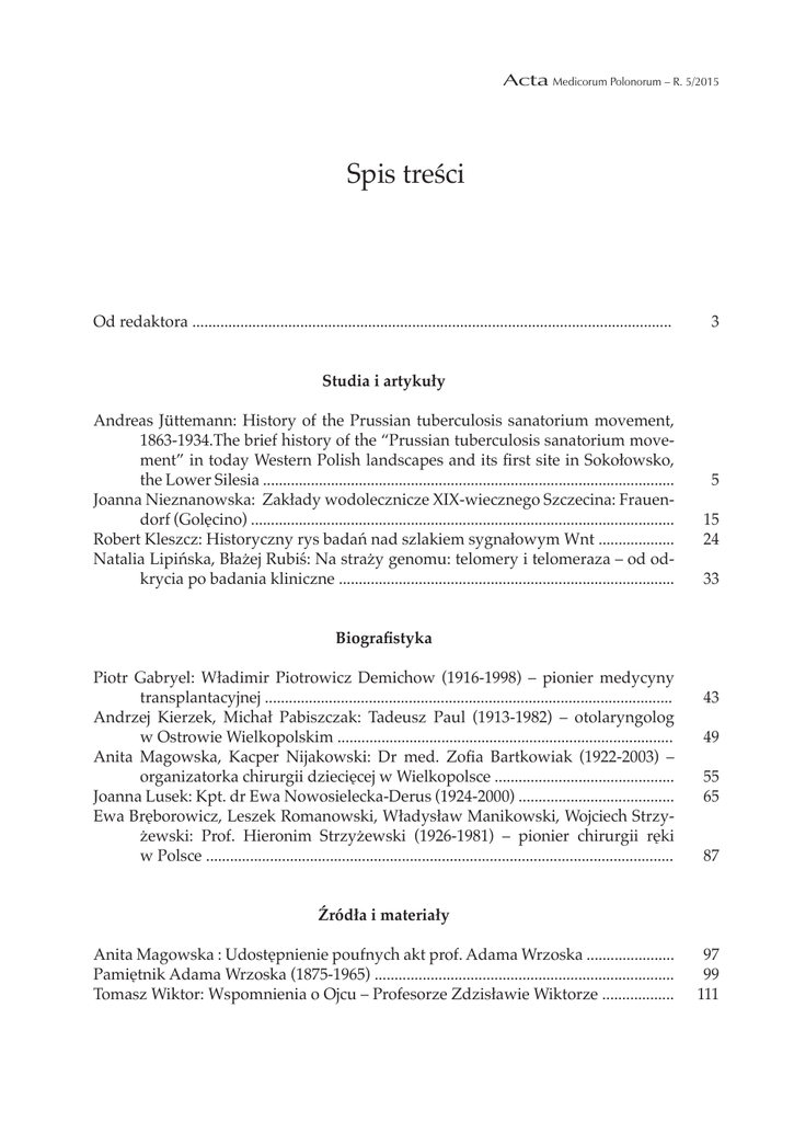 Acta Medicorum Polonorum – R. 5/2015 Spis treści Od redaktora ........................................................................................................................ 3 Studia i artykuły Andreas Jüttemann: History of the Prussian tuberculosis sanatorium movement, 1863-1934.The brief history of the “Prussian tuberculosis sanatorium movement” in today Western Polish landscapes and its first site in Sokołowsko, the Lower Silesia ....................................................................................................... Joanna Nieznanowska: Zakłady wodolecznicze XIX-wiecznego Szczecina: Frauendorf (Golęcino) .......................................................................................................... Robert Kleszcz: Historyczny rys badań nad szlakiem sygnałowym Wnt ................... Natalia Lipińska, Błażej Rubiś: Na straży genomu: telomery i telomeraza – od odkrycia po badania kliniczne .................................................................................... 5 15 24 33 Biografistyka Piotr Gabryel: Władimir Piotrowicz Demichow (1916-1998) – pionier medycyny transplantacyjnej ...................................................................................................... Andrzej Kierzek, Michał Pabiszczak: Tadeusz Paul (1913-1982) – otolaryngolog w Ostrowie Wielkopolskim .................................................................................... Anita Magowska, Kacper Nijakowski: Dr med. Zofia Bartkowiak (1922-2003) – organizatorka chirurgii dziecięcej w Wielkopolsce ............................................. Joanna Lusek: Kpt. dr Ewa Nowosielecka-Derus (1924-2000) ....................................... Ewa Bręborowicz, Leszek Romanowski, Władysław Manikowski, Wojciech Strzyżewski: Prof. Hieronim Strzyżewski (1926-1981) – pionier chirurgii ręki w Polsce ..................................................................................................................... 43 49 55 65 87 Źródła i materiały Anita Magowska : Udostępnienie poufnych akt prof. Adama Wrzoska ...................... Pamiętnik Adama Wrzoska (1875-1965) ........................................................................... Tomasz Wiktor: Wspomnienia o Ojcu – Profesorze Zdzisławie Wiktorze .................. 97 99 111 2 Spis treści Recenzje i noty Działalność społeczna i publicystyczna prof. Aleksandra B. Skotnickiego w latach 2000-2010 (Henryk Gaertner) .................................................................................. Szkoły lwowska i wileńska – ich wpływ na rozwój medycyny polskiej (Henryk Gaertner) ................................................................................................................... Jerzy Dybicki, Chirurgia, moja miłość. Wspomnienia gdańskiego profesora (Henryk Gaertner) ...................................................................................................................... Richard Cranovsky, Wędrówki pod znakiem skorpiona. Doświadczenia i dylematy lekarza (HenrykGaertner) (Sebastian Kwilicki) ..................................................... Albert Schweitzer, Kazania strasburskie o czci dla życia (HenrykGaertner) ............. Ryszard Chrzanowski (Richard Cranovsky), Notatnik sceptyka. Fakty i fantazje (HenrykGaertner) .................................................................................................... Dariusz Kortko, Judyta Watoła, Religa. Biografia najsłynniejszego polskiego kardiochirurga (HenrykGaertner) .............................................................................. Dr Marek Szczyt w rozmowie z Urszulą Hollanek. Chirurg czy artysta? (Henryk Gaertner) ................................................................................................................... Jerzy Woy-Wojciechowski, Q pamięci (HenrykGaertner) ............................................. Maciej Maria Scisłowski, Czterdzieścioletni dyżur lekarski (HenrykGaertner) ........ Materiały Konferencji „Korelacje Towarzystwa Lekarskiego Krakowskiego z Uniwersytetem Jagiellońskim, w szczególności z Wydziałem Lekarskim w latach 1964-2014” (HenrykGaertner) ....................................................................... Paulin Moszczyński, Spotkania z profesorem Julianem Aleksandrowiczem (Henryk Gaertner) ................................................................................................................... Prof. dr hab. Janina Sokołowska-Pituch (HenrykGaertner) .......................................... Słuch absolutny. Andrzej Szczeklik w rozmowie z Jerzym Illgiem (Henryk Gaert ner) ............................................................................................................................. Pisarze spod znaku Eskulapa. Pro memoria (HenrykGaertner) .................................. Kronika ................................................................................................................................. 121 122 124 125 128 129 130 131 132 133 134 135 136 137 139 141