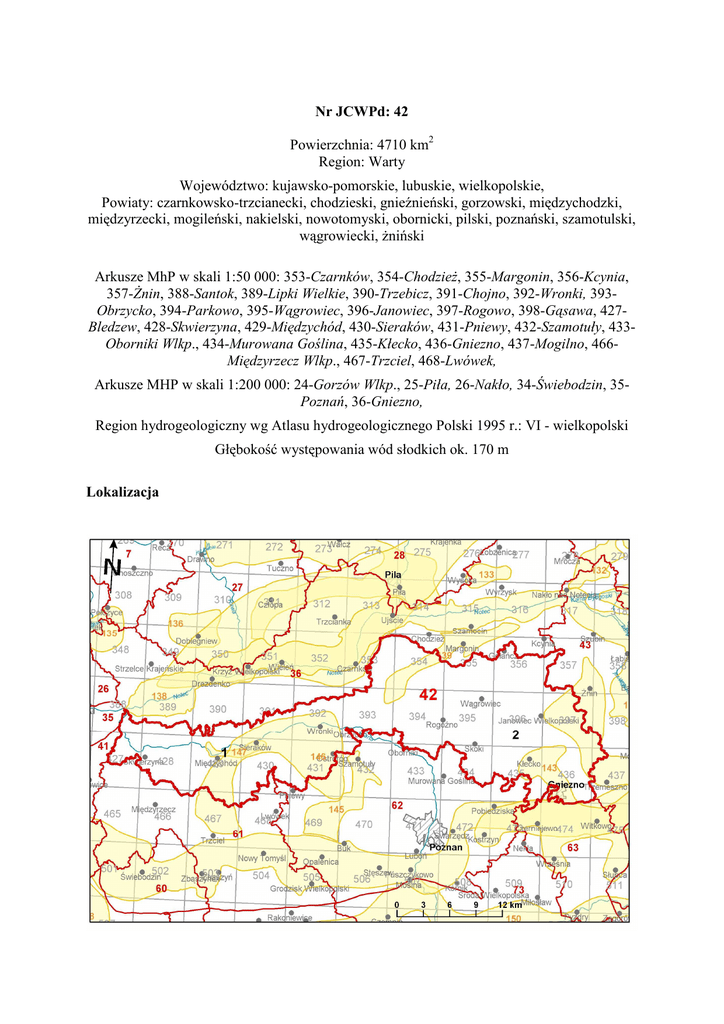Nr JCWPd: 42 Powierzchnia: 4710 km2 Region: Warty Województwo: kujawsko-pomorskie, lubuskie, wielkopolskie, Powiaty: czarnkowsko-trzcianecki, chodzieski, gnieźnieński, gorzowski, międzychodzki, międzyrzecki, mogileński, nakielski, nowotomyski, obornicki, pilski, poznański, szamotulski, wągrowiecki, Ŝniński Arkusze MhP w skali 1:50 000: 353-Czarnków, 354-ChodzieŜ, 355-Margonin, 356-Kcynia, 357-śnin, 388-Santok, 389-Lipki Wielkie, 390-Trzebicz, 391-Chojno, 392-Wronki, 393Obrzycko, 394-Parkowo, 395-Wągrowiec, 396-Janowiec, 397-Rogowo, 398-Gąsawa, 427Bledzew, 428-Skwierzyna, 429-Międzychód, 430-Sieraków, 431-Pniewy, 432-Szamotuły, 433Oborniki Wlkp., 434-Murowana Goślina, 435-Kłecko, 436-Gniezno, 437-Mogilno, 466Międzyrzecz Wlkp., 467-Trzciel, 468-Lwówek, Arkusze MHP w skali 1:200 000: 24-Gorzów Wlkp., 25-Piła, 26-Nakło, 34-Świebodzin, 35Poznań, 36-Gniezno, Region hydrogeologiczny wg Atlasu hydrogeologicznego Polski 1995 r.: VI - wielkopolski Głębokość występowania wód słodkich ok. 170 m Lokalizacja Profile m n.p.m. 1 2 100 Q Q 0 M M Cr -100 - warstwy wodonośne - warstwy słabo przepuszczalne Symbol całej JCWPd uwzględniający wszystkie profile: Q(1-2), M Opis symbolu: W utworach czwartorzędowych występują jeden lub dwa poziomy wodonośne. Poziom mioceński występuje na całym obszarze, dobrze izolowany, pozbawiony kontaktów hydraulicznych z poziomem czwartorzędowym. Q – wody porowe w utworach piaszczystych M - wody porowe w utworach piaszczystych Cecha szczególna JCWPd: brak GZWP występujące w obrębie JCWPd: 137- Qp, 139 - Qk, 143 - Tr, 146 - Tr, 147- Qd,