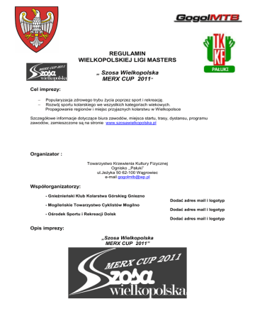 REGULAMIN WIELKOPOLSKIEJ LIGI MASTERS „ Szosa Wielkopolska MERX CUP 2011” Cel imprezy: − − Popularyzacja zdrowego trybu Ŝycia poprzez sport i rekreację. Rozwój sportu kolarskiego we wszystkich kategoriach wiekowych. Propagowanie regionów i miejsc przyjaznych kolarstwu w Wielkopolsce Szczegółowe informacje dotyczące biura zawodów, miejsca startu, trasy, dystansu, programu zawodów, zamieszczone są na stronie www.szosawielkopolska.pl Organizator : Towarzystwo Krzewienia Kultury Fizycznej Ognisko ,,Pałuki” ul.JeŜyka 50 62-100 Wągrowiec e-mail [email protected] Współorganizatorzy: - Gnieźnieński Klub Kolarstwa Górskieg Gniezno Dodać adres mail i logotyp - Mogileńskie Towarzystwo Cyklistów Mogilno Dodać adres mail i logotyp - Ośrodek Sportu i Rekreacji Dolsk Dodać adres mail i logotyp Opis imprezy: „Szosa Wielkopolska MERX CUP 2011” jest imprezą otwartą, składającą się z wyścigów szosowych organizowanych w następujących miejscowościach: -15.05.2011 Gniezno org. GKKG Gniezno -26.06.2011 -17.07.2011 Dolsk Mogilno org. UM i G Dolsk org: MTC Mogilno, UM w Mogilnie -18.09.2011 Wągrowiec org. UMiG Wągrowiec Powiat Wągrowiecki UCZESTNICTWO - w wyścigu mogą brać udział zawodnicy zrzeszeni i nie zrzeszeni. – warunkiem uczestnictwa waŜne badania lekarskie lub start na własną odpowiedzialność po podpisaniu stosownego oświadczenia/karty zgłoszeniowej - sprawny rower i kask oraz ubezpieczenie NW i OC - uiszczenie odpowiedniej opłaty startowej W sytuacji osób niepełnoletnich kartę zgłoszenia wypełnia opiekun prawny. Kategorie Wiekowe: - junior -Elita -Masters I -Masters II -Masters III -Masters IV 1993 1992 1980 1970 1960 1950 - Kobiety ( open) 1993 MęŜczyźni i młodsi 1981 1971 1961 1951 i starsi Kobiety i młodsze Godziny startów: Biuro Zawodów Start Ogłoszenie wyników wstępnych Dekoracja i zakończenie imprezy godz. 11.00 13.00 15.00 15.45 Wyniki wstępne wyścigu będą wywieszane na tablicy ogłoszeń w biurze imprezy. Wszelkie reklamacje dotyczące wyników moŜna zgłaszać do Sędziego Głównego do godz. 15.15. Po upływie tego czasu reklamacje nie będą uwzględniane Sposób przeprowadzenia poszczególnych wyścigów: - dystans wyścigu wynosi ok. 70km dla wszystkich kategorii wiekowych - wyścig odbywa się z jednego startu wspólnego OPEN dla wszystkich kategorii wiekowych - wyścig odbędzie się przy ruchu częściowo ograniczonym - zawodnik, który odpadnie od grupy zasadniczej (peleton) musi jechać prawą stroną drogi i zgodnie z przepisami ruch drogowego - zawodników obowiązują przepisy ruchu drogowego tzn. nie przekraczanie osi jezdni nawet w sytuacji jazdy w peletonie. - jeŜeli wyścig odbywa się na rundach zawodnik zdublowany kończy wyścig na rundzie na której linię mety przekroczył zwycięzca wyścigu OPEN -Zawodnik zobowiązany jest do startu z oryginalnymi numerami startowymi wydanym przez organizatorów na cały cykl. -Numery startowe naleŜy zamocować na tyłach koszulki tak, aby były czytelne dla sędziów. -W wypadku zapomnienia, zagubienia lub zniszczenia numeru zawodnik jest zobowiązany wykupić duplikat numeru od organizatora . -Za zniszczenie rozumie się równieŜ pozbawienie numeru kolorowych krawędzi poprzez przycięcie . Koszt duplikatu wynosi 10 zł Nagrody: Edycje: Wyścig odbywa się w kategorii OPEN oraz w poszczególnych kategoriach wiekowych. - kat.OPEN Puchary miejsca od 1 do 10 - poszczególne kategorie wiekowe Puchary miejsca 1 – 3 Klasyfikacja Generalna: Kategoria OPEN : Puchary miejsca 1-10 - poszczególne kategorie wiekowe Puchary miejsc 1-6 Zasady punktowania: Zawodnicy zdobywają punkty za zajęte miejsce w wyścigu OPEN wg poniŜszej tabeli. miejsce 1 2 3 4 5 6 7 8 9 10 11 12 13 14 15 16 17 18 19 20 21 22 23 24 25 26 27 28 29 30 31 32 33 34 35 36 37 38 39 40 pkt miejsce 300 292 284 279 274 269 266 263 260 257 254 251 248 245 242 239 236 233 230 227 225 223 221 219 217 215 213 211 209 207 205 203 201 199 197 195 193 191 189 187 41 42 43 44 45 46 47 48 49 50 51 52 53 54 55 56 57 58 59 60 61 62 63 64 65 66 67 68 69 70 71 72 73 74 75 76 77 78 79 80 pkt miejsce 185 183 181 179 177 175 173 171 169 167 165 163 161 159 157 155 153 151 149 147 145 143 141 139 137 135 133 131 129 127 125 123 121 119 117 115 113 111 109 107 81 82 83 84 85 86 87 88 89 90 91 92 93 94 95 96 97 98 99 100 101 102 103 104 105 106 107 108 109 110 111 112 113 114 115 116 117 118 119 120 pkt miejsce pkt 105 103 101 99 97 95 93 91 89 87 85 83 81 79 77 75 73 71 69 67 65 63 62 61 60 59 58 57 56 55 54 53 52 51 50 49 48 47 46 45 121 122 123 124 125 126 127 128 129 130 131 132 133 134 135 136 137 138 139 140 141 142 143 144 145 146 147 148 149 150 151 152 153 154 155 156 157 158 159 160 44 43 42 41 40 39 38 37 36 35 34 33 32 31 30 29 28 27 26 25 24 23 22 21 20 19 18 17 16 15 14 13 12 11 10 9 8 7 6 5 - Punkty zdobywane w danych kategoriach zaliczane są wg punktacji OPEN - JeŜeli w poszczególnych kategoriach wiekowych sklasyfikowanych zostanie więcej niŜ 60 zawodników punkty w kategoriach będą naliczane wg tabeli w odniesieniu do tych kategorii wiekowych - Do klasyfikacji generalnej zaliczone zostaną 3 najlepsze starty. - Za kaŜde zajęte miejsca powyŜej 160 przyznawane jest 5 pkt. - W sytuacji, gdy zawodnicy mają taką samą ilość punktów decyduje miejsce zajęte na ostatniej edycji pucharu, która odbędzie się 18 -09-2011 w Wągrowcu. Finanse: Opłata startowa : 40,00 od edycji Postanowienia końcowe: - kaŜdy zawodnik powinien być ubezpieczony i startuje na własną odpowiedzialność - podczas wyścigu do pomiaru czasu zostaną wykorzystane chipy elektroniczne, - podczas wyścigu obowiązują kaski - organizator nie ponosi odpowiedzialności za wypadki na trasie wyścigu oraz za rzeczy zaginione w trakcie imprezy - organizator zastrzega sobie prawo do interpretacji niniejszego regulaminu w porozumieniu z Sędzią Głównym wyścigu W sytuacjach nieopisanych w danym regulaminie decyduj