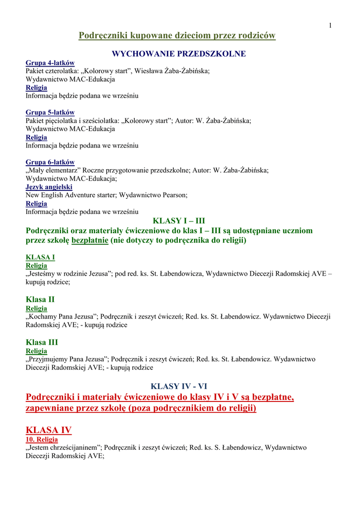 1 Podręczniki kupowane dzieciom przez rodziców WYCHOWANIE PRZEDSZKOLNE Grupa 4-latków Pakiet czterolatka: „Kolorowy start”, Wiesława Żaba-Żabińska; Wydawnictwo MAC-Edukacja Religia Informacja będzie podana we wrześniu Grupa 5-latków Pakiet pięciolatka i sześciolatka: „Kolorowy start”; Autor: W. Żaba-Żabińska; Wydawnictwo MAC-Edukacja Religia Informacja będzie podana we wrześniu Grupa 6-latków „Mały elementarz” Roczne przygotowanie przedszkolne; Autor: W. Żaba-Żabińska; Wydawnictwo MAC-Edukacja; Język angielski New English Adventure starter; Wydawnictwo Pearson; Religia Informacja będzie podana we wrześniu KLASY I – III Podręczniki oraz materiały ćwiczeniowe do klas I – III są udostępniane uczniom przez szkołę bezpłatnie (nie dotyczy to podręcznika do religii) KLASA I Religia „Jesteśmy w rodzinie Jezusa”; pod red. ks. St. Łabendowicza, Wydawnictwo Diecezji Radomskiej AVE – kupują rodzice; Klasa II Religia „Kochamy Pana Jezusa”; Podręcznik i zeszyt ćwiczeń; Red. ks. St. Łabendowicz. Wydawnictwo Diecezji Radomskiej AVE; - kupują rodzice Klasa III Religia „Przyjmujemy Pana Jezusa”; Podręcznik i zeszyt ćwiczeń; Red. ks. St. Łabendowicz. Wydawnictwo Diecezji Radomskiej AVE; - kupują rodzice KLASY IV - VI Podręczniki i materiały ćwiczeniowe do klasy IV i V są bezpłatne, zapewniane przez szkołę (poza podręcznikiem do religii) KLASA IV 10. Religia „Jestem chrześcijaninem”; Podręcznik i zeszyt ćwiczeń; Red. ks. S. Łabendowicz, Wydawnictwo Diecezji Radomskiej AVE; 2 KLASA V Religia „Wierzę w Boga”; Podręcznik i zeszyt ćwiczeń; Red. ks. S. Łabendowicz, Wydawnictwo Diecezji Radomskiej AVE; Klasa VI 1. Język polski „Teraz polski” Podręcznik do kształcenia literackiego, kulturowego i językowego dla klasy 6, Autor: A.Klimowicz; „Teraz polski” – zeszyt ćwiczeń; Wydawnictwo: Nowa Era 2. Matematyka Matematyka z kluczem. Podręcznik. Autorzy: M.Braun, A.Mańskowski, M.Paczyńska; Nowa Era; Matematyka z Kluczem - Zbiór zadań kl. VI. Autorzy: K.Gałązka, H.Jakubowska; 3. Przyroda „Tajemnice przyrody” Podręcznik do przyrody dla klasy 6. Autorzy: J.Stawarz, F.Szlajfer, H.Kowalczyk;; „Tajemnice przyrody” – zeszyt ćwiczeń; Wydawnictwo: Nowa Era; 4.Zajęcia komputerowe Kontynuacja podręcznika 5.Zajęcia techniczne Kontynuacja podręcznika 6.Język angielski Discover English - 2 – podręcznik i zeszyt ćwiczeń; Autorzy: J. Wildman, I. Hearn; Wyd. Pearson; 7.Historia Wczoraj i dziś; Podręcznik dla klasy VI; Autor: Grzegorz Wojciechowski, Zeszyt ćwiczeń cz.1 i cz.2 (T.Maćkowski) Wydawnictwo: Nowa Era; 8.Religia „Wierzę w Kościół” red. Ks. S.Łabendowicz, Wydawnictwo Diecezji Radomskiej AVE; 9.Muzyka Kontynuacja podręcznika; 10.Plastyka Kontynuacja podręcznika