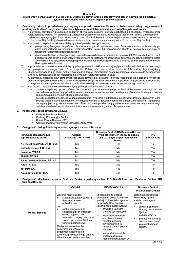 Komunikat dla Klientów korzystających z usług Banku w zakresie przyjmowania i przekazywania zleceń nabycia lub odkupienia tytułów uczestnictwa w instytucjach wspólnego inwestowania 1. 2. Dokumenty, których przedłożenie jest wymagane przed zawarciem Umowy o świadczenie usług przyjmowania i przekazywania zleceń nabycia lub odkupienia tytułów uczestnictwa w instytucjach wspólnego inwestowania: 1) w przypadku rezydentów pełnoletnich będących obywatelami polskimi - dowodu osobistego lub paszportu, wydanego przez Rzeczpospolitą Polską. W przypadku przedłożenia paszportu lub braku w dowodzie osobistym adresu zamieszkania – dodatkowo wymagany jest inny, akceptowany przez Bank dokument, potwierdzający adres zamieszkania na terytorium Rzeczypospolitej Polskiej lub oświadczenie klienta o miejscu zamieszkania na terytorium Rzeczypospolitej Polskiej; 2) w przypadku rezydentów pełnoletnich będących obywatelami obcych państw: • paszportu wydanego przez państwo obce wraz z innym, akceptowanym przez Bank dokumentem, potwierdzającym adres zamieszkania na terytorium Rzeczypospolitej Polskiej lub oświadczenie klienta o miejscu zamieszkania na terytorium Rzeczypospolitej Polskiej albo • dowodu osobistego wydanego w kraju pochodzenia (wyłącznie w odniesieniu do obywateli Państw, dla których Bank posiada wzorce takich dokumentów) wraz z innym akceptowanym przez Bank dokumentem potwierdzającym adres zamieszkania na terytorium Rzeczypospolitej Polskiej lub oświadczenie klienta o miejscu zamieszkania na terytorium Rzeczypospolitej Polskiej; 3) w przypadku rezydentów małoletnich będących obywatelami polskimi – ważnej legitymacji szkolnej lub dowodu osobistego lub paszportu wydanego przez Rzeczpospolitą Polską lub odpisu aktu urodzenia lub ważnej legitymacji/karty ubezpieczeniowej. W przypadku braku w dokumencie adresu zamieszkania osoba zawierająca Umowę składa oświadczenie o miejscu zamieszkania osoby małoletniej na terytorium Rzeczypospolitej Polskiej; 4) w przypadku nierezydentów pełnoletnich będących obywatelami polskimi – dowodu osobistego lub paszportu, wydanego przez Rzeczpospolitą Polską wraz z innym, akceptowanym przez Bank dokumentem, potwierdzającym adres zamieszkania na terytorium obcego państwa lub oświadczenie klienta o miejscu zamieszkania na terytorium obcego państwa; 5) w przypadku nierezydentów pełnoletnich będących obywatelami obcych państw: • paszportu wydanego przez państwo obce wraz z innym akceptowanym przez Bank dokumentem, wydanym w kraju pochodzenia potwierdzającym adres zamieszkania na terytorium obcego państwa lub oświadczenie klienta o miejscu zamieszkania na terytorium obcego państwa albo • dowodu osobistego wydanego w kraju pochodzenia (wyłącznie w odniesieniu do obywateli Państw, dla których Bank posiada wzorce takich dokumentów). W przypadku braku w dowodzie osobistym adresu zamieszkania – dodatkowo wymagany jest inny, akceptowany przez Bank dokument potwierdzający adres zamieszkania na terytorium obcego państwa lub oświadczenie klienta o miejscu zamieszkania na terytorium obcego państwa. Kanały Dostępu do zawierania Umowy: 3. Oddziały Detaliczne Banku, Oddziały Korporacyjne Banku, Centra Private Banking (CPB), Centrum Inwestycyjne Wealth Management (CIWM). Dostępność obsługi Funduszy w poszczególnych Kanałach Dostępu: NN Investment Partners TFI S.A. Tak Business Centre/ ING BusinessOnLine (tylko dla klientów, którzy posiadają już j.u. nabyte za pośrednictwem Banku) Tak Union Investment TFI S.A. Tak Nie Tak Investors TFI S.A. Tak Nie Tak Fundusze zarządzane lub reprezentowane przez: 4. Oddział Detaliczny/ CPB/ CIWM ING BankOnLine Tak MetLife TFI S.A. Tak Nie Tak Aviva Investors Poland TFI S.A. Tak Nie Tak Altus TFI S.A. Tak Nie Tak TFI PZU S.A. Tak Nie Tak Amundi Polska TFI S.A. Tak Nie Tak Dostępność składania zleceń w Oddziale Banku, z wykorzystaniem ING BankOnLine oraz Business Centre/ ING BusinessOnLine. Rodzaj zlecenia Oddział ING BankOnLine Business Centre/ ING BusinessOnLine Zlecenia może składać: • Klient Banku, który zawarł z Bankiem Umowę pośrednictwa, oraz • osoba uprawniona do składania zleceń w ramach danego rejestru pod warunkiem, że jego właściciel zawarł uprzednio z Bankiem Umowę pośrednictwa. Osoby małoletnie i osoby całkowicie lub częściowo pozbawione zdolności do czynności prawnych mogą składać zlecenia w zakresie uprawnień Zlecenia może składać pełnoletnia osoba fizyczna o pełnej zdolności do czynności prawnych, która spełnia łącznie następujące warunki: • zawarła z Bankiem Umowę pośrednictwa, Zlecenia może składać Klient, który łącznie spełnia następujące warunki: • zawarł z Bankiem Umowę pośrednictwa i jest już posiadaczem j.u. • posiada uprawnienia do składania zleceń w ramach danego rejestru • jest właścicielem lub współwłaścicielem rejestru funduszy inwestycyjnych, w ramach których składa zlecenie, • jest właścicielem lub współwłaścicielem rachunku bankowego, w Str. 1 / 6 nadanych im przez ich przedstawicieli ustawowych. ramach którego zawarta umowę ING BankOnLine Zlecenia nie może składać tzw. osoba amerykańska. • Odwołanie Dyspozycji Regularnego Inwestowania może złożyć każda osoba uprawniona do rachunku płatnika, wskazanego w tej dyspozycji Pierwsze przystąpienie do funduszy danego TFI dopuszczalne jest wyłącznie dla ww. Klientów Banku identyfikowanych w Kartotece Klienta Indywidualnego numerem PESEL Otwarcie nowego numeru uczestnika* TAK TAK Otwarcie nowego rejestru* TAK TAK --- Nabycie j.u. TAK TAK TAK Odkupienie j.u. TAK TAK TAK Konwersja/ Zamiana j.u. TAK TAK TAK Ustanowieni oraz odwołanie Dyspozycji Regularnego Inwestowania TAK TAK --- Zawarcie Umowy Pakietu Fundusz z Lokatą TAK TAK Zmiana danych (uczestnika/ pełnomocnika / reprezentanta / przedstawiciela ustawowego) TAK --- TAK Dodanie / zmiana rachunku bankowego do odkupie