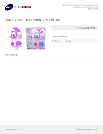 Sklep dziecięcy Smykuś Remigiusz Kaczmarek ul. Nowotoruńska 12, Bydgoszcz 52 362 02 63 SMOBY 589-7696 salon SPA Chi Chi Cena: 222,00 PLN Opis słownikowy Producent Smoby Opis produktu Plik wygenerowano: 08-03-2017 Powered by TCPDF (www.tcpdf.org) Oprogramowanie sklepu: AptusShop