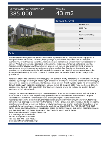 MIESZKANIE na SPRZEDAŻ 385 000 Wisełka 43 m2 834/2147/OMS 385 000 PLN 8 953 PLN 43 ApartmentBuilding 2008 1 1 2 Opis Przedmiotem oferty jest luksusowy apartament o powierzchni 43 m2 położony na I piętrze, w odległości 9 km od kurortu jakim są Międzyzdroje. Apartament posiada salon z aneksem kuchennym, sypialnię oraz łazienkę. Apartament jest kompletnie umeblowany i wyposażony w sprzęty AGD. Bardzo wysoki standard wykończenia, miejsce parkingowe na terenie obiektu. Apartament klimatyzowany! Największym atutem jest taras o powierzchni 30 m2 oraz samo usytuowanie kompleksu apartamentowego, cisza, spokój, las. Apartament znajduję się na strzeżonym, zamkniętym osiedlu. W kompleksie znajduję się również podgrzewany basen dla dorosłych jak i osobny dla dzieci, sauna, 2 pralnie, plac zabaw dla dzieci, leżaki i miejsce do grillowania. Powyższa oferta ma charakter informacyjny i nie stanowi oferty handlowej w rozumieniu art. 66 §1 kodeksu cywilnego oraz innych właściwych przepisów prawnych. Treść ma charakter informacyjny i zalecamy jej osobistą weryfikację. Kontaktując się z biurem Klient wyraża zgodę na przetwarzanie danych osobowych zgodnie z przepisami ustawy z dnia 29 sierpnia 1997 roku o ochronie danych osobowych / Dz.U.Nr. 133 poz. 883/. Klientowi przysługuje prawo do wglądu do swoich danych osobowych i ich aktualizacji. Kierując się zasadami Kodeksu etyki zawodowej oraz Standardami zawodowymi pośredników w obrocie nieruchomościami, zapewniamy pośrednictwo w obrocie nieruchomościami - kupno, sprzedaż oraz wynajem - we współpracy z profesjonalnymi, licencjonowanymi i wyselekcjonowanymi biurami nieruchomości działającymi w Systemie Wymiany Ofert, fachową i kompleksową obsługę realizowanych transakcji w miłej i przyjaznej atmosferze, a także oferujemy bezpłatne doradztwo w zakresie doboru kredytu hipotecznego, analizy zdolności kredytowej oraz wszelkich formalności w uzyskaniu kredytu spośród banków PEKAO SA, PKO BP, BZ WBK, BGŻ, GETIN BANK, CREDIT AGRICOLE, MILLENIUM BANK, GE MONEY BANK, ING BANK, DEUTSCHE BANK, BNP PARIBAS, KREDYT BANK, BPH BANK, SANTANDER BANK, ALIOR BANK. Świat Nieruchomości Krystyna Skworcow ul. Chrobrego 5a (Starówka) 73-110 Stargard Szczeciński Tel: 500 296 440 , 915780827 [email protected] Świat Nieruchomości Krystyna Skworcow sp-ka z o.o. mgr Malwina Nawrotowicz tel. 666 550 369 tel. 91 578 0827 email: [email protected] Świat Nieruchomości Krystyna Skworcow sp-ka z o.o. Powered by TCPDF (www.tcpdf.org)