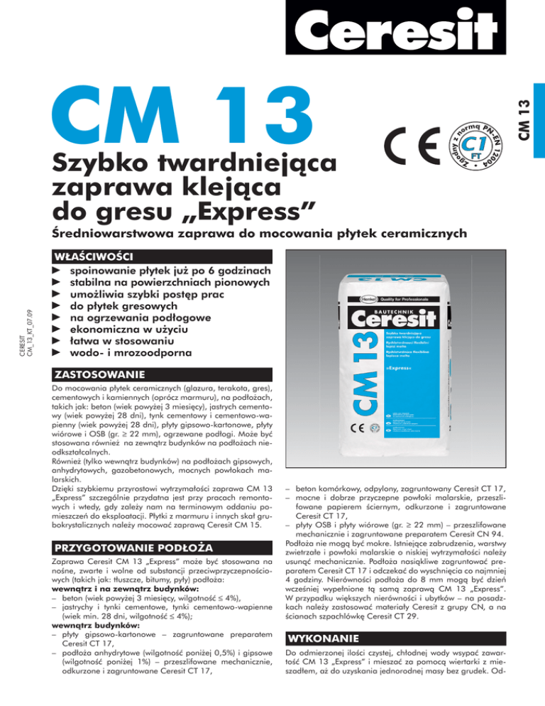 Szybko twardniejąca zaprawa klejąca do gresu „Express” CERESIT CM_13_KT_07.09 Średniowarstwowa zaprawa do mocowania płytek ceramicznych WŁAŚCIWOŚCI spoinowanie płytek już po 6 godzinach stabilna na powierzchniach pionowych umożliwia szybki postęp prac do płytek gresowych na ogrzewania podłogowe ekonomiczna w użyciu łatwa w stosowaniu wodo- i mrozoodporna ZASTOSOWANIE Do mocowania płytek ceramicznych (glazura, terakota, gres), cementowych i kamiennych (oprócz marmuru), na podłożach, takich jak: beton (wiek powyżej 3 miesięcy), jastrych cementowy (wiek powyżej 28 dni), tynk cementowy i cementowo-wapienny (wiek powyżej 28 dni), płyty gipsowo-kartonowe, płyty wiórowe i OSB (gr. ³ 22 mm), ogrzewane podłogi. Może być stosowana również na zewnątrz budynków na podłożach nieodkształcalnych. Również (tylko wewnątrz budynków) na podłożach gipsowych, anhydrytowych, gazobetonowych, mocnych powłokach malarskich. Dzięki szybkiemu przyrostowi wytrzymałości zaprawa CM 13 „Express” szczególnie przydatna jest przy pracach remontowych i wtedy, gdy zależy nam na terminowym oddaniu pomieszczeń do eksploatacji. Płytki z marmuru i innych skał grubokrystalicznych należy mocować zaprawą Ceresit CM 15. PRZYGOTOWANIE PODŁOŻA Zaprawa Ceresit CM 13 „Express” może być stosowana na nośne, zwarte i wolne od substancji przeciwprzyczepnościowych (takich jak: tłuszcze, bitumy, pyły) podłoża: wewnątrz i na zewnątrz budynków: – beton (wiek powyżej 3 miesięcy, wilgotność £ 4%), – jastrychy i tynki cementowe, tynki cementowo-wapienne (wiek min. 28 dni, wilgotność £ 4%); wewnątrz budynków: – płyty gipsowo-kartonowe – zagruntowane preparatem Ceresit CT 17, – podłoża anhydrytowe (wilgotność poniżej 0,5%) i gipsowe (wilgotność poniżej 1%) – przeszlifowane mechanicznie, odkurzone i zagruntowane Ceresit CT 17, – beton komórkowy, odpylony, zagruntowany Ceresit CT 17, – mocne i dobrze przyczepne powłoki malarskie, przeszlifowane papierem ściernym, odkurzone i zagruntowane Ceresit CT 17, – płyty OSB i płyty wiórowe (gr. ³ 22 mm) – przeszlifowane mechanicznie i zagruntowane preparatem Ceresit CN 94. Podłoża nie mogą być mokre. Istniejące zabrudzenia, warstwy zwietrzałe i powłoki malarskie o niskiej wytrzymałości należy usunąć mechanicznie. Podłoża nasiąkliwe zagruntować preparatem Ceresit CT 17 i odczekać do wyschnięcia co najmniej 4 godziny. Nierówności podłoża do 8 mm mogą być dzień wcześniej wypełnione tą samą zaprawą CM 13 „Express”. W przypadku większych nierówności i ubytków – na posadzkach należy zastosować materiały Ceresit z grupy CN, a na ścianach szpachlówkę Ceresit CT 29. WYKONANIE Do odmierzonej ilości czystej, chłodnej wody wsypać zawartość CM 13 „Express” i mieszać za pomocą wiertarki z mieszadłem, aż do uzyskania jednorodnej masy bez grudek. Od- CM 13 CM 13 UWAGA Prace należy wykonywać w suchych warunkach, przy temperaturze powietrza i podłoża od +5°C do +25°C. Wszelkie dane odnoszą się do temperatury +23°C i wilgotności względnej powietrza 50%. W innych warunkach należy uwzględnić szybsze lub wolniejsze twardnienie materiału. CM 13 „Express” zawiera cement i po zmieszaniu z wodą ma odczyn alkaliczny. W związku z tym należy chronić naskórek i oczy. W przypadku kontaktu materiału z oczami, płukać je obficie wodą i zasięgnąć porady lekarza. Zawartość chromu VI – poniżej 2 ppm w okresie ważności wyrobu. ZALECENIA Niniejsza karta techniczna określa zakres stosowania materiału i zalecany sposób prowadzenia robót, ale nie może zastąpić zawodowego przygotowania wykonawcy. Oprócz podanych zaleceń, prace należy wykonywać zgodnie ze sztuką budowlaną i zasadami BHP. Producent gwarantuje jakość wyrobu, natomiast nie ma wpływu na warunki i sposób jego użycia. W przypadku wątpliwości należy wykonać własne próby stosowania. Wraz z ukazaniem się tej karty technicznej tracą ważność karty wcześniejsze. DANE TECHNICZNE Baza: mieszanka cementów z wypełniaczami mineralnymi i modyfikatorami Gęstość nasypowa: ok. 1,35 kg/dm3 Proporcje mieszania: 7,5÷9 l wody Temperatura stosowania: od +5°C do +25°C Czas wstępnego dojrzewania: ok. 5 min Czas zużycia: do 30 min Czas otwarty (wg normy PN-EN 12004:2002): przyczepność ³ 0,5 MPa po czasie nie krótszym niż 10 min Spływ (wg normy PN-EN 12004:2002): £ 0,5 mm Spoinowanie: po 6 godz. Przyczepność wg PN-EN 12004:2002 - początkowa: ³ 0,5 MPa ³ 0,5 MPa - po zanurzeniu w wodzie: ³ 0,5 MPa - po starzeniu termicznym: - po cyklach zamrażania ³ 0,5 MPa i rozmrażania: Odporność na temperaturę: od -30°C do +70°C Orientacyjne zużycie (dotyczy równego podłoża, w zależności od równości podłoża i rodzaju płytek zużycie może ulec zmianie): płytki o boku do 10 cm wymiar zębów pacy 4 mm ilość CM 13 „Express” [kg/m2] 2,4 do 15 cm do 25 cm do 30 cm powyżej 30 cm 6 mm 8 mm 10 mm 12 mm 3,0 3,6 4,2 4,8 Wyrób zgodny z normą PN-EN 12004:2008. SKŁADOWANIE Do 12 miesięcy od daty produkcji, przy składowaniu na paletach, w suchych warunkach i w oryginalnych, nieuszkodzonych opakowaniach. OPAKOWANIA Worki 25 kg. Henkel Polska Sp. z o.o. ul. Domaniewska 41, 02-672 Warszawa Centralny Dział Obsługi Klienta: Tel. (+48 41) 371-01-00 • Fax (+48 41) 374-22-22 www.ceresit.pl • infolinia 0-800-120-241 Buduj korzystając z profesjonalnych rozwiązań. CERESIT CM_13_KT_07.09 CM 13 czekać 5 min i jeszcze raz wymieszać. Jeśli potrzeba – dodać niewielką ilość wody i ponownie zamieszać. Zaprawę rozprowadzać po podłożu pacą o odpowiedniej wielkości zębów lub w przypadku większych grubości przy użyciu kielni. Gdy płytki narażone będą na zawilgocenie i mróz oraz gdy grubość zaprawy pod płytką będzie przekraczała 5 mm należy dodatkowo nałożyć cienką warstwę zaprawy na powierzchnie montażowe płytek. N