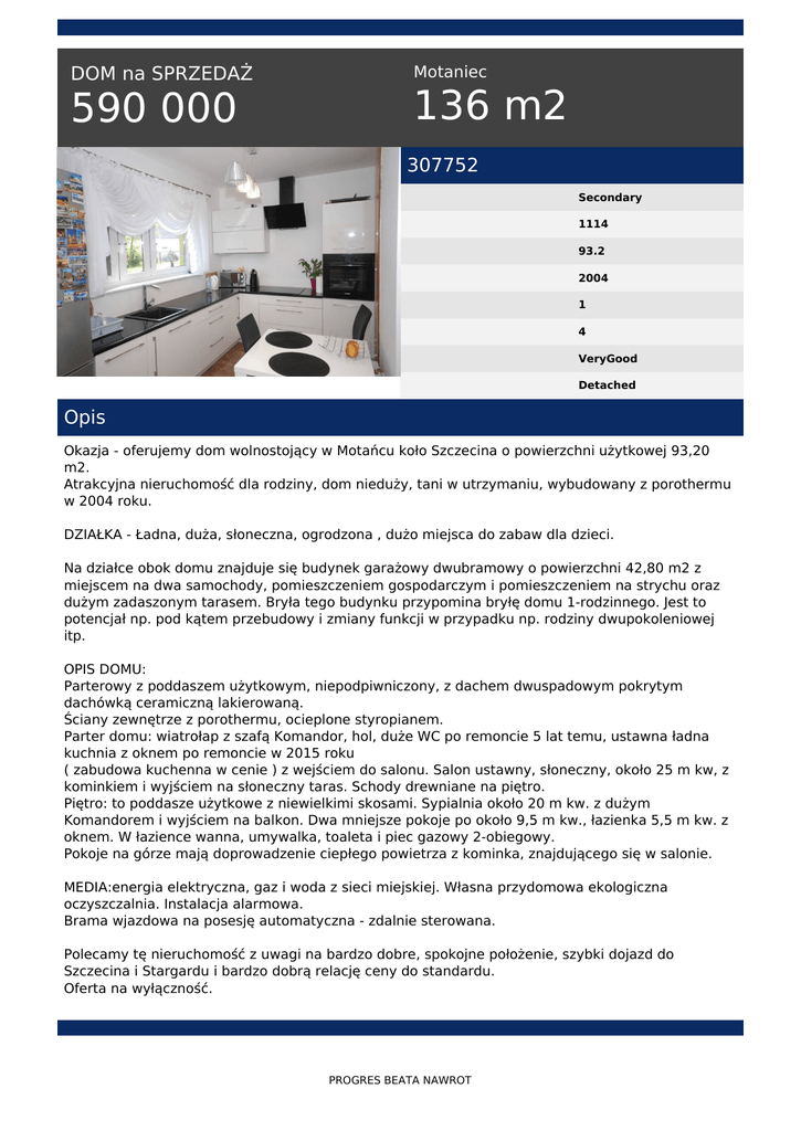 DOM na SPRZEDAŻ 590 000 Motaniec 136 m2 307752 Secondary 1114 93.2 2004 1 4 VeryGood Detached Opis Okazja - oferujemy dom wolnostojący w Motańcu koło Szczecina o powierzchni użytkowej 93,20 m2. Atrakcyjna nieruchomość dla rodziny, dom nieduży, tani w utrzymaniu, wybudowany z porothermu w 2004 roku. DZIAŁKA - Ładna, duża, słoneczna, ogrodzona , dużo miejsca do zabaw dla dzieci. Na działce obok domu znajduje się budynek garażowy dwubramowy o powierzchni 42,80 m2 z miejscem na dwa samochody, pomieszczeniem gospodarczym i pomieszczeniem na strychu oraz dużym zadaszonym tarasem. Bryła tego budynku przypomina bryłę domu 1-rodzinnego. Jest to potencjał np. pod kątem przebudowy i zmiany funkcji w przypadku np. rodziny dwupokoleniowej itp. OPIS DOMU: Parterowy z poddaszem użytkowym, niepodpiwniczony, z dachem dwuspadowym pokrytym dachówką ceramiczną lakierowaną. Ściany zewnętrze z porothermu, ocieplone styropianem. Parter domu: wiatrołap z szafą Komandor, hol, duże WC po remoncie 5 lat temu, ustawna ładna kuchnia z oknem po remoncie w 2015 roku ( zabudowa kuchenna w cenie ) z wejściem do salonu. Salon ustawny, słoneczny, około 25 m kw, z kominkiem i wyjściem na słoneczny taras. Schody drewniane na piętro. Piętro: to poddasze użytkowe z niewielkimi skosami. Sypialnia około 20 m kw. z dużym Komandorem i wyjściem na balkon. Dwa mniejsze pokoje po około 9,5 m kw., łazienka 5,5 m kw. z oknem. W łazience wanna, umywalka, toaleta i piec gazowy 2-obiegowy. Pokoje na górze mają doprowadzenie ciepłego powietrza z kominka, znajdującego się w salonie. MEDIA:energia elektryczna, gaz i woda z sieci miejskiej. Własna przydomowa ekologiczna oczyszczalnia. Instalacja alarmowa. Brama wjazdowa na posesję automatyczna - zdalnie sterowana. Polecamy tę nieruchomość z uwagi na bardzo dobre, spokojne położenie, szybki dojazd do Szczecina i Stargardu i bardzo dobrą relację ceny do standardu. Oferta na wyłączność. PROGRES BEATA NAWROT PROGRES BEATA NAWROT tel. 501620628 email: [email protected] PROGRES BEATA NAWROT Powered by TCPDF (www.tcpdf.org)