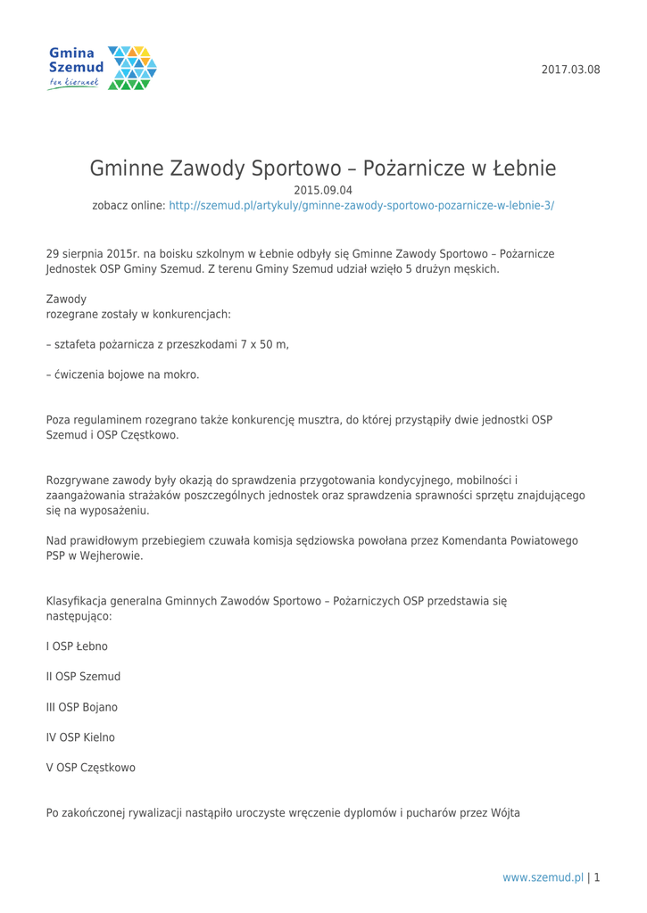 2017.03.08 Gminne Zawody Sportowo – Pożarnicze w Łebnie 2015.09.04 zobacz online: http://szemud.pl/artykuly/gminne-zawody-sportowo-pozarnicze-w-lebnie-3/ 29 sierpnia 2015r. na boisku szkolnym w Łebnie odbyły się Gminne Zawody Sportowo – Pożarnicze Jednostek OSP Gminy Szemud. Z terenu Gminy Szemud udział wzięło 5 drużyn męskich. Zawody rozegrane zostały w konkurencjach: – sztafeta pożarnicza z przeszkodami 7 x 50 m, – ćwiczenia bojowe na mokro. Poza regulaminem rozegrano także konkurencję musztra, do której przystąpiły dwie jednostki OSP Szemud i OSP Częstkowo. Rozgrywane zawody były okazją do sprawdzenia przygotowania kondycyjnego, mobilności i zaangażowania strażaków poszczególnych jednostek oraz sprawdzenia sprawności sprzętu znajdującego się na wyposażeniu. Nad prawidłowym przebiegiem czuwała komisja sędziowska powołana przez Komendanta Powiatowego PSP w Wejherowie. Klasyfikacja generalna Gminnych Zawodów Sportowo – Pożarniczych OSP przedstawia się następująco: I OSP Łebno II OSP Szemud III OSP Bojano IV OSP Kielno V OSP Częstkowo Po zakończonej rywalizacji nastąpiło uroczyste wręczenie dyplomów i pucharów przez Wójta www.szemud.pl | 1 2017.03.08 Gminy Szemud i Prezesa Zarządu Oddziału Gminnego Związku OSP RP w Szemudzie. Zwycięska drużyna OSP Łebno jak i jednostki włączone do Krajowego Systemu Ratowniczo Gaśniczego (OSP Szemud, OSP Kielno i OSP Bojano) wezmą udział w Powiatowych Zawodach Sportowo – Pożarniczych w dniu 12.09.2015r. w Gniewinie. Na zakończenie, uczestników zawodów oraz gości zaproszono na strażacki poczęstunek przygotowany przez Koło Gospodyń Wiejskich w Będargowie. Gratulujemy i życzymy powodzenia w kolejnych etapach zawodów sportowo – pożarniczych! Wszystkim uczestnikom rozgrywek serdecznie dziękujemy za wzięcie udziału w wydarzeniu oraz za poświęcenie jakie włożyliście w to, aby wasze drużyny wypadły jak najlepiej! Podziękowania należą się także wszystkim przybyłym gościom – wasz doping motywował wszystkie drużyny do osiągania jak najlepszych rezultatów. Cała impreza nie odbyłaby się w taki sposób, gdyby nie pomoc sponsorów, którym jeszcze raz serdecznie dziękujemy. Już dziś chcemy powiedzieć wszystkim Wam: do zobaczenia za rok! Mirosława Sikora www.szemud.pl | 2