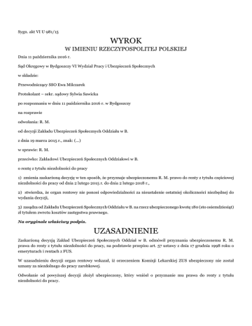 Sygn. akt VI U 981/15 WYROK W IMIENIU RZECZYPOSPOLITEJ POLSKIEJ Dnia 11 października 2016 r. Sąd Okręgowy w Bydgoszczy VI Wydział Pracy i Ubezpieczeń Społecznych w składzie: Przewodniczący SSO Ewa Milczarek Protokolant – sekr. sądowy Sylwia Sawicka po rozpoznaniu w dniu 11 października 2016 r. w Bydgoszczy na rozprawie odwołania: R. M. od decyzji Zakładu Ubezpieczeń Społecznych Oddziału w B. z dnia 19 marca 2015 r., znak: (...) w sprawie: R. M. przeciwko: Zakładowi Ubezpieczeń Społecznych Oddziałowi w B. o rentę z tytułu niezdolności do pracy 1) zmienia zaskarżoną decyzję w ten sposób, że przyznaje ubezpieczonemu R. M. prawo do renty z tytułu częściowej niezdolności do pracy od dnia 2 lutego 2015 r. do dnia 2 lutego 2018 r., 2) stwierdza, że organ rentowy nie ponosi odpowiedzialności za nieustalenie ostatniej okoliczności niezbędnej do wydania decyzji, 3) zasądza od Zakładu Ubezpieczeń Społecznych Oddziału w B. na rzecz ubezpieczonego kwotę 180 (sto osiemdziesiąt) zł tytułem zwrotu kosztów zastępstwa prawnego. Na oryginale właściwy podpis. UZASADNIENIE Zaskarżoną decyzją Zakład Ubezpieczeń Społecznych Oddział w B. odmówił przyznania ubezpieczonemu R. M. prawa do renty z tytułu niezdolności do pracy, na podstawie przepisu art. 57 ustawy z dnia 17 grudnia 1998 roku o emeryturach i rentach z FUS. W uzasadnieniu decyzji organ rentowy wskazał, iż orzeczeniem Komisji Lekarskiej ZUS ubezpieczony nie został uznany za niezdolnego do pracy zarobkowej. Odwołanie od powyższej decyzji złożył ubezpieczony, który wniósł o przyznanie mu prawa do renty z tytułu niezdolności do pracy. W uzasadnieniu odwołania ubezpieczony wskazał, iż aktualny stan jego zdrowia nie pozwala na podjęcie pracy zarobkowej. W odpowiedzi na odwołanie ubezpieczonego, organ rentowy wniósł o jego oddalenie, podtrzymując argumentację zawartą w zaskarżonej decyzji. Sąd Okręgowy ustalił, co następuje: Ubezpieczony R. M. , ostatnio zatrudniony jako mechanik samochodowy, w dniu 15.12. 2014roku złożył w pozwanym organie rentowym wniosek o przyznanie prawa do renty. Ubezpieczony udokumentował wymagany staż ubezpieczeniowy. Do dnia 1.02.2015 r. ubezpieczony pobierał świadczenie rehabilitacyjne. Pozwany organ rentowy poddał go badaniu przez lekarza orzecznika i komisję lekarską ZUS, którzy w wydanych orzeczeniach nie uznali ubezpieczonego za osobę niezdolną do wykonywania pracy zarobkowej. -okoliczności bezsporne W celu zweryfikowania powyższych orzeczeń Sąd powołał biegłych lekarzy sądowych z zakresu następujących specjalności: neurologa i psychiatry. Biegli lekarze sądowi w wydanej opinii w dniu 25.04. 2016 roku rozpoznali u ubezpieczonego następujące schorzenia: 1. Stan po usunięciu dysku C4-C5, C5-C6 i C6-C7 i stabilizacji międzytrzonowej z utrzymującym się zespołem bólowym rwy szyjno ramiennej. 2. Spondyloza lędźwiowa leczona operacyjnie na poziomie L4-L5 i L5-S1 z utrzymującym się przewlekłym zespołem bólowym odcinka L-S. 3. Przewlekła choroba niedokrwienna serca. Stan po przebytym zawale mięśnia sercowego, leczony implantacja stentów. 4. Nadciśnienie tętnicze. 5. Obustronny niedosłuch odbiorczy, głębszy po stronie prawej. 6. Cukrzyca typ II leczona intensywna insulinoterapia, dość dobrze wyrównana. Na podstawie przeprowadzonego badania przedmiotowego, materiału lekarskiego znajdującego się w aktach i wyników badań ubezpieczonego, biegli stwierdzili, że w stanie zdrowia ubezpieczonego, mimo leczenia operacyjnego kręgosłupa, nie nastąpiła istotna poprawa. Nadal utrzymują się znaczne dolegliwości bólowe kręgosłupa szyjnego i L-S. Ponadto ubezpieczony jest leczony z powodu cukrzycy typ II intensywną insulinoterapią z wielokrotnymi wstrzyknięciami w ciągu dnia. Zdaniem biegłych sądowych ubezpieczony R. M. jest częściowo okresowo niezdolny do pracy z powodu schorzeń wymienionych w pkt 1 i 2 rozpoznania a niezdolność do pracy będzie trwać w okresie od 02.02.2015r do 02.02.2018r. W tym czasie, zdaniem biegłych, będzie wymagał leczenia neurologicznego , kardiologicznego i diabetologicznego. -dowód; opinia biegłych k. 17-18 akt sądowych Po zapoznaniu się z wydaną przez biegłych opinią, pozwany organ rentowy wniósł do niej zastrzeżenia, w których wskazał, iż podczas badania przez Komisję Lekarską ZUS, poza brakiem odruchów skokowych, nie stwierdzono innych odchyleń w badaniu neurologicznym. Z badania biegłego neurologa i neurochirurga nie wynika istotnego stopnia upośledzenie funkcji kręgosłupa szyjnego i L-S. W badaniu kręgosłupa C- odległość b-m 1,5 cm, świadczy o dość dobrej ruchomości kręgosłupa szyjnego. Biegli stwierdzili - prawidłową sprawność ruchową kończyn górnych, odruchy równe, czucie niezaburzone, objawy korzeniowe ujemne. Opisywane ograniczenie ruchomości kręgosłupa L-S oraz dodatni objaw Lasegnea mogą występować okresowo, w okresie zaostrzenia schorzenia i nie świadczą o długotrwałym upośledzeniu sprawności. W okresie zaostrzenia schorzenia badany może korzystać ze zwolnień lekarskich od pracy. Osłabienie odruchów z kończyn dolnych oraz opisywane zaburzenia czucia nie są istotne funkcjonalnie. Biegli nie stwierdzili niedowładów, zaników mięśniowych, zaburzeń zwieraczy. Reasumując, brak podstaw do orzekania częściowej niezdolności do pracy z powodu schorzenia kręgosłupa. Biegli dysponowali badaniami MR kręgosłupa L-S z dnia 10.06.2015 r. i rtg kręgosłupa C z dnia 05.10.2015 r. - którymi nie dysponowała Komisja Lekarska ZUS. Obustronny niedosłuch odbiorczy bez socjalnej niewydolności słuchu nie powoduje długotrwałej niezdolności do pracy. Pozwany nie składa zastrzeżeń do opinii specjalisty kardiologa i diabetologa którzy nie stwierdzili niezdolności badanego do pracy zarobkowej. Wobec powyższego organ rentowy wniósł o powołanie dowodu z. opinii uzupełniającej - celem us