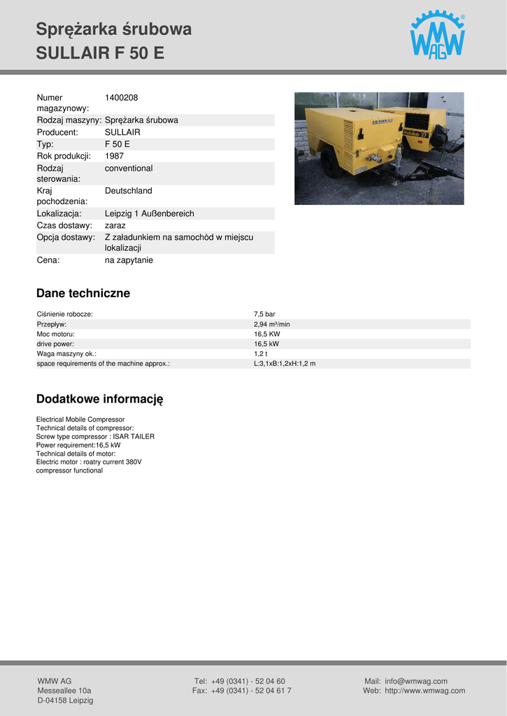 Sprężarka śrubowa SULLAIR F 50 E Numer magazynowy: Rodzaj maszyny: Producent: Typ: Rok produkcji: Rodzaj sterowania: Kraj pochodzenia: Lokalizacja: Czas dostawy: Opcja dostawy: Cena: 1400208 Sprężarka śrubowa SULLAIR F 50 E 1987 conventional Deutschland Leipzig 1 Außenbereich zaraz Z załadunkiem na samochòd w miejscu lokalizacji na zapytanie Dane techniczne Ciśnienie robocze: Przepływ: Moc motoru: drive power: Waga maszyny ok.: space requirements of the machine approx.: 7,5 bar 2,94 m³/min 16,5 KW 16,5 kW 1,2 t L:3,1xB:1,2xH:1,2 m Dodatkowe informację Electrical Mobile Compressor Technical details of compressor: Screw type compressor : ISAR TAILER Power requirement:16,5 kW Technical details of motor: Electric motor : roatry current 380V compressor functional WMW AG Messeallee 10a D-04158 Leipzig Powered by TCPDF (www.tcpdf.org) Tel: +49 (0341) - 52 04 60 Fax: +49 (0341) - 52 04 61 7 Mail: [email protected] Web: http://www.wmwag.com