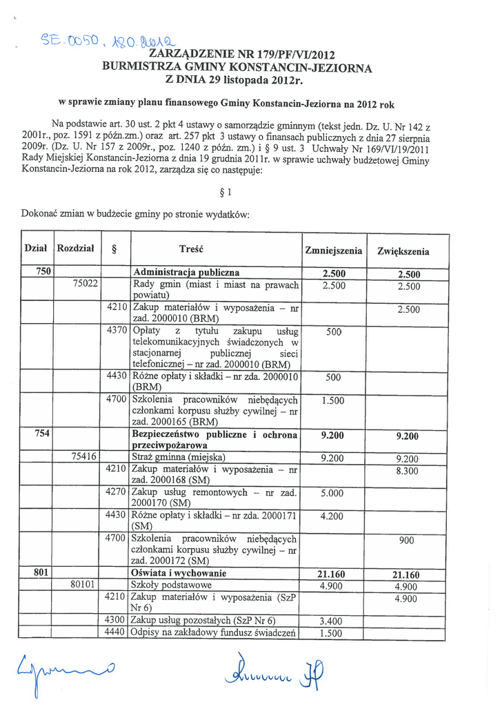 5jO ZARZĄDZENIE NR 179JPF/y112012 BURMISTRZA GMINY KONSTANCIN-JEZIORNA Z DNIA 29 listopada 2012r. w sprawie zmiany planu finansowego Gminy Konstancin-Jeziorna na 2012 rok Na podstawie art. 30 ust. 2 pkt 4 ustawy o samorządzie gminnym (tekst jedn. Dz. U. Nr 142 z 2001r., poz. 1591 z późn.zm.) oraz art. 257 pkt 3 ustawy o finansach publicznych z dnia 27 sierpnia 2009r. (Dz. U. Nr 157 z 2009r., poz. 1240 z późn. zm.) i 9 ust. 3 Uchwały Nr 169/VI/19/2011 Rady Miejskiej Konstancin-Jeziorna z dnia 19 grudnia 2011r. w sprawie uchwały budżetowej Gminy Konstancin-Jeziorna na rok 2012, zarządza się co następuje: Dokonać zmian w budżecie gminy po stronie wydatków: Dział Rozdział Treść 750 75022 4210 4370 Zmniejszenia Administracja publiczna Rady gmin (miast i miast na prawach powiatu) Zakup materiałów i wyposażenia nr zad. 2000010 (BRM) Opłaty z tytułu zakupu usług telekomunikacyjnych świadczonych w stacjonarnej publicznej sieci telefonicznej nr zad. 2000010 (BRM) Różne opłaty i składki nr zda. 2000010 (BRM) Szkolenia pracowników niebędących członkami korpusu służby cywilnej nr zad. 2000165 (BRM) Bezpieczeństwo publiczne i ochrona przeciwpożarowa Straż gmiima (miejska) Zakup materiałów i wyposażenia nr zad. 2000168 (SM) Zakup usług remontowych nr zad. 2000170 (SM) Różne opłaty i składki nr zda. 2000171 (SM) Szkolenia pracowników niebędących członkami korpusu służby cywilnej nr zad. 2000172 (SM) Oświata i wychowanie Szkoły podstawowe Zakup materiałów i wyposażenia (SzP Nr 6) Zakup usług pozostałych (SzP Nr 6) Odpisy na zakładowy fundusz świadczeń 2.500 2.500 Zwiększenia 2.500 2.500 2.500 — 500 — 4430 4700 754 75416 4210 4270 4430 4700 — 500 1.500 9.200 9.200 9.200 9.200 8.300 — — — 5.000 4.200 900 — 801 80101 4210 4300 4440 21.160 4.900 3.400 1.500 21.160 4.900 4.900 socjalnych (SzP Nr 6) Przedszkola 4040 Dodatkowe wynagrodzenie roczne (OP Nr5) 4210 Zakup materiałów i wyposażenia (GP Nr 5) 4240 Zakup pomocy naukowych, dydaktycznych i książek (OP Nr 5) 4260 Zakup energii (OP Nr 5) 4280 Zakup usług zdrowotnych (TP) 4300 Zakup usług pozostałych (TP) 4370 Opłaty z tytułu zakupu usług telekomunikacyjnych świadczonych w ruchomej publicznej sieci telefonicznej (TP) 4410 Podróże służbowe krajowe (OP Nr 5) 4430 Różne opłaty i składki (OP Nr 5) 80148 Stołówki szkolne i przedszkolne 4040 Dodatkowe wynagrodzenie roczne (OP Nr 5) 4210 Zakup materiałów i wyposażenia (OP Nr 5) Gospodarka komunalna i ochrona środowiska 90015 Oświetlenie ulic, placów i dróg 4300 Zakup usług pozostałych, z tego: 80104 900 nr zad. 2000031 (DO) nr zad. 2000254 (DO) Pozostała działalność 4210 Zakup materiałów i wyposażenia nr zad. 2000705 (DO) 4270 Zakup usług remontowych nr zad. 2000257 (DO) 4300 Zakup usług pozostałych, z tego: - - 90095 15.160 3.000 15.160 9.160 5.000 10.000 600 1.000 400 700 460 1.100 1.100 1.100 1.100 6.707 6.707 4.470 4.470 2.770 1.700 2.23 7 6.707 2.400 — 3.000 — nrzad.2000006(DO) nrzad.2000l32(DO) nrzad.2000313(DG) Kultura fizyczna Instytucje kultury fizycznej 4210 Zakup materiałów i wyposażenia (OOSiR) 4300 Zakup usług pozostałych (OOSiR) Razem: 2.237 1.307 1.107 200 — — - 926 92604 2.237 5.900 5.900 5.900 45.467 5.900 5.900 5.900 45.467 Zarządzenie wchodzi w życie z dniem podjęcia i obowiązuje w roku budżetowym 2012. BURMIST mgr Kazimierz Y.t”ńkzuk Uzasadnienie do Zarządzenia Nr 179/PFIVIJ2O12 Burmistrza Gminy Konstancin-Jeziorna z dnia 29 listopada 2012r. w sprawie zmiany planu finansowego Gminy Konstancin-Jeziorna na 2012 rok Zmian w budżecie gminy po stronie wydatków budżetowych w dz. 750-administracja publiczna w rozdz. 75022 między par. klasyfikacji budżetowej w łącznej kwocie 2.500 zł dokonano z uwagi na konieczność zabezpieczenia środków budżetowych na zakup ekspresu do kawy na potrzeby Biura Rady Miejskiej. Ekspres ten będzie wykorzystywany do Obsługi sesji Rady Miejskiej i posiedzeń komisji stałych i doraźnych. Zmian w budżecie gminy po stronie wydatków budżetowych w dz. 754-bezpieczeństwo publiczne i ochrona przeciwpożarowa w rozdz. 75416 miedzy par. klasyfikacji budżetowej w łącznej kwocie 9.200 zł dokonano w związku z koniecznością zwiększenia środków budżetowych za zakup paliwa na potrzeby Straży Miejskiej oraz doposażenia pomieszczeń monitoringu i fotoradaru w niezbędny sprzęt (drukarka, niszczarka dokumentów, mała lodówka, monitory LCD). Zmian w budżecie gminy po stronie wydatków budżetowych w dz. 801 w rozdz. 80104 i 80148 w łącznej kwocie 4.100 zł dokonano na podstawie Zarządzenia Nr 178/VI/2012 Burmistrza gminy Konstancin-Jeziorna z dnia 29 listopada 2012r. w sprawie zmian w budżecie gminy na rok 2012. Natomiast pozostałe zmiany w rozdz. 80101 i 80104 w łącznej kwocie 15.960 zł między par. klasyfikacji budżetowej dokonane zostały na wniosek placówek oświatowych gminy: Szkoły Podstawowej Nr 6 w Opaczy, Tęczowego Przedszkola i Gminnego Przedszkola Nr 5 w Oborach. Zmiany te dotyczą zwiększenia środków budżetowych na zakupach drobnego wyposażenia, opłaty za roczną licencję użytkową pakietu VULCAN oraz zakupu pomocy naukowych i dydaktycznych. Zmian w budżecie gminy w dz. 900-gospodarka komunalna i ochrona i ochrona środowiska między rozdz. klasyfikacji budżetowej (90015 i 90095) w łącznej kwocie 6.707 zł dokonano na podstawie Zarządzenia Nr 178/VI/2012 Burmistrza Gminy Konstancin-Jeziorna z dnia 29 listopada 2012r. w sprawie zmian w budżecie na rok 2012. Natomiast zmian w dz. 926-kultura fizyczna w rozdz. 92604 między par. klasyfikacji budżetowej w łącznej kwocie 5.900 zł dokonano na wniosek Gminnego Ośrodka Sportu i Rekreacji w Konstancinie-Jeziornie, gdzie w jednostce tej zaistniała pilna potrzeba zakupu nowego programu finansowo-księgowego oraz zakupu nowego sprzętu sportowego (sprzęt do siatkówki i siłowni). URMIST 1