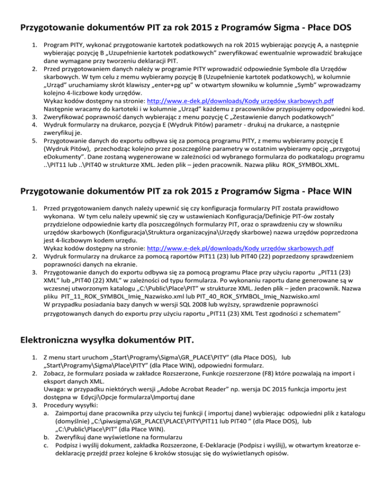 Przygotowanie dokumentów PIT za rok 2015 z Programów Sigma - Płace DOS 1. Program PITY, wykonać przygotowanie kartotek podatkowych na rok 2015 wybierając pozycję A, a następnie wybierając pozycję B „Uzupełnienie kartotek podatkowych” zweryfikować ewentualnie wprowadzić brakujące dane wymagane przy tworzeniu deklaracji PIT. 2. Przed przygotowaniem danych należy w programie PITY wprowadzić odpowiednie Symbole dla Urzędów skarbowych. W tym celu z memu wybieramy pozycję B (Uzupełnienie kartotek podatkowych), w kolumnie „Urząd” uruchamiamy skrót klawiszy „enter+pg up” w otwartym słowniku w kolumnie „Symb” wprowadzamy kolejno 4-liczbowe kody urzędów. Wykaz kodów dostępny na stronie: http://www.e-dek.pl/downloads/Kody urzędów skarbowych.pdf Następnie wracamy do kartoteki i w kolumnie „Urząd” każdemu z pracowników przypisujemy odpowiedni kod. 3. Zweryfikować poprawność danych wybierając z menu pozycję C „Zestawienie danych podatkowych” 4. Wydruk formularzy na drukarce, pozycja E (Wydruk Pitów) parametr - drukuj na drukarce, a następnie zweryfikuj je. 5. Przygotowanie danych do exportu odbywa się za pomocą programu PITY, z memu wybieramy pozycję E (Wydruk Pitów), przechodząc kolejno przez poszczególne parametry w ostatnim wybieramy opcję „przygotuj eDokumenty”. Dane zostaną wygenerowane w zależności od wybranego formularza do podkatalogu programu ..\PIT11 lub ..\PIT40 w strukturze XML. Jeden plik – jeden pracownik. Nazwa pliku ROK_SYMBOL.XML. Przygotowanie dokumentów PIT za rok 2015 z Programów Sigma - Płace WIN 1. Przed przygotowaniem danych należy upewnić się czy konfiguracja formularzy PIT została prawidłowo wykonana. W tym celu należy upewnić się czy w ustawieniach Konfiguracja/Definicje PIT-ów zostały przydzielone odpowiednie karty dla poszczególnych formularzy PIT, oraz o sprawdzeniu czy w słowniku urzędów skarbowych (Konfiguracja\Struktura organizacyjna\Urzędy skarbowe) nazwa urzędów poprzedzona jest 4-liczbowym kodem urzędu. Wykaz kodów dostępny na stronie: http://www.e-dek.pl/downloads/Kody urzędów skarbowych.pdf 2. Wydruk formularzy na drukarce za pomocą raportów PIT11 (23) lub PIT40 (22) poprzedzony sprawdzeniem poprawności danych na ekranie. 3. Przygotowanie danych do exportu odbywa się za pomocą programu Płace przy użyciu raportu „PIT11 (23) XML” lub „PIT40 (22) XML” w zależności od typu formularza. Po wykonaniu raportu dane generowane są w wczesnej utworzonym katalogu „C:\Public\Place\PIT” w strukturze XML. Jeden plik – jeden pracownik. Nazwa pliku PIT_11_ROK_SYMBOL_Imię_Nazwisko.xml lub PIT_40_ROK_SYMBOL_Imię_Nazwisko.xml W przypadku posiadania bazy danych w wersji SQL 2008 lub wyższy, sprawdzenie poprawności przygotowanych danych do exportu przy użyciu raportu „PIT11 (23) XML Test zgodności z schematem” Elektroniczna wysyłka dokumentów PIT. 1. Z menu start uruchom „Start\Programy\Sigma\GR_PLACE\PITY” (dla Płace DOS), lub „Start\Programy\Sigma\Place\PITY” (dla Płace WIN), odpowiedni formularz. 2. Zobacz, że formularz posiada w zakładce Rozszerzone, Funkcje rozszerzone (F8) które pozwalają na import i eksport danych XML. Uwaga: w przypadku niektórych wersji „Adobe Acrobat Reader” np. wersja DC 2015 funkcja importu jest dostępna w Edycji\Opcje formularza\Importuj dane 3. Procedury wysyłki: a. Zaimportuj dane pracownika przy użyciu tej funkcji ( importuj dane) wybierając odpowiedni plik z katalogu (domyślnie) „C:\piwsigma\GR_PLACE\PLACE\PITY\PIT11 lub PIT40 ” (dla Płace DOS), lub „C:\Public\Place\PIT” (dla Płace WIN). b. Zweryfikuj dane wyświetlone na formularzu c. Podpisz i wyślij dokument, zakładka Rozszerzone, E-Deklaracje (Podpisz i wyślij), w otwartym kreatorze edeklarację przejdź przez kolejne 6 kroków stosując się do wyświetlanych opisów. Uwaga: w przypadku niektórych wersji „Adobe Acrobat Reader” np. wersja DC 2015 jeśli brak narzędzia EDeklaracje, należy wybrać zakładkę narzędzia, odnaleźć E-Deklarację (jeśli brak ponownie zainstalować) i kliknąć polecenie otwórz. d. Po prawidłowym wysłaniu dokumentu na formularzu PIT w polu 2 pojawi się numer referencyjny wysyłki. Opcjonalnie Formularz z nadanym numerem wysyłki można zapisać wybierając z górnego menu kolejno Plik, Zapisz, w nazwie pliku wpisujemy dane pracownika i zapisujemy plik do dowolnie wczesnej przygotowanego katalogu przez użytkownika. 4. Rejestr wysłanych dokumentów sprawdzamy w zakładka Rozszerzone, E-Deklaracje (Rejestr wysyłek) w którym dostępna jest możliwość sprawdzenia statusu dokumentu. Zwykle czas weryfikacji przez system e-deklaracje może trwać nawet kilka godzin. Numer statusu 200 podświetlony na zielono potwierdza prawidłowe złożenie i zatwierdzenie dokumentu. 5. W ten sposób można importować dane do formularza interaktywnego dla poszczególnych pracowników, kontrolować dane, edytować, archiwizować pliki PDF i XML, drukować PIT11(23), PIT40(22),weryfikować, podpisywać podpisem kwalifikowanym i wysyłać do US. Wysyłka Formularzy w oparciu o program PPUS (Grupowa Wysyłka Formularzy) 1. Jeżeli użytkownik chce wysłać grupowo dokumenty PIT do US drogą elektroniczną może wykonać to przy wykorzystaniu programu rekomendowanego przez MF wg procedury jak niżej. 2. Kopiowanie plików XML do katalogu IMPORT programu PPUS rekomendowanego przez MF. http://www.ppus.pl/ Przy założeniach domyślnej instalacji należy skopiować pliki z rozszerzeniem xml znajdujące się w katalogu: Dla systemu Place DOS C:\Piwsigma\PLACE\PITY\PIT11 Dla systemu Place WIN C:\Public\Place\PIT Do katalogu C:\PPUS\IMPORT 3. Import danych do bazy programu PPUS 4. Przegląd zaimportowanych danych i weryfikacja. 5. Podpisanie danych certyfikatem kwalifikowanym. Możliwa jest również wysyłka testowa. 6. Wysłanie danych drogą elektroniczną do US przy pomocy programu PPUS i odbiór UPO z MF (Urz