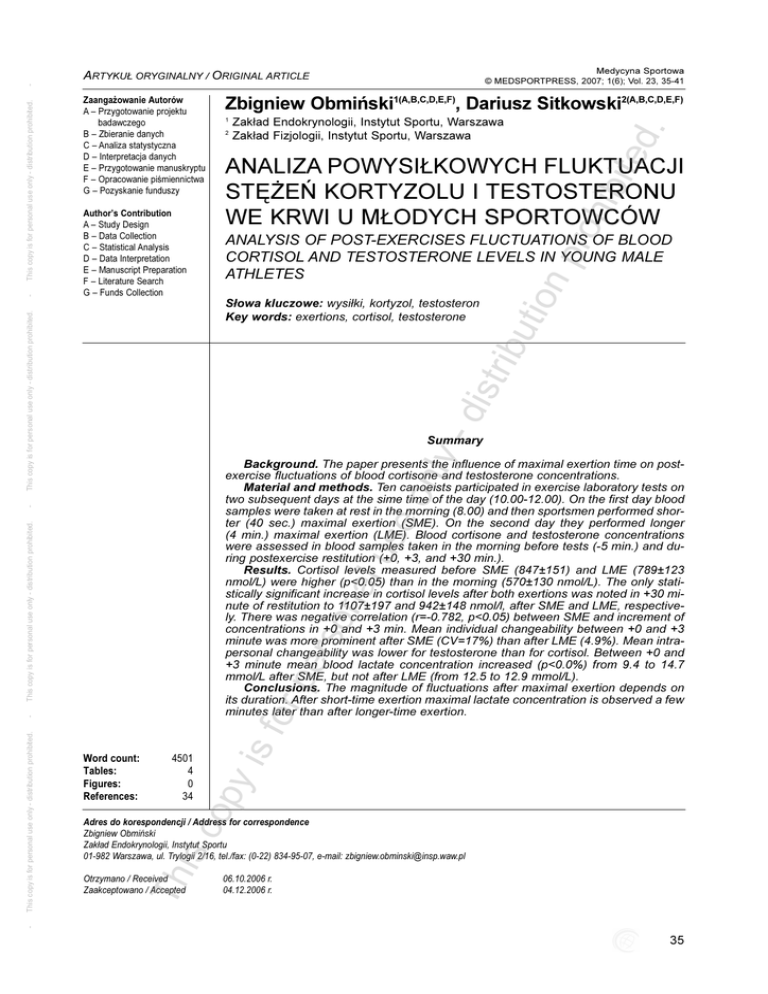 Medycyna Sportowa © MEDSPORTPRESS, 2007; 1(6); Vol. 23, 35-41 Zbigniew Obmiñski1(A,B,C,D,E,F), Dariusz Sitkowski2(A,B,C,D,E,F) 1 2 Author’s Contribution A – Study Design B – Data Collection C – Statistical Analysis D – Data Interpretation E – Manuscript Preparation F – Literature Search G – Funds Collection tio np roh ibit ANALIZA POWYSI£KOWYCH FLUKTUACJI STʯEÑ KORTYZOLU I TESTOSTERONU WE KRWI U M£ODYCH SPORTOWCÓW ANALYSIS OF POST-EXERCISES FLUCTUATIONS OF BLOOD CORTISOL AND TESTOSTERONE LEVELS IN YOUNG MALE ATHLETES S³owa kluczowe: wysi³ki, kortyzol, testosteron Key words: exertions, cortisol, testosterone ibu -d istr nly Summary 4501 4 0 34 op Word count: Tables: Figures: References: y is - for pe rs on al us This copy is for personal use only - distribution prohibited. - eo Background. The paper presents the influence of maximal exertion time on postexercise fluctuations of blood cortisone and testosterone concentrations. Material and methods. Ten canoeists participated in exercise laboratory tests on two subsequent days at the sime time of the day (10.00-12.00). On the first day blood samples were taken at rest in the morning (8.00) and then sportsmen performed shorter (40 sec.) maximal exertion (SME). On the second day they performed longer (4 min.) maximal exertion (LME). Blood cortisone and testosterone concentrations were assessed in blood samples taken in the morning before tests (-5 min.) and during postexercise restitution (+0, +3, and +30 min.). Results. Cortisol levels measured before SME (847±151) and LME (789±123 nmol/L) were higher (p<0.05) than in the morning (570±130 nmol/L). The only statistically significant increase in cortisol levels after both exertions was noted in +30 minute of restitution to 1107±197 and 942±148 nmol/l, after SME and LME, respectively. There was negative correlation (r=-0.782, p<0.05) between SME and increment of concentrations in +0 and +3 min. Mean individual changeability between +0 and +3 minute was more prominent after SME (CV=17%) than after LME (4.9%). Mean intrapersonal changeability was lower for testosterone than for cortisol. Between +0 and +3 minute mean blood lactate concentration increased (p<0.0%) from 9.4 to 14.7 mmol/L after SME, but not after LME (from 12.5 to 12.9 mmol/L). Conclusions. The magnitude of fluctuations after maximal exertion depends on its duration. After short-time exertion maximal lactate concentration is observed a few minutes later than after longer-time exertion. Th is c Adres do korespondencji / Address for correspondence Zbigniew Obmiñski Zak³ad Endokrynologii, Instytut Sportu 01-982 Warszawa, ul. Trylogii 2/16, tel./fax: (0-22) 834-95-07, e-mail: [email protected] Otrzymano / Received Zaakceptowano / Accepted 06.10.2006 r. 04.12.2006 r. - This copy is for personal use only - distribution prohibited. Zak³ad Endokrynologii, Instytut Sportu, Warszawa Zak³ad Fizjologii, Instytut Sportu, Warszawa ed . Zaanga¿owanie Autorów A – Przygotowanie projektu badawczego B – Zbieranie danych C – Analiza statystyczna D – Interpretacja danych E – Przygotowanie manuskryptu F – Opracowanie piœmiennictwa G – Pozyskanie funduszy This copy is for personal use only - distribution prohibited. - This copy is for personal use only - distribution prohibited. - ARTYKU£ ORYGINALNY / ORIGINAL ARTICLE 35 Th is c op y is for pe rs on tio np roh ibit ibu -d istr nly eo al us Ocena reakcji kory nadnerczy na maksymalne wysi³ki, oparta na pomiarach kortyzolu we krwi, prezentowana by³a przez licznych autorów. Jednak rzetelnoœæ oceny reakcji kory nadnerczy na bodziec, opartej na podstawie jednego pomiaru dokonanego bezpoœrednio po wysi³ku, wydaje siê byæ w¹tpliwa. Dotyczy to szczególnie tych prac, w których pomimo maksymalnych wysi³ków nie odnotowano powysi³kowych zmian stê¿eñ kortyzolu. Na przyk³ad u wioœlarzy, po maksymalnym, 6-minutowym wysi³ku typu all-out, wykonywanym na ergometrze wioœlarskim i powoduj¹cym znaczny wzrost poziomu mleczanu (œrednio 13.4 mmol/L), œredni poziom kortyzolu przed i po teœcie by³ taki sam (477 nmol/L) [1], a po oficjalnym meczu tenisowym zauwa¿ono niewielki spadek tego parametru [2]. Niektóre badania sugeruj¹, ¿e powysi³kowy kierunek zmian stê¿enia kortyzolu mo¿e zale¿eæ od przedstartowego poziomu hormonu, a ten z kolei od klasy sportowej zawodnika. U elity sportowej wioœlarzy, u której poziom hormonu przed startem na 2000 m znacznie przekracza³ 1000 nmol/L, po wysi³ku wyraŸnie siê obni¿y³, podczas gdy w grupie przeciêtnych zawodników kortyzol przed startem by³ wzglêdnie ni¿szy, a po zawodach znacz¹co wzrós³ [3]. Doœwiadczenia J. D. Few z po³owy lat siedemdziesi¹tych, przy u¿yciu znakowanego trytem kortyzolu, ujawni³y bardzo szybki wzrost tempa wychwytu tego hormonu z kr¹¿enia w czasie wysi³ku [4]. Zjawisko to mo¿e mieæ du¿y wp³yw na dynamikê powysi³kowych zmian hormonu, zw³aszcza wtedy, gdy wychwyt przewa¿a nad sekrecj¹. W poszukiwaniu przyczyn powysi³kowych zmian stê¿enia hormonów trzeba uwzglêdniæ, obok sekrecji, tak¿e chwilowe zmiany clirensu metabolicznego i zagêszczenie krwi. Niewielu autorów podejmuje próbê wyjaœnienia, dlaczego w literaturze opisuje siê tak ró¿norodne, co do kierunku i wielkoœci, powysi³kowe zmiany kortyzolu, i dlaczego jego zachowanie trudno przewidzieæ. Pionierem tych rozwa¿añ jest Atku Viru. Badania tego autora nad osobnicz¹ dynamik¹ kortyzolu i ACTH po 2-godzinnym wysi³ku wykaza³y u wszystkich dwufazow¹ powysi³kow¹ zmianê stê¿enia ACTH (wzrost, a potem spadek) oraz 5 ró¿nych wzorców zachowañ kortyzolu, z których tylko w jednym widoczna by³a koincydencja zmian kortyzolu i ACTH. Z uwagi na znaczne indywidualne fluktuacje stê¿eñ hormonów, nie tylko po wysi³ku, ale te¿ w spoczynku, za indywidualn¹, znacz¹c¹ zmianê stê¿enia kortyzolu lub testosteronu w badanym przedziale czasowym uznano tak¹, która przekracza indywidualn