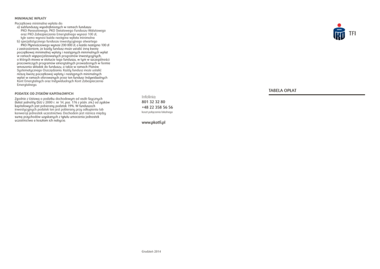 MINIMALNE WPŁATY Początkowa minimalna wpłata do: PKO Parasolowego, PKO Światowego Funduszu Walutowego oraz PKO Zabezpieczenia Emerytalnego wynosi 100 zł, tyle samo wynosi każda następna wpłata minimalna b) specjalistycznego funduszu inwestycyjnego otwartego Systematycznego Oszczędzania. Każdy fundusz może ustalić Kont Emerytalnych oraz Indywidualnych Kont Zabezpieczenia Emerytalnego. PODATEK OD ZYSKÓW KAPITAŁOWYCH inwestycyjnych podatek ten jest pobierany przy odkupieniu lub konwersji jednostek uczestnictwa. Dochodem jest różnica między TABELA OPŁAT Infolinia: 801 32 32 80 +48 22 358 56 56 koszt połączenia lokalnego www.pkotfi.pl Grudzień 2014 Subfundusz PKO Infrastruktury i Budownictwa Globalny Subfundusz PKO Dóbr Luksusowych Globalny Subfundusz PKO Technologii Subfundusz PKO Surowców Globalny Subfundusz PKO Strategicznej Alokacji Subfundusz PKO Akcji Małych i Średnich Spółek Plus Subfundusz PKO Akcji Małych i Średnich Spółek Subfundusz PKO Akcji Nowa Europa Subfundusz PKO Akcji Plus Subfundusz PKO Akcji Subfundusz PKO Zrównoważony Plus Subfundusz PKO Zrównoważony Subfundusz PKO Stabilnego Wzrostu Plus Subfundusz PKO Stabilnego Wzrostu PKO Zabezpieczenia Emerytalnego – sfio PKO Światowy Walutowy – fio Subfundusz PKO Papierów Dłużnych Plus Subfundusz PKO Obligacji Długoterminowych Subfundusz PKO Obligacji Subfundusz PKO Skarbowy Plus Subfundusz PKO Skarbowy Subfundusz PKO Rynku Pieniężnego Zakumulowana wartość inwestycji* w funduszach i dokonywana wpłata (w złotych; dotyczy jednostek kategorii A, A1) PKO Płynnościowy – sfio TABELA 1 STAWKI OPŁATY ZA NABYCIE JEDNOSTEK UCZESTNICTWA KATEGORII A, A1 do 5000 0,00% 0,35% 0,55% 1,50% 1,50% 2,00% 3,25% 4,50% od 5000 do 10 000 0,00% 0,30% 0,50% 1,45% 1,45% 1,90% 2,75% 4,25% od 10 000 do 25 000 0,00% 0,25% 0,45% 1,25% 1,25% 1,70% 2,25% 4,00% od 25 000 do 50 000 0,00% 0,20% 0,40% 1,00% 1,00% 1,40% 2,00% 3,50% od 50 000 do 100 000 0,00% 0,15% 0,30% 0,75% 0,75% 1,00% 1,50% 3,00% od 100 000 do 300 000 0,00% 0,05% 0,10% 0,25% 0,25% 0,40% 0,65% 1,00% od 300 000 do 1 000 000 0,00% 0,03% 0,06% 0,15% 0,15% 0,20% 0,40% 0,60% od 1 000 000 0,00% 0,01% 0,02% 0,05% 0,05% 0,10% 0,15% 0,20% *Całkowita wartość posiadanych jednostek uczestnictwa we wszystkich funduszach otwartych i specjalistycznych otwartych PKO i na wszystkich rejestrach uczestnika liczona w złotych według cen jednostek uczestnictwa z dnia poprzedzającego realizację zlecenia CHARAKTERYSTYKA KATEGORII JEDNOSTEK UCZESTNICTWA Jednostki uczestnictwa kategorii A, A1 charakteryzują się tym, że uczestnik przy ich nabywaniu ponosi opłatę manipulacyjną zwaną opłatą za nabycie. Jednostki uczestnictwa kategorii B, B1 charakteryzują się tym, że uczestnik przy ich odkupieniu ponosi opłatę manipulacyjną zwaną opłatą za odkupienie. Opłata za odkupienie jednostek uczestnictwa kategorii B, B1 równa jest odpowiednio opłacie za nabycie jednostek kategorii A, A1. Jednostki uczestnictwa kategorii C, C1 charakteryzują się tym, że uczestnik przy ich nabywaniu ponosi opłatę manipulacyjną zwaną opłatą za nabycie, a przy ich odkupieniu ponosi opłatę manipulacyjną zwaną opłatą za odkupienie. Opłata za nabycie jednostek uczestnictwa kategorii C, C1 równa jest połowie opłaty za nabycie jednostek uczestnictwa kategorii A, A1. Opłata za odkupienie jednostek uczestnictwa kategorii C, C1 równa jest połowie opłaty za nabycie jednostek uczestnictwa kategorii A, A1. Opłata manipulacyjna za nabycie jednostek uczestnictwa kategorii E wynosi maksymalnie 5% kwoty wpłaty z wyłączeniem jednostek kategorii E funduszu PKO Zabezpieczenia Emerytalnego – specjalistycznego funduszu inwestycyjnego otwartego, opłata manipulacyjna za nabycie którego wynosi maksymalnie 1%. Stawkę opłaty manipulacyjnej pobieranej za nabycie jednostek uczestnictwa kategorii E określają zasady prowadzenia Wyspecjalizowanych Programów Inwestycyjnych lub umowy zawierane z podmiotami tworzącymi pracownicze programy emerytalne, zakładowe programy oszczędnościowe lub podmiotami oferującymi swoim pracownikom inne formy zabezpieczenia finansowego oparte na nabywaniu jednostek uczestnictwa. Opłata manipulacyjna za nabycie jednostek uczestnictwa kategorii F nie jest pobierana. Opłata manipulacyjna za nabycie jednostek uczestnictwa kategorii I nie jest pobierana. ZASADA AKUMULACJI OPŁATY MANIPULACYJNE ZA KONWERSJE I PRZENIESIENIA 3. Jednostki uczestnictwa kategorii B, B1 nie podlegają konwersji, chyba że zezwalają na to zasady produktów oferowanych przez fundusze, w tym zasady danego Planu Systematycznego Oszczędzania lub Wyspecjalizowanego Programu Inwestycyjnego. 4. Konwersje do i z funduszu PKO Zabezpieczenia Emerytalnego nie są możliwe, chyba że zezwalają na to zasady produktów oferowanych przez fundusze, w tym w szczególności pracowniczych programów emerytalnych prowadzonych w formie wnoszenia składek do funduszu.