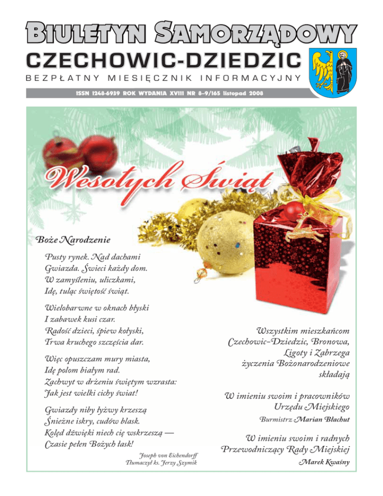 BIULETYN SAMORZĄDOWY C ZEC CZ ECHOW HOW IC-DZ IC- DZII E DZ D ZII C B E Z P Ł AT N Y M I E S I Ę C Z N I K I N F O R M A C YJ N Y ISSN 1248-6939 ROK WYDANIA XVIII NR 8–9/165 listopad 2008 Boże Narodzenie Pusty rynek. Nad dachami Gwiazda. Świeci każdy dom. W zamyśleniu, uliczkami, Idę, tuląc świętość świąt. Wielobarwne w oknach błyski I zabawek kusi czar. Radość dzieci, śpiew kołyski, Trwa kruchego szczęścia dar. Więc opuszczam mury miasta, Idę polom białym rad. Zachwyt w drżeniu świętym wzrasta: Jak jest wielki cichy świat! Gwiazdy niby łyżwy krzeszą Śnieżne iskry, cudów blask. Kolęd dźwięki niech cię wskrzeszą — Czasie pełen Bożych łask! Joseph von Eichendorff Tłumaczył ks. Jerzy Szymik Wszystkim mieszkańcom Czechowic-Dziedzic, Bronowa, Ligoty i Zabrzega życzenia Bożonarodzeniowe składają W imieniu swoim i pracowników Urzędu Miejskiego Burmistrz Marian Błachut W imieniu swoim i radnych Przewodniczący Rady Miejskiej Marek Kwaśny Powstają kolejne sale gimnastyczne Czechowicki samorząd, sukcesywnie od kilku lat, przeznacza w gminnym budżecie środki na budowę przyszkolnych sal gimnastycznych. Powiększająca się rokrocznie baza szkolnych obiektów sportowych w przyszłym roku wzbogaci się o dwie kolejne sale gimnastyczne: w Gimnazjum Publicznym nr 3 i w Szkole Podstawowej nr 2 w Ligocie Miliardowicach. żone trzy wnioski na dofinansowanie budowy sal gimnastycznych. W przypadku sali gimnastycznej przy Gimnazjum Publicznym nr 2 ubiegamy się o ponad 3,4 mln zł dofinansowania, w przypadku sali przy Gimnazjum Publicznym nr 3 wartość dofinansowania, o które zabiegamy to ponad 3,7 mln zł, natomiast na budowę sali gimnastycznej przy Szkole Podstawowej nr 2 w Ligocie Miliardowicach wystąpiliśmy o dofinansowanie w wysokości ponad 2,6 mln zł. Wszystkie trzy wnioski pozytywnie przeszły już ocenę formalną i zostały skierowane do oceny merytorycznej, której dokona zespół ekspertów. Prawdopodobne ostateczne decyzje Zarządu Województwa, rozstrzygające ten konkurs, poznamy w I kwartale 2009 r. Gimnazjum Publiczne nr 3 Gimnazjum Publiczne nr 3 Jedną z pierwszych nowych sal gimnastycznych była oddana blisko dekadę temu sala przy Zespole Szkół w Ligocie. W roku 2004 nową salę wybudowano przy Zespole SzkolnoPrzedszkolnym nr 1 w Czechowicach-Dziedzicach przy ul. Chłopskiej. Kolejka szkół czekających na poprawę bazy sportowej była ogromna, dlatego Komisja Oświaty, Kultury i Sportu w kadencji 2002–2006, ustaliła harmonogram budowy sal gimnastycznych, który na przestrzeni ostatnich kilku lat ulegał zmianom, nie ulegała jednak zmianie decyzja samorządu o potrzebie budowy przyszkolnych sal gimnastycznych. Prawdziwego rozpędu nabrała budowa sal w roku 2006, kiedy to rozpoczęto inwestycje w trzech gminnych szkołach – w Szkole Podstawowej nr 4, w Szkole Podstawowej nr 5 i w Zespole Szkolno-Przedszkolnym w Bronowie. Ten ambitny program budowy nowych sal gimnastycznych jest kontynuowany przez obecnego burmistrza i Radę Miejską nowej kadencji. W roku bieżącym oddana została do użytku sala gimnastyczna w Gimnazjum Publicznym nr 2, w roku przyszłym kolejne dwie szkoły będą mogły się pochwalić salami gimnastycznymi – Gimnazjum Publiczne nr 3 w Czechowicach-Dziedzicach oraz Szkoła Podstawowa nr 2 w Ligocie Miliardowicach. *** Gmina Czechowice-Dziedzice stara się o dofinansowanie budowy sal gimnastycznych w ramach Regionalnego Programu Operacyjnego Województwa Śląskiego na lata 2007–2013. Dofinansowanie, o jakie zabiegamy sięga 85% wartości zadań. W czerwcu br. w Urzędzie Marszałkowskim zostały zło- 2 Zarówno sale, które zostały już wybudowane, jak i te, które są w trakcie realizacji, to nowoczesne obiekty dostosowane architektonicznie do budynków macierzystych szkół. Wyposażone są w niezbędne zaplecze – przebieralnie, sanitariaty z prysznicami oraz pomieszczenia służące do przechowywania sprzętu. Budowa sal gimnastycznych przy GP 3 oraz przy SP nr 2 w Ligocie Miliardowicach zaplanowana została w Wieloletnim Planie Inwestycyjnym, a czechowicki samorząd przeznaczył na ten cel z gminnego budżetu ponad 7 mln zł. Budowa sal przebiega zgodnie z harmonogramem i w przyszłym roku szkolnym dzieci i młodzież będą mogły rozpocząć zajęcia wychowania fizycznego w nowoczesnych obiektach. Gimnazjum Publiczne nr 3 BIULETYN SAMORZĄDOWY C Z E C H O W I C - D Z I E D Z I C Powstają kolejne sale gimnastyczne Szkoła Podstawowa nr 2 w Ligocie Miliardowicach Sala gimnastyczna przy Szkole Podstawowej nr 2 w Ligocie Miliardowicach Prace budowlane rozpoczęły się w sierpniu br. a planowany termin zakończenia realizacji, to 31 lipca 2009 r. Zgodnie z umową zawartą pomiędzy Gminą Czechowice-Dziedzice i wykonawcą robót wyłonionym w przetargu nieograniczonym tj. Przedsiębiorstwem Robót Budowlanych BESKID nr 2 Sp. z o.o. z Bielska-Białej, wartość zadania to 3 199 572 zł. Zakres prac budowlanych obejmuje wykonanie wolnostojącego, parterowego, niepodpiwniczonego obiektu sali gimnastycznej, z segmentem sanitatno-szatniowym, połączonej z istniejącym budynkiem szkoły przewiązką. Powierzchnia zabudowy – 621 m2, powierzchnia użytkowa 489 m2, kubatura – 3 735 m3. Sala gimnastyczna o powierzchni ok. 24 m x 14 m będzie w zależności od potrzeb, dzieliła kurtyną wnętrze na dwie odrębne przestrzenie dla potrzeb prowadzenia zajęć wychowania fizycznego. W przewiązce łączącej szkołę z salą gimnastyczną zaprojektowano zaplecze sanitarne i szatnie dla ćwiczących dzieci oraz pokój dla nauczyciela wychowania fizycznego. Będzie się tu również mieścił magazyn sprzętu sportowego. Projekt budowy sali gimnastycznej zakłada wyposażenie jej w sprzęt sportowy za kwotę około 120 tys. zł, będą to m.in. drabinki gimnastyczne, materace, skrzynie gimnastyczne, tablica świetlna wyników, tablice do koszykówki, siatkę do siatkówki, badmintona czy ten