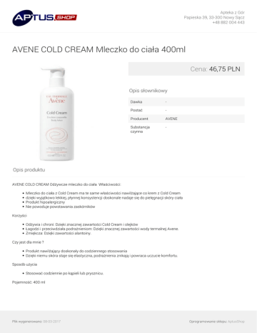 Apteka z Gór Papieska 39, 33-300 Nowy Sącz +48 882 004 443 AVENE COLD CREAM Mleczko do ciała 400ml Cena: 46,75 PLN Opis słownikowy Dawka - Postać - Producent AVENE Substancja czynna - Opis produktu AVENE COLD CREAM Odżywcze mleczko do ciała Właściwości: Mleczko do ciała z Cold Cream ma te same właściwości nawilżające co krem z Cold Cream dzięki wyjątkowo lekkiej, płynnej konsystencji doskonale nadaje się do pielęgnacji skóry ciała Produkt hipoalergiczny Nie powoduje powstawania zaskórników Korzyści Odżywia i chroni: Dzięki znacznej zawartości Cold Cream i olejków Łagodzi i przeciwdziała podrażnieniom: Dzięki znacznej zawartości wody termalnej Avene. Zmiękcza: Dzięki zawartości alantoiny. Czy jest dla mnie ? Produkt nawilżający doskonały do codziennego stosowania Dzięki niemu skóra staje się elastyczna, podrażnienia znikają i powraca uczucie komfortu. Sposób użycia Stosować codziennie po kąpieli lub prysznicu. Pojemność: 400 ml Plik wygenerowano: 08-03-2017 Powered by TCPDF (www.tcpdf.org) Oprogramowanie sklepu: AptusShop