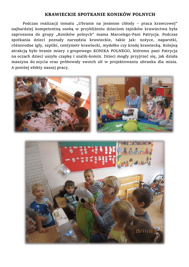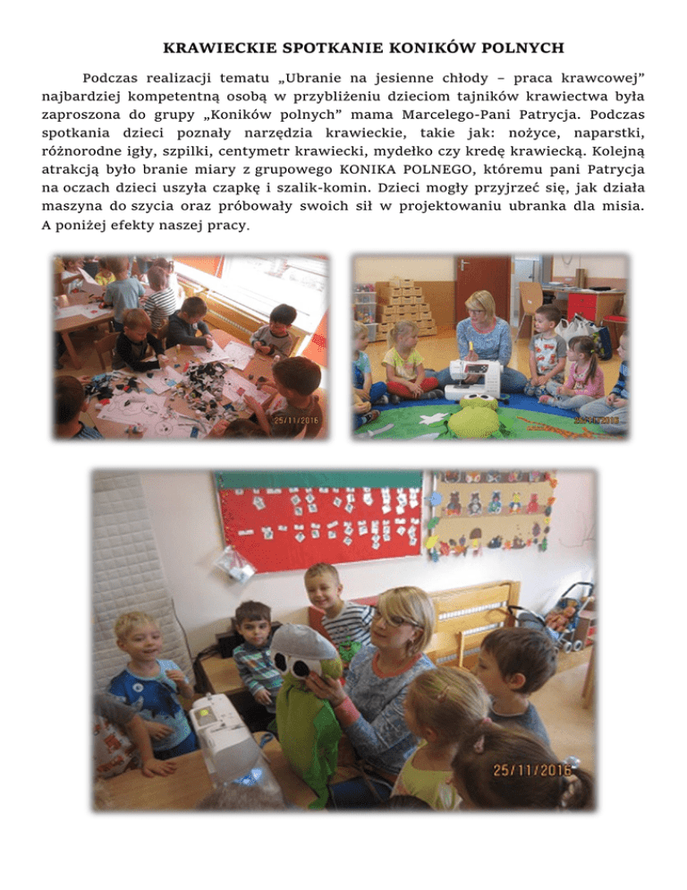 KRAWIECKIE SPOTKANIE KONIKÓW POLNYCH Podczas realizacji tematu „Ubranie na jesienne chłody – praca krawcowej” najbardziej kompetentną osobą w przybliżeniu dzieciom tajników krawiectwa była zaproszona do grupy „Koników polnych” mama Marcelego-Pani Patrycja. Podczas spotkania dzieci poznały narzędzia krawieckie, takie jak: nożyce, naparstki, różnorodne igły, szpilki, centymetr krawiecki, mydełko czy kredę krawiecką. Kolejną atrakcją było branie miary z grupowego KONIKA POLNEGO, któremu pani Patrycja na oczach dzieci uszyła czapkę i szalik-komin. Dzieci mogły przyjrzeć się, jak działa maszyna do szycia oraz próbowały swoich sił w projektowaniu ubranka dla misia. A poniżej efekty naszej pracy.