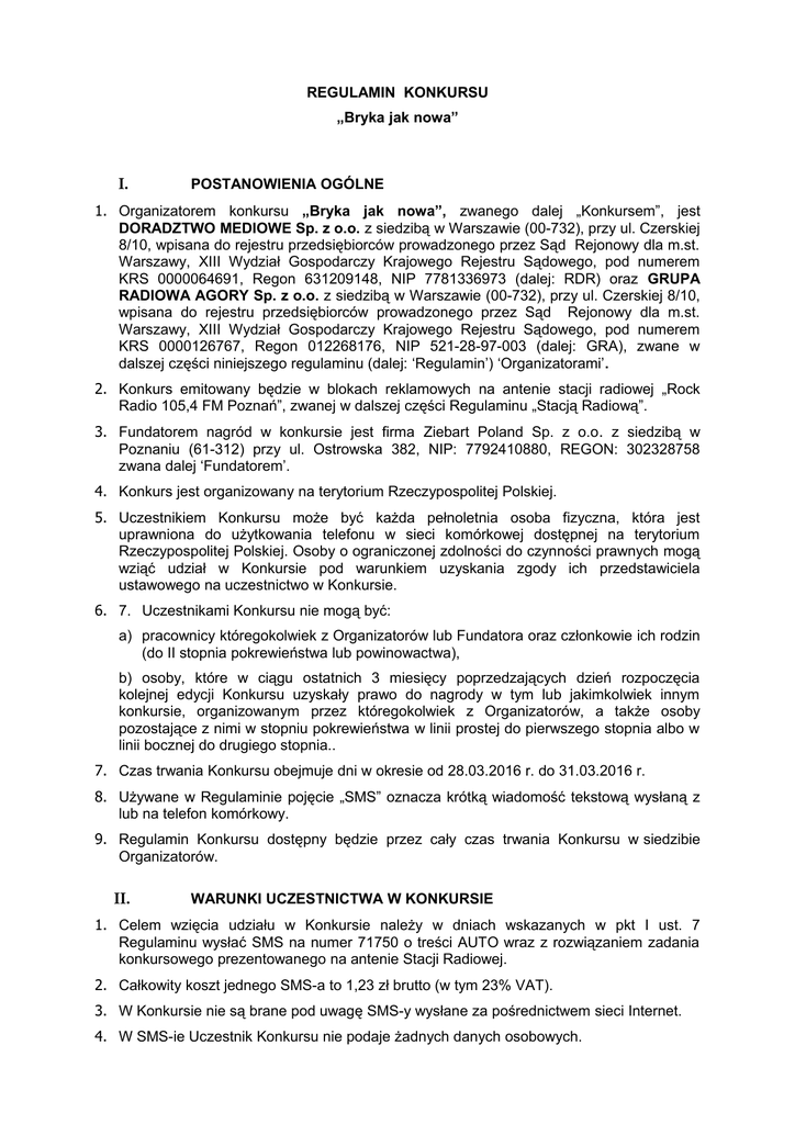 REGULAMIN KONKURSU „Bryka jak nowa” I. POSTANOWIENIA OGÓLNE 1. Organizatorem konkursu „Bryka jak nowa”, zwanego dalej „Konkursem”, jest DORADZTWO MEDIOWE Sp. z o.o. z siedzibą w Warszawie (00-732), przy ul. Czerskiej 8/10, wpisana do rejestru przedsiębiorców prowadzonego przez Sąd Rejonowy dla m.st. Warszawy, XIII Wydział Gospodarczy Krajowego Rejestru Sądowego, pod numerem KRS 0000064691, Regon 631209148, NIP 7781336973 (dalej: RDR) oraz GRUPA RADIOWA AGORY Sp. z o.o. z siedzibą w Warszawie (00-732), przy ul. Czerskiej 8/10, wpisana do rejestru przedsiębiorców prowadzonego przez Sąd Rejonowy dla m.st. Warszawy, XIII Wydział Gospodarczy Krajowego Rejestru Sądowego, pod numerem KRS 0000126767, Regon 012268176, NIP 521-28-97-003 (dalej: GRA), zwane w dalszej części niniejszego regulaminu (dalej: ‘Regulamin’) ‘Organizatorami’. 2. Konkurs emitowany będzie w blokach reklamowych na antenie stacji radiowej „Rock Radio 105,4 FM Poznań”, zwanej w dalszej części Regulaminu „Stacją Radiową”. 3. Fundatorem nagród w konkursie jest firma Ziebart Poland Sp. z o.o. z siedzibą w Poznaniu (61-312) przy ul. Ostrowska 382, NIP: 7792410880, REGON: 302328758 zwana dalej ‘Fundatorem’. 4. Konkurs jest organizowany na terytorium Rzeczypospolitej Polskiej. 5. Uczestnikiem Konkursu może być każda pełnoletnia osoba fizyczna, która jest uprawniona do użytkowania telefonu w sieci komórkowej dostępnej na terytorium Rzeczypospolitej Polskiej. Osoby o ograniczonej zdolności do czynności prawnych mogą wziąć udział w Konkursie pod warunkiem uzyskania zgody ich przedstawiciela ustawowego na uczestnictwo w Konkursie. 6. 7. Uczestnikami Konkursu nie mogą być: a) pracownicy któregokolwiek z Organizatorów lub Fundatora oraz członkowie ich rodzin (do II stopnia pokrewieństwa lub powinowactwa), b) osoby, które w ciągu ostatnich 3 miesięcy poprzedzających dzień rozpoczęcia kolejnej edycji Konkursu uzyskały prawo do nagrody w tym lub jakimkolwiek innym konkursie, organizowanym przez któregokolwiek z Organizatorów, a także osoby pozostające z nimi w stopniu pokrewieństwa w linii prostej do pierwszego stopnia albo w linii bocznej do drugiego stopnia.. 7. Czas trwania Konkursu obejmuje dni w okresie od 28.03.2016 r. do 31.03.2016 r. 8. Używane w Regulaminie pojęcie „SMS” oznacza krótką wiadomość tekstową wysłaną z lub na telefon komórkowy. 9. Regulamin Konkursu dostępny będzie przez cały czas trwania Konkursu w siedzibie Organizatorów. II. WARUNKI UCZESTNICTWA W KONKURSIE 1. Celem wzięcia udziału w Konkursie należy w dniach wskazanych w pkt I ust. 7 Regulaminu wysłać SMS na numer 71750 o treści AUTO wraz z rozwiązaniem zadania konkursowego prezentowanego na antenie Stacji Radiowej. 2. Całkowity koszt jednego SMS-a to 1,23 zł brutto (w tym 23% VAT). 3. W Konkursie nie są brane pod uwagę SMS-y wysłane za pośrednictwem sieci Internet. 4. W SMS-ie Uczestnik Konkursu nie podaje żadnych danych osobowych. 5. Po wysłaniu SMS-a, o treści wskazanej w ust. 1 powyżej, każdy Uczestnik otrzyma SMS zwrotny potwierdzający oddanie głosu i udział w Konkursie. 6. Organizatorzy nie ponoszą odpowiedzialności za skuteczność przesłania SMS-ów, w szczególności za wszelkie awarie sieci przesyłowych. III. NAGRODY 1. Nagrodą w Konkursie jest 1 pakiet ochronny lakieru samochodowego o wartości 1999,00 zł (słownie: tysiąc dziewięćset dziewięćdziesiąt dziewięć złotych). 2. W Konkursie zostanie rozdana 1 Nagroda. 3. Organizator zastrzega sobie prawo zmiany nagrody na inną, w przypadku, gdy z przyczyn od niego niezależnych, przyznanie takiej Nagrody nie będzie możliwe. IV. NAGRODY I ZASADY ICH PRZYZNANIA 1. Każdego dnia trwania Konkursu na antenie Stacji Radiowej w bloku reklamowym, DJ poinformuje słuchaczy o Konkursie i przybliży jego zasady. 2. Prawo do otrzymania Nagrody w Konkursie uzyska 1 (jeden) Uczestnik Konkursu, którzy zdaniem Komisji Konkursowej, o której mowa w ust. 3 poniżej, wyśle najciekawszy SMS. 3. W celu wyłonienia zwycięzców Konkursu, Organizator powołuje 3 osobową Komisje Konkursową, w składzie: a. Krystyna Rykowska b. Magda Utracka c. Magdalena Pudło 4. Komisja Konkursowa podejmuje decyzje zwykłą większością głosów. Decyzje Komisji Konkursowej są ostateczne i nie podlegają żadnym odwołaniom. 5. Z zastrzeżeniem pkt III ust. 3 Regulaminu, Nagrody nie podlegają wymianie na jakikolwiek ekwiwalent, w szczególności ekwiwalent pieniężny. 6. Uczestnik Konkursu, któremu przysługuje prawo do otrzymania Nagrody, powoływany dalej jako „Zwycięzca Konkursu”, zostanie poinformowany o przyznaniu Nagrody telefonicznie przez Organizatorów. W czasie rozmowy telefonicznej Zwycięzca Konkursu zobowiązany jest podać Organizatorom swoje imię i nazwisko, adres oraz numer dowodu osobistego. 7. Zwycięzca Konkursu zobowiązany jest do dokonania z Organizatorami ustaleń co do miejsca, terminu i sposobu odbioru tej nagrody, przy czym odbiór nagrody może nastąpić nie wcześniej niż 06.04.2016 r. Odbiór nagrody zostanie udokumentowany protokołem podpisanym przez DM i Zwycięzcę Konkursu. 8. Wskutek odmowy podania przez Zwycięzcę Konkursu danych wyliczonych w ust. 4 powyżej, odmowy dokonania przez Zwycięzcę Konkursu ustaleń dotyczących odbioru nagrody, o których mowa w ustępie poprzedzającym lub też niedokonania takich ustaleń w terminie do dnia 15.04.2016r., Zwycięzca Konkursu traci prawo do otrzymania nagrody. 9. Do chwili przekazania Nagrody Zwycięzcy Konkursu DM pozostaje jej jedynym i wyłącznym właścicielem. Nagrody zostaną wydane Zwycięzcom Konkursu przez DM. V. DANE OSOBOWE 1. Uczestnicy Konkursu, podając swoje dane osobowe, wyrażają zgodę i upoważniają Organizatorów do przetwarzania tych danych osobowych dla celów organizacji Konkursu, wydania przyznanych Nagród oraz innych prawnie usprawiedliwionych celów Organizatorów. 2. Uczestnikom 