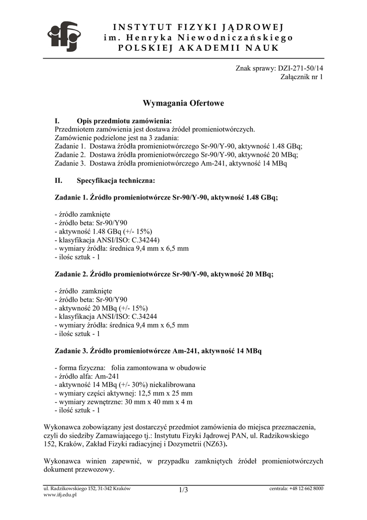 INSTYTUT FIZYKI JĄDROWEJ im. Henryka Niewodniczańskiego POLSKIEJ AKADEMII NAUK Znak sprawy: DZI-271-50/14 Załącznik nr 1 Wymagania Ofertowe I. Opis przedmiotu zamówienia: Przedmiotem zamówienia jest dostawa źródeł promieniotwórczych. Zamówienie podzielone jest na 3 zadania: Zadanie 1. Dostawa źródła promieniotwórczego Sr-90/Y-90, aktywność 1.48 GBq; Zadanie 2. Dostawa źródła promieniotwórczego Sr-90/Y-90, aktywność 20 MBq; Zadanie 3. Dostawa źródła promieniotwórczego Am-241, aktywność 14 MBq II. Specyfikacja techniczna: Zadanie 1. Źródło promieniotwórcze Sr-90/Y-90, aktywność 1.48 GBq; - źródło zamknięte - źródło beta: Sr-90/Y90 - aktywność 1.48 GBq (+/- 15%) - klasyfikacja ANSI/ISO: C.34244) - wymiary źródła: średnica 9,4 mm x 6,5 mm - ilośc sztuk - 1 Zadanie 2. Źródło promieniotwórcze Sr-90/Y-90, aktywność 20 MBq; - źródło zamknięte - źródło beta: Sr-90/Y90 - aktywność 20 MBq (+/- 15%) - klasyfikacja ANSI/ISO: C.34244 - wymiary źródła: średnica 9,4 mm x 6,5 mm - ilośc sztuk - 1 Zadanie 3. Źródło promieniotwórcze Am-241, aktywność 14 MBq - forma fizyczna: folia zamontowana w obudowie - źródło alfa: Am-241 - aktywność 14 MBq (+/- 30%) niekalibrowana - wymiary części aktywnej: 12,5 mm x 25 mm - wymiary zewnętrzne: 30 mm x 40 mm x 4 m - ilość sztuk - 1 Wykonawca zobowiązany jest dostarczyć przedmiot zamówienia do miejsca przeznaczenia, czyli do siedziby Zamawiającego tj.: Instytutu Fizyki Jądrowej PAN, ul. Radzikowskiego 152, Kraków, Zakład Fizyki radiacyjnej i Dozymetrii (NZ63). Wykonawca winien zapewnić, w przypadku zamkniętych źródeł promieniotwórczych dokument przewozowy. ul. Radzikowskiego 152, 31-342 Kraków www.ifj.edu.pl 1/3 centrala: +48 12 662 8000 INSTYTUT FIZYKI JĄDROWEJ im. Henryka Niewodniczańskiego POLSKIEJ AKADEMII NAUK Zaoferowana kwota winna obejmować całkowity koszt za przedmiot zamówienia, w tym także koszty transportu samochodem specjalnym wg ADR i ubezpieczenia. Zamawiający informuje, iż posiada stosowne zezwolenia PAA. Termin dostawy zadania 1, zadania 2, zadania 3 – do 10 tygodni od daty podpisania umowy. Termin płatności faktur za zadanie 1, zadanie 2, zadanie 3 - przelewem do 30 dni liczonego od daty dostarczenia faktury Zamawiającemu, po dokonaniu odbioru przedmiotu umowy na podstawie protokołu. Wyklucza się możliwość stosowania zaliczek i przedpłat. III. Specyfikacja dokumentów: 1) Oferta winna być złożona nie później niż do dnia 29.09.2014 r. do godz. 9.00 w jednej zaklejonej kopercie lub nieprzeźroczystym opakowaniu, zamkniętym w sposób trwały. Na kopercie powinien znajdować się adres oferenta, a koperta powinna być zaadresowana w sposób następujący: Nazwa i adres firmy do korespondencji Instytut Fizyki Jądrowej im. Henryka Niewodniczańskiego Polskiej Akademii Nauk, ul. Radzikowskiego 152 Oferta na dostawę źródeł promieniotwórczych Znak sprawy: DZI-271-50/14 Nie otwierać przed 29.09.2014 roku godz. 9.30 2) Oferta ze szczegółową specyfikacją techniczno-cenową musi być sporządzona w języku polskim oraz musi zostać podpisana przez osoby upoważnione do zaciągania zobowiązań w imieniu oferenta. 3) Oferta musi zawierać propozycję ceny wg formuły określonej przez Zamawiającego. 4) Zamawiający dopuszcza złożenie ofert częściowych, tylko na wybrane zadania. 5) Każda strona oferty winna być ponumerowana i zaparafowana. 6) Termin ważności oferty - minimalny okres jej ważności rozpoczyna się w dniu złożenia ofert, a kończy się nie wcześniej niż z dniem zamknięcia postępowania, a w przypadku oferenta, który wygrał konkurs w dniu podpisania umowy. ul. Radzikowskiego 152, 31-342 Kraków www.ifj.edu.pl 2/3 centrala: +48 12 662 8000 INSTYTUT FIZYKI JĄDROWEJ im. Henryka Niewodniczańskiego POLSKIEJ AKADEMII NAUK 7) Do zawarcia umowy dojdzie w terminie wyznaczonym przez Zamawiającego w piśmie informującym o wyniku konkursu, jednak nie później niż 21 dni od wysłania powiadomienia o wyborze. 8) Do oferty należy dołączyć wypełniony formularz oferty (załącznik nr.2) oraz zaakceptowany wzór umowy (załącznik nr.3). 9) Do oferty należy dołączyć następujące dokumenty w postaci oryginałów lub kopii potwierdzonych za zgodność z oryginałem przez upoważnione osoby: - oryginał lub kserokopia, poświadczona przez oferenta za zgodność z oryginałem aktualnego odpisu z właściwego rejestru albo dokumentu CEIDG (Centralna Ewidencja i Informacja o Działalności Gospodarczej Rzeczypospolitej Polskiej), jeżeli odrębne przepisy wymagają wpisu do rejestru lub zgłoszenia do CEIDG, wystawione nie wcześniej niż 6 miesięcy przed upływem terminu składania ofert; 10) Zawiadomienie o wybraniu Wykonawcy zostanie udostępnione na stronie internetowej Zamawiającego ul. Radzikowskiego 152, 31-342 Kraków www.ifj.edu.pl 3/3 centrala: +48 12 662 8000