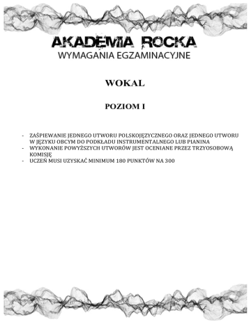 WOKAL POZIOM I -‐ ZAŚPIEWANIE JEDNEGO UTWORU POLSKOJĘZYCZNEGO ORAZ JEDNEGO UTWORU W JĘZYKU OBCYM DO PODKŁADU INSTRUMENTALNEGO LUB PIANINA -‐ WYKONANIE POWYŻSZYCH UTWORÓW JEST OCENIANE PRZEZ TRZYOSOBOWĄ KOMISJĘ -‐ UCZEŃ MUSI UZYSKAĆ MINIMUM 180 PUNKTÓW NA 300 WOKAL POZIOM II -‐ ZAŚPIEWANIE JEDNEGO UTWORU POLSKOJĘZYCZNEGO ORAZ JEDNEGO UTWORU W JĘZYKU OBCYM DO PODKŁADU INSTRUMENTALNEGO Z WYKORZYSTANIEM MIKROFONU I NAGŁOŚNIENIA -‐ WYKONANIE POWYŻSZYCH UTWORÓW JEST OCENIANE PRZEZ TRZYOSOBOWĄ KOMISJĘ -‐ UCZEŃ MUSI UZYSKAĆ MINIMUM 210 PUNKTÓW NA 300 WOKAL POZIOM III -‐ ZAŚPIEWANIE JEDNEGO UTWORU POLSKOJĘZYCZNEGO ORAZ JEDNEGO UTWORU W JĘZYKU OBCYM Z AKOMPANIAMENTEM ZESPOŁU (PERKUSJA, BAS, GITARA) -‐ WYKONANIE POWYŻSZYCH UTWORÓW JEST OCENIANE PRZEZ TRZYOSOBOWĄ KOMISJĘ -‐ UCZEŃ MUSI UZYSKAĆ MINIMUM 240 PUNKTÓW NA 300 -‐ UŁOŻENIE LINII WOKALU DO NIEZNANEGO WCZEŚNIEJ PODKŁADU WOKAL POZIOM IV -‐ NAGRANIE LINII WOKALU DO JEDNEGO UTWORU POLSKOJĘZYCZNEGO ORAZ JEDNEGO UTWORU W JĘZYKU OBCYM (SZKOŁA ZAPEWNIA STUDIO) -‐ NAPISANIE I NAGRANIE WŁASNEJ LINII WOKALU DO PODANEGO WCZEŚNIEJ PODKŁADU (SZKOŁA ZAPEWNIA STUDIO)