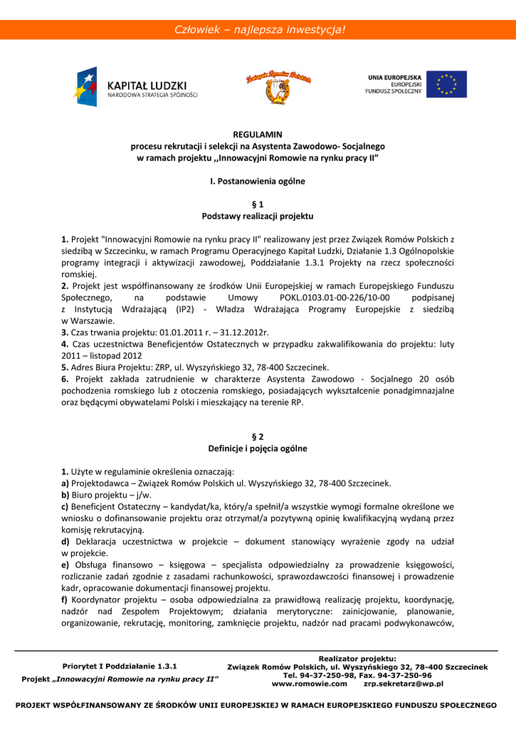 Człowiek – najlepsza inwestycja! REGULAMIN procesu rekrutacji i selekcji na Asystenta Zawodowo- Socjalnego w ramach projektu ,,Innowacyjni Romowie na rynku pracy II” I. Postanowienia ogólne §1 Podstawy realizacji projektu 1. Projekt "Innowacyjni Romowie na rynku pracy II" realizowany jest przez Związek Romów Polskich z siedzibą w Szczecinku, w ramach Programu Operacyjnego Kapitał Ludzki, Działanie 1.3 Ogólnopolskie programy integracji i aktywizacji zawodowej, Poddziałanie 1.3.1 Projekty na rzecz społeczności romskiej. 2. Projekt jest współfinansowany ze środków Unii Europejskiej w ramach Europejskiego Funduszu Społecznego, na podstawie Umowy POKL.0103.01-00-226/10-00 podpisanej z Instytucją Wdrażającą (IP2) - Władza Wdrażająca Programy Europejskie z siedzibą w Warszawie. 3. Czas trwania projektu: 01.01.2011 r. – 31.12.2012r. 4. Czas uczestnictwa Beneficjentów Ostatecznych w przypadku zakwalifikowania do projektu: luty 2011 – listopad 2012 5. Adres Biura Projektu: ZRP, ul. Wyszyoskiego 32, 78-400 Szczecinek. 6. Projekt zakłada zatrudnienie w charakterze Asystenta Zawodowo - Socjalnego 20 osób pochodzenia romskiego lub z otoczenia romskiego, posiadających wykształcenie ponadgimnazjalne oraz będącymi obywatelami Polski i mieszkający na terenie RP. §2 Definicje i pojęcia ogólne 1. Użyte w regulaminie określenia oznaczają: a) Projektodawca – Związek Romów Polskich ul. Wyszyoskiego 32, 78-400 Szczecinek. b) Biuro projektu – j/w. c) Beneficjent Ostateczny – kandydat/ka, który/a spełnił/a wszystkie wymogi formalne określone we wniosku o dofinansowanie projektu oraz otrzymał/a pozytywną opinię kwalifikacyjną wydaną przez komisję rekrutacyjną. d) Deklaracja uczestnictwa w projekcie – dokument stanowiący wyrażenie zgody na udział w projekcie. e) Obsługa finansowo – księgowa – specjalista odpowiedzialny za prowadzenie księgowości, rozliczanie zadao zgodnie z zasadami rachunkowości, sprawozdawczości finansowej i prowadzenie kadr, opracowanie dokumentacji finansowej projektu. f) Koordynator projektu – osoba odpowiedzialna za prawidłową realizację projektu, koordynację, nadzór nad Zespołem Projektowym; działania merytoryczne: zainicjowanie, planowanie, organizowanie, rekrutację, monitoring, zamknięcie projektu, nadzór nad pracami podwykonawców, Priorytet I Poddziałanie 1.3.1 Projekt „Innowacyjni Romowie na rynku pracy II” Realizator projektu: Związek Romów Polskich, ul. Wyszyńskiego 32, 78-400 Szczecinek Tel. 94-37-250-98, Fax. 94-37-250-96 www.romowie.com [email protected] PROJEKT WSPÓŁFINANSOWANY ZE ŚRODKÓW UNII EUROPEJSKIEJ W RAMACH EUROPEJSKIEGO FUNDUSZU SPOŁECZNEGO Człowiek – najlepsza inwestycja! dobór podwykonawców, zarządzanie czasem, ryzykiem, kosztami, zmianami, współpraca przy sporządzaniu raportów, sprawozdao, wniosków o płatnośd, rozliczanie projektu. g) Asystent ds. wdrażania projektu - odpowiedzialny za przygotowanie dokumentacji sprawozdawczej dotyczącej spraw merytorycznych, prowadzenie sekretariatu projektu, przygotowanie dokumentacji, kompletowanie i archiwizowanie rachunków i faktur, przygotowanie techniczne i monitoring szkoleo, czynności administracyjno – organizacyjne. h) Specjalista ds. promocji – osoba odpowiedzialna za prowadzenie rozmów informacyjno – promocyjnych, opracowanie materiałów inf - prom., kontakt z mediami, aktualizację stron www, organizację konferencji podsumowującej. i) Kandydat/ka – osoba ubiegająca się o zakwalifikowanie do udziału w projekcie. j) Komisja Rekrutacyjna – Zespół Projektowy. l) Projekt – należy przez to rozumied projekt p.n. „Innowacyjni Romowie na rynku pracy II”, realizowany w ramach Programu Operacyjnego Kapitał Ludzki 2007-2013, Działanie 1.3: Ogólnopolskie programy integracji i aktywizacji zawodowej, Poddziałanie 1.3.1: Projekty na rzecz społeczności romskiej. ł) Prezes – osoba odpowiedzialna za zarządzanie całością projektu oraz za jego stały nadzór. m) Pracownicy administracyjno – techniczni i monitoringu – odpowiedzialni za rekrutację, selekcję Beneficjentów, tworzenie baz danych uczestników, monitoring pracy A Z - S na podstawie dostarczonej przez nich dokumentacji, kontrolę w terenie, systematyczne gromadzenie informacji na temat działania, właściwości i rezultatów. n) Webmaster – pracownik odpowiedzialny za obsługę podstrony internetowej projektu i opracowanie graficzne materiałów promocyjnych oraz administrację sieci komputerowej projektu. o) Zespół Projektowy – koordynator projektu, asystent ds. wdrażania, pracownik administracyjno techniczny i ds. monitoringu, pracownik obsługi finansowej, prawnik, specjalista ds. promocji. p) Asystent Zawodowo - Socjalny – osoba świadcząca usługi na rzecz bezrobotnych Romów - osoba pochodzenia romskiego lub z otoczenia, zatrudniona w oparciu o umowę zlecenie, która w ramach realizacji projektu działad będzie na rzecz społeczności romskiej na terenie Polski, w szczególności na terenie miejsca zamieszkania. 2. Regulamin Projektu określa zasady uczestnictwa w projekcie, w szczególności: a) Przepisy ogólne. b) Cel projektu. c) Zasady udziału w projekcie. d) Proces rekrutacyjny. e) Zasady rezygnacji z uczestnictwa w projekcie. 3. Ogólny nadzór nad realizacją Projektu oraz rozstrzyganie spraw nieuregulowanych w regulaminie należy do kompetencji Koordynatora Projektu oraz prezesa Związku Romów Polskich z siedzibą w Szczecinku. Priorytet I Poddziałanie 1.3.1 Projekt „Innowacyjni Romowie na rynku pracy II” Realizator projektu: Związek Romów Polskich, ul. Wyszyńskiego 32, 78-400 Szczecinek Tel. 94-37-250-98, Fax. 94-37-250-96 www.romowie.com [email protected] PROJEKT WSPÓŁFINANSOWANY ZE ŚRODKÓW UNII EUROPEJSKIEJ W RAMACH EUROPEJSKIEGO FUNDUSZU SPOŁECZNEGO Człowiek – najlepsza inwestycja! §3 Cel projektu 1. Celem ogólnym projektu jest aktywizacja zawodowo – społeczna bezr