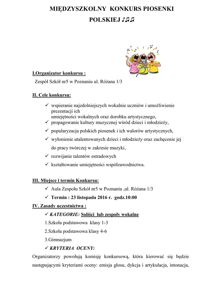 MIĘDZYSZKOLNY KONKURS PIOSENKI POLSKIEJ ♪♫♫ I.Organizator konkursu : Zespół Szkół nr5 w Poznaniu ul. Różana 1/3 II. Cele konkursu: wspieranie najzdolniejszych wokalnie uczniów i umożliwienie prezentacji ich umiejętności wokalnych oraz dorobku artystycznego, propagowanie kultury muzycznej wśród dzieci i młodzieży, popularyzacja polskich piosenek i ich walorów artystycznych, wyłonienie utalentowanych dzieci i młodzieży oraz zachęcenie jej do pracy twórczej w zakresie muzyki, rozwijanie talentów estradowych kształtowanie umiejętności współzawodnictwa. III. Miejsce i termin Konkursu: Aula Zespołu Szkół nr5 w Poznaniu ,ul. Różana 1/3 Termin : 23 listopada 2016 r. godz.10:00 IV. Zasady uczestnictwa : KATEGORIE: Soliści lub zespoły wokalne 1.Szkoła podstawowa klasy 1-3 2.Szkoła podstawowa klasy 4-6 3.Gimnazjum KRYTERIA OCENY: Organizatorzy powołują komisję konkursową, która kierować się będzie następującymi kryteriami oceny: emisja głosu, dykcja i artykulacja, intonacja, rytmika, frazowanie, zróżnicowanie dynamiki, agogika, barwa, dobór repertuaru, interpretacja, wyraz artystyczny. V. Przebieg konkursu i nagrody: Każdy uczestnik prezentuje jeden utwór. Podczas przesłuchań organizatorzy konkursu zapewniają nagłośnienie, pianino, magnetofon, odtwarzacz CD, laptop (dopuszcza się półplaybacki). Wszyscy uczestnicy otrzymają dyplomy uczestnictwa. Jury powołane przez organizatora przyzna 3 miejsca w każdej kategorii wiekowej oraz GRAND PRIX w wysokości 150 zł VI. Zgłoszenia: Czytelnie wypełnioną kartę zgłoszenia prosimy dostarczyć do 07 listopada 2016 r. pocztą elektroniczną [email protected] lub fax:618351417 Dodatkowe informacje dotyczące konkursu można uzyskać u koordynatorów konkursu: Agnieszka Małecka Tel.605-189-515 ;Ewa Mika Tel.604-433-276 VII. Ustalenia końcowe: 1. Organizatorzy zastrzegają sobie prawa do rejestracji i publikacji wykonań konkursowych, jak i koncertu finałowego. 2. Uczestnicy konkursu przyjeżdżają na koszt własny. Serdecznie zapraszamy! Organizatorzy Konkurs finansowany jest ze środków otrzymanych od Rady Osiedla Wilda z udziałem Miasta Poznania.