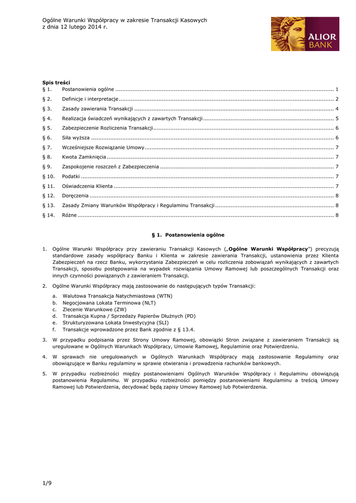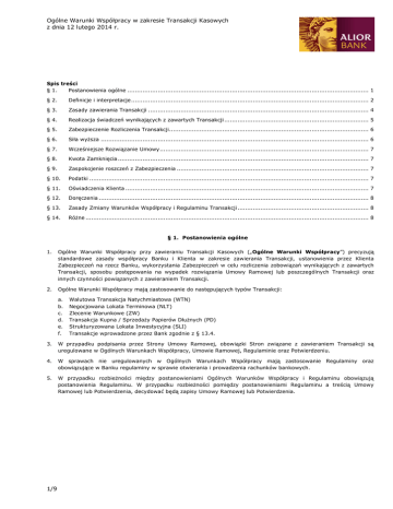 Ogólne Warunki Współpracy w zakresie Transakcji Kasowych z dnia 12 lutego 2014 r. Spis treści § 1. Postanowienia ogólne ............................................................................................................................... 1 § 2. Definicje i interpretacje ............................................................................................................................. 2 § 3. Zasady zawierania Transakcji .................................................................................................................... 4 § 4. Realizacja świadczeń wynikających z zawartych Transakcji ............................................................................ 5 § 5. Zabezpieczenie Rozliczenia Transakcji ......................................................................................................... 6 § 6. Siła wyższa ............................................................................................................................................. 6 § 7. Wcześniejsze Rozwiązanie Umowy .............................................................................................................. 7 § 8. Kwota Zamknięcia .................................................................................................................................... 7 § 9. Zaspokojenie roszczeń z Zabezpieczenia ..................................................................................................... 7 § 10. Podatki ................................................................................................................................................... 7 § 11. Oświadczenia Klienta ................................................................................................................................ 7 § 12. Doręczenia .............................................................................................................................................. 8 § 13. Zasady Zmiany Warunków Współpracy i Regulaminu Transakcji ..................................................................... 8 § 14. Różne ..................................................................................................................................................... 8 § 1. Postanowienia ogólne 1. Ogólne Warunki Współpracy przy zawieraniu Transakcji Kasowych („Ogólne Warunki Współpracy”) precyzują standardowe zasady współpracy Banku i Klienta w zakresie zawierania Transakcji, ustanowienia przez Klienta Zabezpieczeń na rzecz Banku, wykorzystania Zabezpieczeń w celu rozliczenia zobowiązań wynikających z zawartych Transakcji, sposobu postępowania na wypadek rozwiązania Umowy Ramowej lub poszczególnych Transakcji oraz innych czynności powiązanych z zawieraniem Transakcji. 2. Ogólne Warunki Współpracy mają zastosowanie do następujących typów Transakcji: a. b. c. d. e. f. Walutowa Transakcja Natychmiastowa (WTN) Negocjowana Lokata Terminowa (NLT) Zlecenie Warunkowe (ZW) Transakcja Kupna / Sprzedaży Papierów Dłużnych (PD) Strukturyzowana Lokata Inwestycyjna (SLI) Transakcje wprowadzone przez Bank zgodnie z § 13.4. 3. W przypadku podpisania przez Strony Umowy Ramowej, obowiązki Stron związane z zawieraniem Transakcji są uregulowane w Ogólnych Warunkach Współpracy, Umowie Ramowej, Regulaminie oraz Potwierdzeniu. 4. W sprawach nie uregulowanych w Ogólnych Warunkach Współpracy mają zastosowanie Regulaminy oraz obowiązujące w Banku regulaminy w sprawie otwierania i prowadzenia rachunków bankowych. 5. W przypadku rozbieżności między postanowieniami Ogólnych Warunków Współpracy i Regulaminu obowiązują postanowienia Regulaminu. W przypadku rozbieżności pomiędzy postanowieniami Regulaminu a treścią Umowy Ramowej lub Potwierdzenia, decydować będą zapisy Umowy Ramowej lub Potwierdzenia. 1/9 Ogólne Warunki Współpracy w zakresie Transakcji Kasowych z dnia 12 lutego 2014 r. § 2. Definicje i interpretacje 1. Stosowane w Warunkach Współpracy określenia mają następujące znaczenie: Bank – Alior Bank S.A. z siedzibą w Warszawie. Dodatkowe Parametry Transakcji – dopuszczalne Regulaminem lub Ogólnymi Warunkami Współpracy domyślne Parametry Transakcji, których uzgodnienie nie jest konieczne do zawarcia Transakcji. Dokumenty – Umowa Ramowa, Regulamin Transakcji, Ogólne Warunki Współpracy, Potwierdzenie oraz inne dokumenty z nimi powiązane. Dzień Roboczy – dzień, który nie jest dniem wolnym od pracy w Polsce i jest datą rozliczeniową dla Waluty Bazowej i Waluty Niebazowej. Dzień Rozliczenia – dzień, w którym następuje rozliczenie Transakcji. Dzień Ustalenia Parametrów Transakcji – dzień, w którym następuje ustalenie co najmniej Istotnych Parametrów Transakcji, który jest jednocześnie dniem zawarcia Transakcji. Dzień Wcześniejszego Rozwiązania Umowy – dzień Wcześniejszego Rozwiązania Umowy określony w § 7. Istotne Parametry Transakcji – Parametry Transakcji, które muszą zostać uzgodnione między Stronami w Dniu Ustalenia Parametrów Transakcji. Karta Informacyjna – podpisana przez Klienta lista osób upoważnionych przez Klienta do zawierania Transakcji z Bankiem. Kategoria Klienta – kategoria zgodna z klasyfikacją klientów zawartą w MiFID, wprowadzająca rozróżnienia na klienta detalicznego, klienta profesjonalnego oraz uprawnionego kontrahenta. Kaucja – kwota środków pieniężnych, przekazana z rachunku Klienta na dedykowany rachunek Banku w celu zabezpieczenia roszczeń związanych z zawartymi przez Strony Transakcjami, a którą Bank jest zobowiązany zwrócić Klientowi po uzyskaniu spłaty wszystkich świadczeń z Transakcji. Klient – osoba fizyczna, w tym osoba fizyczna prowadząca działalność gospodarczą, jednostka organizacyjna nieposiadająca osobowości prawnej lub osoba prawna zawierająca Transakcję z Bankiem. Konsument – osoba fizyczna dokonująca czynności prawnej niezwiąza