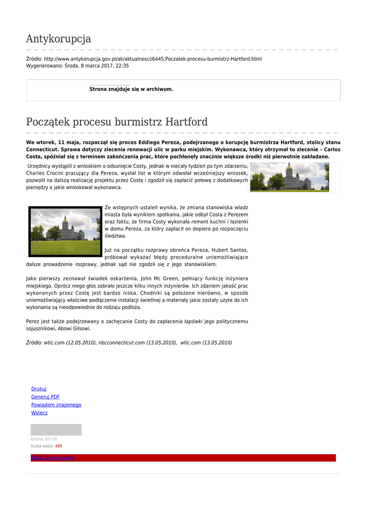 Antykorupcja Źródło: http://www.antykorupcja.gov.pl/ak/aktualnosci/6445,Poczatek-procesu-burmistrz-Hartford.html Wygenerowano: Środa, 8 marca 2017, 22:35 Strona znajduje się w archiwum. Początek procesu burmistrz Hartford We wtorek, 11 maja, rozpoczął się proces Eddiego Pereza, podejrzanego o korupcję burmistrza Hartford, stolicy stanu Connecticut. Sprawa dotyczy zlecenia renowacji ulic w parku miejskim. Wykonawca, który otrzymał to zlecenie – Carlos Costa, spóźniał się z terminem zakończenia prac, które pochłonęły znacznie większe środki niż pierwotnie zakładano. Urzędnicy wystąpili z wnioskiem o odsunięcie Costy, jednak w niecały tydzień po tym zdarzeniu, Charles Crocini pracujący dla Pereza, wysłał list w którym odwołał wcześniejszy wniosek, pozwolił na dalszą realizację projektu przez Costę i zgodził się zapłacić połowę z dodatkowych pieniędzy o jakie wnioskował wykonawca. Ze wstępnych ustaleń wynika, że zmiana stanowiska władz miasta była wynikiem spotkania, jakie odbył Costa z Perezem oraz faktu, że firma Costy wykonała remont kuchni i łazienki w domu Pereza, za który zapłacił on dopiero po rozpoczęciu śledztwa. Już na początku rozprawy obrońca Pereza, Hubert Santos, próbował wykazać błędy proceduralne uniemożliwiające dalsze prowadzenie rozprawy, jednak sąd nie zgodził się z jego stanowiskiem. Jako pierwszy zeznawał świadek oskarżenia, John Mc Green, pełniący funkcję inżyniera miejskiego. Oprócz niego głos zabrało jeszcze kilku innych inżynierów. Ich zdaniem jakość prac wykonanych przez Costę jest bardzo niska. Chodniki są położone nierówno, w sposób uniemożliwiający właściwe podłączenie instalacji świetlnej a materiały jakie zostały użyte do ich wykonania są nieodpowiednie do rodzaju podłoża. Perez jest także podejrzewany o zachęcanie Costy do zapłacenia łapówki jego politycznemu sojusznikowi, Abowi Gilsowi. Źródło: wtic.com (12.05.2010), nbcconnecticut.com (13.05.2010), wtic.com (13.05.2010) Drukuj Generuj PDF Powiadom znajomego Wstecz Ocena: 0/5 (0) liczba wejść: 499 Stany Zjednoczone Komentarz (0) dodaj komentarz Brak komentarzy dodaj komentarz