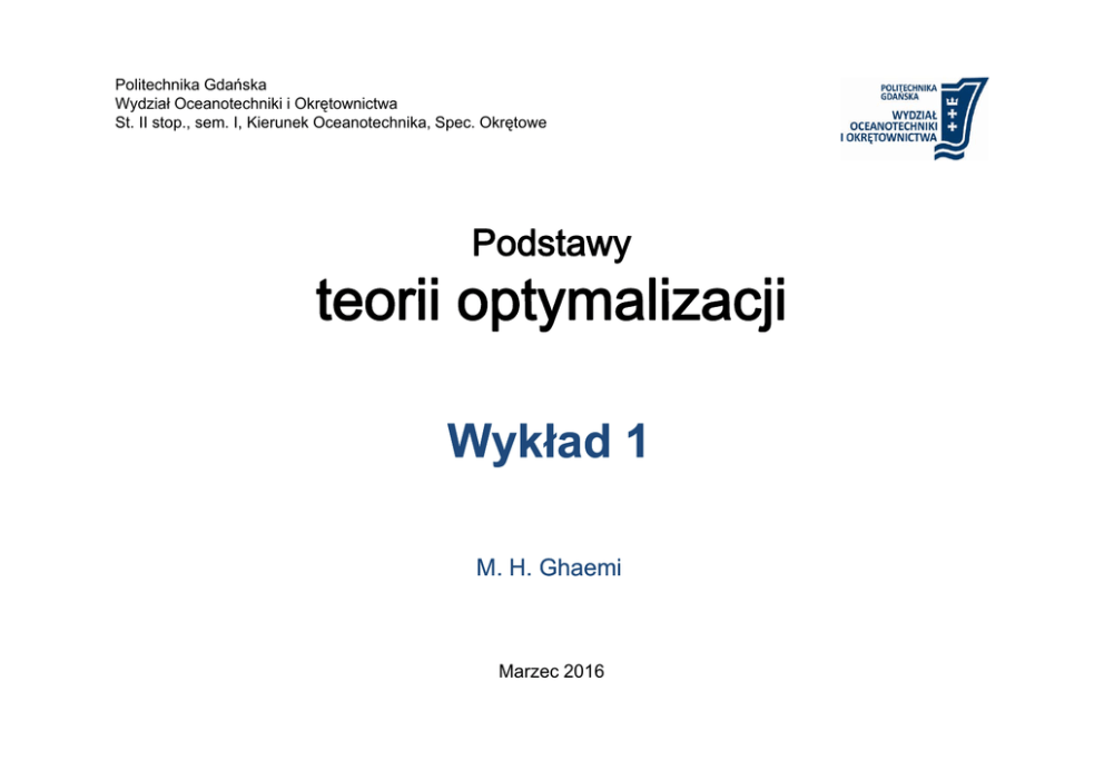Politechnika Gdańska Wydział Oceanotechniki i Okrętownictwa St II stop., St. stop sem. sem I, I Kierunek Oceanotechnika, Oceanotechnika Spec Spec. Okrętowe Podstawy teorii optymalizacji Wykład 1 M H. M. H Ghaemi Marzec 2016 Podstawy teorii optymalizacji Oceanotechnika, II stop., sem. I 1 Semestr 2-2015/ 2015/16 Literatura: 1. Podstawy optymalizacji, F. Milkiewicz, Wydawnictwo Politechniki Gdańskiej, 1995. 2. Podstawy metod optymalizacji, K. Amborski, Oficyna Wydawnicza Politechniki Warszawskiej, ISBN 978-83-7207-794-3, 2009 3. Podstawy optymalizacji, A. Stachurski, A. Wierzbicki, Oficyna Wydawnicza Politechniki Warszawskiej, ISBN: 83-7207-247-7, 2001 4. Optimal control and estimation, R. F. stengel, Dover Publ. Inc., 1994. Zasady zaliczenia: Ocena z ćw ćw.:: 50% - zaliczenie ćw. ćw jest wymagane Ocena z egzaminu: 50% Obecność: 5 pkt. Maks.: 105 pkt. p Min. wymagane: 56 pkt. (przy czym wymagane jest zaliczenie ćw.) Podstawy teorii optymalizacji Oceanotechnika, II stop., sem. I 2 Terminy: Studia stacjonarne Sesja podstawowa: 17.06.2016 r., godz. 14.30 sala 213 Sesja poprawkowa: 15 09 2016 r., 15.09.2016 r godz godz. 10.00 10 00 sala 213 Studia niestacjonarne Sesja podstawowa: 17.06.2016 r., godz. 16.00 sala 213 Sesja poprawkowa: 16.09.2016 r.,, godz. g 16.00 sala 213 Konsultacje: wtorki i piątki: 12:15 - 13:00 pok. 222A , Wydział Oceanotechniki i Okrętownictwa PG Podstawy teorii optymalizacji Oceanotechnika, II stop., sem. I 3 Zakres tematyczny przedmiotu 1. Wprowadzenie 1 Definicje i podstawowe pojęcia, sformułowanie problemów optymalizacyjnych, klasyfikacja zadań optymalizacyjnych, dobór kryterium optymalności 2. Statyczne problemy optymalizacyjne liniowo 2 liniowo-deterministyczne deterministyczne Warunek optymalności, gradient i Hessian, rozwiązanie optymalne, programowanie liniowe, metody optymalizacji ciągłych wielowymiarowych problemów liniowych bez ograniczeń oraz z ograniczeniami m.in. metoda graficzna oraz metoda simplex, przykłady zastosowania 3. Statyczne problemy optymalizacyjne nieliniowo-deterministyczne Programowanie nieliniowe, metody optymalizacji ciągłych wielowymiarowych problemów nieliniowych bez ograniczeń oraz z ograniczeniami m.in. metoda nieoznaczonych mnożników Lagrange’a, problem programowania kwadratowego, kwadratowego przykłady zastosowania 4. Optymalizacja dynamiczna Zasada optymalności Bellmana, równanie Hamilton-Jacobi-Bellmann, zasada maksimum, dynamiczne problemy optymalizacyjnych bez ograniczeń oraz z ograniczeniami ograniczeniami, metoda LQR, LQR przykłady zastosowania 5. Optymalizacja wielokryterialna Metoda optymalizacji wielokryterialnej, wybór kryteria optymalności dla systemu elektroenergetycznego, przykłady zastosowania 6. Wstęp do metod numerycznych rozwiązania problemów optymalizacyjnych Poszukiwanie opt. w kierunku, metoda złotego podziału, metody bezgradientowe i gradientowe poszukiwania ekstremum funkcji wielu zmiennych 7. Optymalizacja za pomocą algorytmów ewolucyjnych Podstawy teorii optymalizacji Oceanotechnika, II stop., sem. I 4 1. Wprowadzenie Opt mali acja! Optymalizacja! 1. 2. 3. 4 4. 5. 6. 7. 8. 9 9. Wiele skojarzeń znaczeniowych Sformułowanie problemu (często niedokładnego zadania) Zbiór celów (zadań) Zbiór ograniczeń (naturalne lub nakładane) Zbiór ograniczeń (naturalne lub nakładane) Model matematyczny problemu Algorytmy (metody) Rozwiązanie (logiczne, racjonalne, zbieżne, unikalne) Narzędzi obliczeniowe, oprogramowania Interpretacja i weryfikacja Interpretacja i weryfikacja Podstawy teorii optymalizacji Oceanotechnika, II stop., sem. I 5 • Definicja: Zrealizowanie określonego zadania w sposób najlepszy w sensie zdefiniowanej miary jakości realizacji tego zadania przy j yj j g p y uwzględnieniu określonych ograniczeń • Cel: Znalezienie pewnej kombinacji zmiennych niezależnych, które minimalizują (lub maksymalizują) daną wielkość przy zachowaniu narzuconych lub istniejących ograniczeń. • Elementy: 1 Zadanie 1. Zadanie, 2. Miara jakości (funkcja kosztu, funkcjonał celu), 3. Zespół ograniczeń 3 espó og a c e Podstawy teorii optymalizacji Oceanotechnika, II stop., sem. I 6 Wstępne przykłady 2D i 3D Metoda eliminacji a/2 1. Okno: min. min materiału zużytego stała określona powierzchnia (ze względu na światła) b a 2. Puszka: max. Objętości stała określona powierzchnia (ze względu na zużytego materiału) Podstawy teorii optymalizacji Oceanotechnika, II stop., sem. I 2r l 7 y 3. Ogród: max. powierzchni ogrodu prostokątnego ograniczone pole 1 y = 1− x2 1 4. Restauracja: najbliższy punkt do miasta położona na określonej drogi y x 1 y= 2 x restauracja j miasto Podstawy teorii optymalizacji Oceanotechnika, II stop., sem. I x 8 5. Akwarium: Min. zużytego materiału Określona stała pojemność różne materiały? różne ceny? różne części? 6 Kula 6. K l w stożku: t żk min. objętości stożki określona ramiona kuli Podstawy teorii optymalizacji Oceanotechnika, II stop., sem. I 9