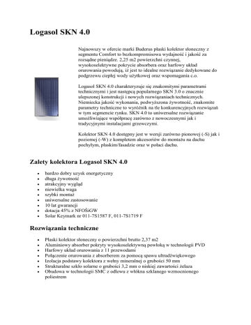 Logasol SKN 4.0 Najnowszy w ofercie marki Buderus płaski kolektor słoneczny z segmentu Comfort to bezkompromisowa wydajność i jakość za rozsądne pieniądze. 2,25 m2 powierzchni czynnej, wysokoselektywne pokrycie absorbera oraz harfowy układ orurowania powodują, iż jest to idealne rozwiązanie dedykowane do podgrzewu ciepłej wody użytkowej oraz wspomagania c.o. Logasol SKN 4.0 charakteryzuje się znakomitymi parametrami technicznymi i jest następcą popularnego SKN 3.0 o znacznie ulepszonej konstrukcji i nowych rozwiązaniach technicznych. Niemiecka jakość wykonania, podwyższona żywotność, znakomite parametry techniczne to wyróżnik na tle konkurencyjnych rozwiązań w tym segmencie rynku. SKN 4.0 to uniwersalne rozwiązanie umożliwiające współpracę zarówno z nowoczesnymi jak i tradycyjnymi instalacjami grzewczymi. Kolektor SKN 4.0 dostępny jest w wersji zarówno pionowej (-S) jak i poziomej (-W) z kompletem akcesoriów do montażu na dachu pochyłym, płaskim/fasadzie oraz w połaci dachu. Zalety kolektora Logasol SKN 4.0 • • • • • • • • • bardzo dobry uzysk energetyczny długa żywotność atrakcyjny wygląd niewielka waga szybki montaż uniwersalne zastosowanie 10 lat gwarancji dotacja 45% z NFOŚiGW Solar Keymark nr 011-7S1587 F, 011-7S1719 F Rozwiązania techniczne • • • • • • • Płaski kolektor słoneczny o powierzchni brutto 2,37 m2 Aluminiowy absorber pokryty wysokoselektywną powłoką w technologii PVD Harfowy układ orurowania z 11 przewodami Połączenie orurowania z absorberem za pomocą spawu ultradźwiękowego Izolacja podstawy kolektora z wełny mineralnej o grubości 50 mm Strukturalne szkło solarne o grubości 3,2 mm o niskiej zawartości żelaza Obudowa w technologii SMC z odlewu z włókna szklanego wzmocnionego poliestrem