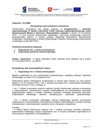 Projekt współfinansowany ze środków Europejskiego Funduszu Rozwoju Regionalnego oraz Budżetu Państwa w ramach Regionalnego Programu Operacyjnego Województwa Lubelskiego 2007- 2013, działanie 2.4 Marketing gospodarczy Schemat B Załącznik 1 do SIWZ Szczegółowy opis przedmiotu zamówienia Przedmiotem zamówienia jest usługa wsparcia w przygotowaniu i obsłudze ogólnopolskiego IV Zjazdu Latarników Polski Cyfrowej współorganizowanego przez Stowarzyszenie Miasta w Internecie i Województwo Lubelskie w dniach 14-15 września 2015 r. w celu promocji województwa lubelskiego i kreowania pozytywnego wizerunku gospodarczego regionu, w ramach projektu „Marketing Gospodarczy Województwa Lubelskiego” realizowanego w ramach Regionalnego Programu Operacyjnego Województwa Lubelskiego na lata 2007-2013. Przedmiot zamówienia obejmuje: I. II. Organizacja min. 3 stoisk promocyjnych. Organizacja spotkania networkingowego. Rodzaj wydarzenia: IV Zjazd Latarników Polski Cyfrowej, który odbędzie się w dniach 14-15 września 2015 r. w Lublinie. Szczegółowy opis poszczególnych części: I. Organizacja min. 3 stoisk promocyjnych. Miejsce wydarzenia (w tym powierzchnia wystawiennicza, bezpłatny parking): Zapewnia Zamawiający w dniach 14-15 września 2015 r. Wykonawca będzie zobowiązany zorganizować w ramach tego zadania na czas trwania Zjazdu tj. 14-15 września 2015 r. min. 2 stoiska promocyjne firm z województwa lubelskiego promujące branżę IT wraz z obsługą, tj. - min. 1 stoisko promocyjne powinno spełniać wymóg skutecznego sposobu promowania z wykorzystaniem nowoczesnych narzędzi multimedialnych do prezentowania potencjału gospodarczego regionu w postaci wirtualnej wycieczki, wirtualnej prezentacji panoramy województwa lubelskiego, terenów inwestycyjnych, potencjału gospodarczego. - min. 1 stoisko promocyjne spełniające wymogi skutecznego sposobu promowania województwa z wykorzystaniem nowoczesnych narzędzi multimedialnych w postaci animacji interaktywnych z wykorzystaniem czujników ruchu, komputera i projektorów. Ponadto: - w trakcie Zjazdu Wykonawca zapewni min. 1 stoisko promujące produkty regionalne województwa lubelskiego poprzez zapewnienie min. 6 różnych produktów regionalnych do konsumpcji (w uzgodnieniu z Zamawiającym). OP-IV.272.92.2015.AO Załącznik nr 1 do SIWZ – opis przedmiotu zamówienia. Strona 1 z 5 Projekt współfinansowany ze środków Europejskiego Funduszu Rozwoju Regionalnego oraz Budżetu Państwa w ramach Regionalnego Programu Operacyjnego Województwa Lubelskiego 2007- 2013, działanie 2.4 Marketing gospodarczy Schemat B Wykonawca w ramach każdego stoiska zapewni: stolik, przy którym będzie można prowadzić rozmowy z uczestnikami zjazdu, stolik okrągły ze szklanym lub plastikowym blatem (kolor biały) średnica blatu min. 60 cm, wysokość stolika dopasowana do wysokości krzeseł. Wykonawca zabezpieczy również po dwa krzesła do każdego ze stoisk. Krzesło z oparciem w kolorze białym o nowoczesnym wyglądzie. Minimalna powierzchnia jednego stoiska to 2-3 m2 (do ewentualnego uzgodnienia z Wykonawcą). Zamawiający zapewnia ściankę oraz lady, gdzie będzie można wyłożyć materiały promocyjne. Szczegółowe wymagania dot. wyglądu i wyposażenia stoiska : a) dostęp do elektryczności na stoisku (na min. 2 stoiskach co najmniej 8 gniazdek, umożliwiających podłączenie laptopów i innego sprzętu elektronicznego), b) bezpłatny, swobodny dostęp do bezprzewodowego Internetu na stoiskach dla wszystkich o prędkości minimum 8 Mb/s download i 1 Mb/s upload. c) meble na stoisku wysokiej jakości, nowe lub nienoszące śladów użytkowania, w tym co najmniej 1 stolik oraz 2 krzesła przy każdym stoisku. Meble muszą być utrzymane w stylu harmonizującym z kolorystyką i wystrojem stoiska (nowoczesne), wysokiej jakości materiałów oraz rozwiązań technicznych. Wykonawca zobowiązany jest do bieżącego utrzymania i obsługi technicznej stoisk przez cały okres trwania Zjazdu, obejmującej w szczególności zapewnienie sprawności wszystkich urządzeń znajdujących się na wyposażeniu stoisk, zapewnienie kompletności elementów wyposażenia stoisk, niezwłoczne usuwanie wszelkich wad i usterek przez cały czas trwania Zjazdu oraz bieżące utrzymanie czystości (sprzątanie) i estetyki stoisk. Wykonawca swoje czynności w ramach obsługi technicznej będzie realizował w sposób niekolidujący z funkcjonowaniem stoisk. Wykonawca przygotuje dla każdego uczestnika zjazdu zestaw upominkowy w postaci: cukierków „krówek lubelskich” z logotypem umieszczonym na papierku oraz na opakowaniu. Krówki pakowane w kartonowe ozdobne opakowanie w kształcie kuferka, w jednym opakowaniu min. 8 szt. Wymiar opakowania: 74 x 74 x 60 mm + część ozdobna. Krówki reklamowe pakowane są w powlekany papier etykietowy bądź w papier kreda, na którym wykonany jest druk reklamowy. Jedno opakowanie dla jednego uczestnika. min. 160, max. 230 osób. Oznakowanie powinno być zgodne z Systemem Identyfikacji Wizualnej Województwa Lubelskiego, dostępne na stronie www.lubelskie.pl oraz identyfikacją wizualną zgodną z wytycznymi unijnymi. II. Organizacja spotkania networkingowego. Termin: 14.09.2015 r. około godziny 19:00 Ilość osób: min. 160, max. 230 (Wykonawca nie odpowiada za rekrutację osób na spotkanie). Miejsce: Obiekt położony w Lublinie / województwie lubelskim, w odległości maksymalnie do 20 km od Lubelskiego Ratusza, z możliwością organizacji przyjęcia na świeżym powietrzu. Obiekt powinien być wyposażony w przestronny ogród z możliwością OP-IV.272.92.2015.AO Załącznik nr 1 do SIWZ – opis przedmiotu zamówienia. Strona 2 z 5 Projekt współfinansowany ze środków Europejskiego Funduszu Rozwoju Regionalnego oraz Budżetu Państwa w ramach Regionalnego Programu Operacyjnego Województwa Lubelskiego 2007- 2013, działanie 2.4 Marketing gospodarczy Schemat B przyrządzania potraw z grilla or