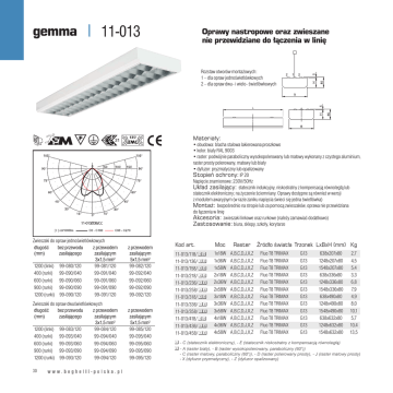 gemma 11-013 Oprawy nastropowe oraz zwieszane nie przewidziane do łączenia w linię p ą ę Rozstaw otworów montażowych: Rozstaw otworów montażowych: 1 –opraw dla opraw jednoświetlówkowych 1 – dla jednoświetlówkowych 2 –opraw dla opraw dwui wielo-świetlówkowych świetlówkowych 2 – dla dwui wielo- Materiały: Materiały: • obudowa: blacha stalowa lakierowana proszkowo • obudowa: blacha stalowa lakierowana proszkowo • kolor: biały RAL 9003 • kolor: biały RAL 9003 • raster: podwójnie paraboliczny wysokopolerowany lub matowy wykonany z czystego aluminium, • raster: podwójnie paraboliczny wysokopolerowany lub matowy wykonany z czystego aluraster prosty polerowany, matowy lub biały minium, raster prosty polerowany, matowy lub biały • dyfuzor: pryzmatyczny lub opalizowany • dyfuzor: pryzmatyczny lub opalizowany Stopień ochrony: IP 20 Stopień ochrony: IP 20 Napięcie znamionowe: 230V/50Hz Napięcie znamionowe: 230V/50Hz Układ zasilający: statecznik indukcyjny, niskostratny z kompensacją równoległą lub statecznik elektroniczny; na życzenie ściemniany. Oprawy dostępnez są również w wersji Układ zasilający: statecznik indukcyjny, niskostratny kompensacją równoległą lub z modułem awaryjnym (w raziena zaniku napięcia świeci się jedna dostępne świetlówka) statecznik elektroniczny; życzenie ściemniany. Oprawy są również w wersji Montaż: bezpośrednio lub zanapięcia pomocąświeci zwieszaków, oprawa nie przewidziana z modułem awaryjnym na (w stropie razie zaniku się jedna świetlówka) do łączenia w linię Montaż: bezpośrednio na stropie lub za pomocą zwieszaków, oprawa nie przewidziana Akcesoria: zwieszaki linkowe oraz rurkowe (należy zamawiać dodatkowo) do łączenia w linię Zastosowanie: biura, sklepy, szkoły, korytarze Zwieszaki do opraw jednoświetlówkowych długość dobez przewodu z przewodem z przewodem Zwieszaki opraw jednoświetlówkowych (mm) (mm)zasilającego Długość Bez przewoduzasilającym Z przewodemzasilającym Z przewodem 2 mm2 zasilającego 3x1,5 mm zasilającym 5x1,5zasilającym 1200 (linki) 99-080/120 99-081/120 5x1,5 mm2 3x1,5 mm2 99-082/120 400 (rurki) 1200 (linki) 400 600 (rurki) (rurki) 600 900 (rurki) (rurki) 900 (rurki) 1200 (rurki) 1200 (rurki) 99-090/040 99-080/120 99-091/040 99-081/12099-092/040 99-082/120 99-090/040 99-091/060 99-091/04099-092/060 99-092/040 99-090/060 99-090/060 99-091/090 99-091/06099-092/090 99-092/060 99-090/090 99-090/090 99-091/090 99-092/090 99-091/120 99-092/120 99-090/120 99-091/120 99-092/120 99-090/120 Zwieszaki do opraw dwuświetlówkowych Zwieszaki do opraw dwuświetlówkowych długość bez przewodu z przewodem z przewodem Długość (mm) Bez przewodu Z przewodem Z przewodem (mm) zasilającego zasilającym zasilającym zasilającego zasilającym zasilającym 3x1,5 mm2 5x1,5 mm2 3x1,5 mm2 5x1,5 mm2 1200 (linki) 99-083/120 99-084/120 99-085/120 1200 (linki) 400 (rurki) (rurki) 400 600 (rurki) (rurki) 600 900 900 (rurki) (rurki) 1200 (rurki) 1200 (rurki) 30 99-083/120 99-084/120 99-085/120 99-093/040 99-093/040 99-094/040 99-094/04099-095/040 99-095/040 99-093/060 99-093/060 99-094/060 99-094/06099-095/060 99-095/060 99-093/090 99-094/090 99-094/09099-095/090 99-095/090 99-093/090 99-093/120 99-094/120 99-094/120 99-095/120 99-095/120 99-093/120 Akcesoria: zwieszaki linkowe oraz rurkowe (należy zamawiać dodatkowo) Zastosowanie: biura, sklepy, szkoły, korytarze Kod art. Moc 11-013/118/ 1x18W A,B,C,D,J,X,Z Kod art. 11-013/118/ 12 11-013/136/ 12 11-013/158/ 11-013/158/ 12 11-013/218/ 11-013/218/ 12 11-013/236/ 11-013/236/ 12 11-013/258/ 11-013/258/ 12 11-013/318/ 11-013/318/ 12 11-013/336/ 11-013/336/ 12 11-013/358/ 11-013/358/ 12 11-013/418/ 11-013/418/ 12 11-013/436/ 11-013/436/ 12 11-013/458/ 11-013/458/ 12 11-013/136/ Moc 1x18W 1x36W 1x58W 1x58W 2x18W 2x18W 2x36W 2x36W 2x58W 2x58W 3x18W 3x18W 3x36W 3x36W 3x58W 3x58W 4x18W 4x18W 4x36W 4x36W 4x58W 4x58W Raster Źródło światła Trzonek LxBxH (mm) Kg Raster Źródło światła Trzonek LxBxH (mm) Kg A,B,C,D,J,X,Z A,B,C,D,J,X,Z A,B,C,D,J,X,Z A,B,C,D,J,X,Z A,B,C,D,J,X,Z A,B,C,D,J,X,Z A,B,C,D,J,X,Z A,B,C,D,J,X,Z A,B,C,D,J,X,Z A,B,C,D,J,X,Z A,B,C,D,J,X,Z A,B,C,D,J,X,Z A,B,C,D,J,X,Z A,B,C,D,J,X,Z A,B,C,D,J,X,Z A,B,C,D,J,X,Z A,B,C,D,J,X,Z A,B,C,D,J,X,Z A,B,C,D,J,X,Z A,B,C,D,J,X,Z A,B,C,D,J,X,Z A,B,C,D,J,X,Z 1x36W A,B,C,D,J,X,Z Fluo T8 TRIMAX Fluo T8 TRIMAX Fluo T8 TRIMAX Fluo T8 TRIMAX Fluo T8 TRIMAX Fluo T8 TRIMAX Fluo T8 TRIMAX Fluo T8 TRIMAX Fluo T8 TRIMAX Fluo T8 TRIMAX Fluo T8 TRIMAX Fluo T8 TRIMAX Fluo T8 TRIMAX Fluo T8 TRIMAX Fluo T8 TRIMAX Fluo T8 TRIMAX Fluo T8 TRIMAX Fluo T8 TRIMAX Fluo T8 TRIMAX Fluo T8 TRIMAX Fluo T8 TRIMAX Fluo T8 TRIMAX Fluo T8 TRIMAX Fluo T8 TRIMAX G13 G13 G13 G13 G13 G13 G13 G13 G13 G13 G13 G13 G13 G13 G13 G13 G13 G13 G13 G13 G13 G13 G13 G13 638x207x80 2,7 638x207x80 2,7 4,5 1248x207x80 4,5 1548x207x80 5,4 1548x207x80 5,4 638x336x80 3,3 638x336x80 3,3 1248x336x80 6,8 1248x336x80 6,8 1548x336x80 7,9 1548x336x80 7,9 638x490x80 4,9 638x490x80 4,9 1248x490x80 8,0 1248x490x80 8,0 1548x490x80 10,1 1548x490x80 10,1 638x632x80 5,7 638x632x80 5,7 1248x632x80 10,4 1248x632x80 10,4 1548x632x80 13,5 1548x632x80 13,5 1248x207x80 -- C (statecznik niskostratny niskostratnyzzkompensacją kompensacjąrównoległą) równoległą) 1 C (statecznik (statecznik elektroniczny), elektroniczny), -- EE (statecznik -- AA (raster paraboliczny(60° (60°)) 2 (raster biały), biały), -- B B (raster (raster wysokopolerowany, wysokopolerowany, paraboliczny )) -- CC (raster (raster matowy matowy prosty) prosty) (raster matowy, matowy, paraboliczny paraboliczny (60°)), (60°)), -- D D (raster (raster polerowany polerowany prosty), prosty), -- JJ (raster -- XX(dyfuzor (dyfuzor opalizowany) opalizowany) (dyfuzor pryzmatyczny), pryzmatyczny), -- Z Z (dyfuzor