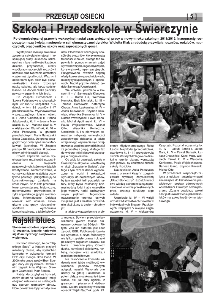 PRZEGLĄD OSIECKI [5] Szkoła i Przedszkole w Świerczynie Po dwumiesięcznej przerwie wakacyjnej nastał czas wytężonej pracy w nowym roku szkolnym 2011/2012. Inaugurację rozpoczęto mszą świętą, następnie w sali gimnastycznej dyrektor Wioletta Klak z radością przywitała: uczniów, rodziców, nauczycieli, pracowników szkoły oraz zaproszonych gości. Wystąpienie dyrekcji zawierało życzenia satysfakcjonującej i inspirującej pracy, sukcesów szkolnych na miarę możliwości każdego dziecka, przynoszącej efekty współpracy nauczycieli, rodziców i uczniów oraz tworzenia atmosfery wzajemnej życzliwości. Ważnymi odbiorcami tych słów byli pierwszoklasiści, którzy rozpoczęli naukę szkolną, ale także szóstoklasiści, na których czeka pierwszy poważny egzamin w ich życiu. Do Zespołu Przedszkole i Szkoła Podstawowa w roku szkolnym 2011/2012 uczęszcza 135 dzieci, w tym 88 uczniów i 47 przedszkolaków. Wychowawstwo w poszczególnych klasach objęli: kl. I – Anna Kubańda, kl. II – Hanna Jakubowska, kl. III – Joanna Marszałek, kl. IV – Marlena Graf, kl. V – Aleksander Glumiński, kl. VI – Anita Podrzycka. W grupach przedszkolnych: Maria Ratajczak i Beata Czabajska. Do grona pedagogicznego dołączyła Hanna Maćkowiak (technika). W Zespole pracuje 18 nauczycieli i 6 pracowników administracji i obsługi. Szkoła zapewnia swoim wychowankom możliwość uczestniczenia w zajęciach pozalekcyjnych, które rozwijają ich kreatywność, zainteresowania, a co najważniejsze kształtują pozytywne postawy i przygotowują do konstruktywnego działania na rzecz innych. Są to koła przedmiotowe: polonistyczne, historyczne, matematyczno - przyrodnicze, języka angielskiego, języka niemieckiego, informatyczne. Działają również: koło wokalne, ekologiczne oraz grupy rekreacyjnosportowe i wychowania komunikacyjnego, a także koło Ca- Rajski blues Słoneczne sobotnie popołudnie, 17 września, idealnie nadawało się do muzycznego świętowania w plenerze. Nic więc dziwnego, że do “Rajskiego Saduʼʼ w Kątach przybyli miłośnicy bluesa, aby wysłuchać koncertu w wykonaniu formacji BBB czyli Boogie Bron Band. W 2000 roku grupę założył Bron Saeger, który jest jej liderem. Razem z nim zagrali: Ania Wejman, Grzegorz Czarnecki i Piotr Soroka. Każdy kto przybył na koncert, zanim dotarł na “widownięʼʼ mógł obejrzeć ustawione na sztalugach trzy sporych rozmiarów obrazy, które powiązane były tematycznie ritas. Placówka w szczególny sposób dba o uczniów, którzy miewają trudności w nauce, dlatego też zapewnia im pomoc w ramach zajęć wyrównawczych, logopedycznych, korekcyjno-kompensacyjnych. Przygotowano również bogatą ofertę konkursów przedmiotowych, międzydyscyplinarnych i sportowych. Nadal prężnie działać będzie Samorząd Uczniowski. We wrześniu powołano w klasach II – VI Samorządy Klasowe: kl. II – Kamil Lis, Weronika Homska, Eryk Michalski, kl. III – Tobiasz Bartlewicz, Katarzyna Chuda, Anna Laskowska, kl. IV – Jacek Skowronek, Szymon Idkowiak, Weronika Biernacka, kl. V – Natalia Wawrzyniak, Paweł Banasik, Michał Apolinarski, kl. VI – Paula Wojciechowska, Michał Otto, Weronika Konieczna. Uczniowie kl. I w pierwszym semestrze nabywają umiejętności zespołowego działania, a także wzajemnego wspierania się i przejmowania współodpowiedzialności za jednostkę i grupę, dlatego też do wyboru trójki klasowej przystąpią w drugim okresie. Od wielu lat uczniowie szkoły w Świerczynie aktywnie uczestniczą w akcji „Sprzątanie Świata”, dlatego i tym razem dzieci wyposażone w worki i rękawiczki wyruszyły do najbliższych lasów, by tam zagościł ład i porządek natury, który bywa zakłócony bezmyślnością ludzi i aby wszystkie jego warstwy nadal zachwycały swym pięknem. Tegoroczne oczyszczanie terenów leśnych związane jest z hasłem przewodnim akcji „Lasy to życie – chrońmy je”, a także z włączeniem się w ob- z imprezą. Bowiem przedstawiały wizerunki gwiazd muzyki bluesowo-rockowej lat 60-tych i 70tych. Zaś ich autorem jest lider zespołu BBB. Publiczność bawiła się wybornie, o czym świadczyły nie tylko rzęsiste brawa i okrzyki po każdym zagranym kawałku, ale także… taneczne pląsy. Oprócz ducha, karmiono i ciało kawą, herbatą, napojami oraz szarlotką i plackiem drożdżowym. Na zakończenie koncertu widzowie mieli także możliwość wysłuchania popisów młodych adeptek muzyki. Wykonały one utwory na gitarę i akordeon. A potem dalsze muzykowanie i śpiewanie, ale już przy ognisku z grzańcem i pieczonymi kiełbaskami. Ostatni uczestnicy wieczoru opuścili “Rajski Sadʼʼ ok. godz. 23. chody Międzynarodowego Roku Lasów. Najmłodsi (przedszkolaki, uczniowie kl. I - III) przygotowują swoich starszych kolegów do działań w terenie, dlatego wyruszają jako pierwsi, by uprzątnąć okolice szkoły i kościoła. Nauczycielka Anita Podrzycka wraz z uczniami klasy VI zorganizowała wystawę zatytułowaną „Układ Słoneczny”. Szóstoklasiści swą wiedzę astronomiczną zaprezentowali w formie przestrzennych prac, tworząc strukturę tego układu. Uczniowie kl. IV – VI wzięli udział w Mistrzostwach Powiatu w Indywidualnych Biegach Przełajowych. Najlepsze V miejsce zajęła uczennica kl. V – Aleksandra Kasprzak. Pozostali uczestnicy to: kl. IV – Jakub Banasik, Jakub Gała, kl. V – Paweł Banasik, Łukasz Chudziński, Kamil Mróz, Wojciech Pawel, kl. V – Weronika Konieczna, Paula Wojciechowska, Bartosz Gano, Szymon Kmiecik, Michał Otto. W przedszkolu rozpoczęto zajęcia z edukacji antynikotynowej zmierzające do kształtowania prawidłowych postaw zdrowotnych wśród dzieci. Głównym celem programu „Czyste powietrze wokół nas” jest uwrażliwienie przedszkolaków na szkodliwość dymu tytoniowego.