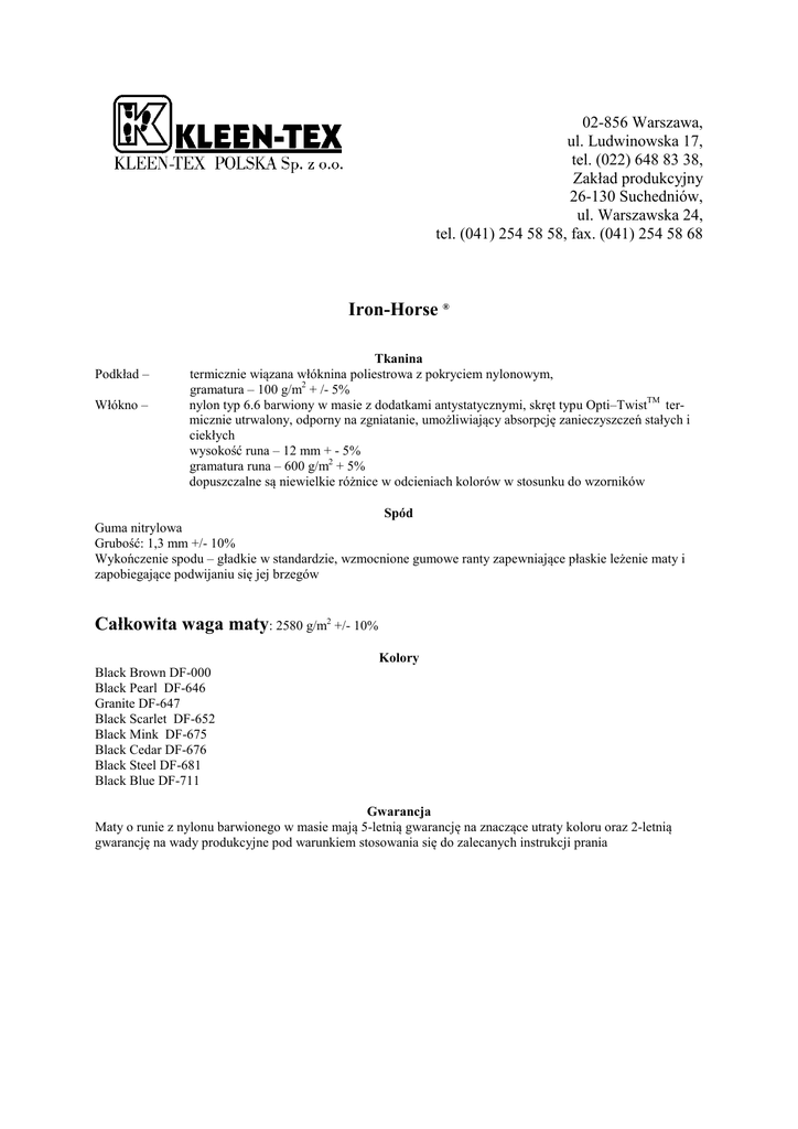02-856 Warszawa, ul. Ludwinowska 17, tel. (022) 648 83 38, Zakład produkcyjny 26-130 Suchedniów, ul. Warszawska 24, tel. (041) 254 58 58, fax. (041) 254 58 68 Iron-Horse ® Podkład – Włókno – Tkanina termicznie wiązana włóknina poliestrowa z pokryciem nylonowym, gramatura – 100 g/m2 + /- 5% nylon typ 6.6 barwiony w masie z dodatkami antystatycznymi, skręt typu Opti–TwistTM termicznie utrwalony, odporny na zgniatanie, umożliwiający absorpcję zanieczyszczeń stałych i ciekłych wysokość runa – 12 mm + - 5% gramatura runa – 600 g/m2 + 5% dopuszczalne są niewielkie różnice w odcieniach kolorów w stosunku do wzorników Spód Guma nitrylowa Grubość: 1,3 mm +/- 10% Wykończenie spodu – gładkie w standardzie, wzmocnione gumowe ranty zapewniające płaskie leżenie maty i zapobiegające podwijaniu się jej brzegów Całkowita waga maty: 2580 g/m2 +/- 10% Kolory Black Brown DF-000 Black Pearl DF-646 Granite DF-647 Black Scarlet DF-652 Black Mink DF-675 Black Cedar DF-676 Black Steel DF-681 Black Blue DF-711 Gwarancja Maty o runie z nylonu barwionego w masie mają 5-letnią gwarancję na znaczące utraty koloru oraz 2-letnią gwarancję na wady produkcyjne pod warunkiem stosowania się do zalecanych instrukcji prania