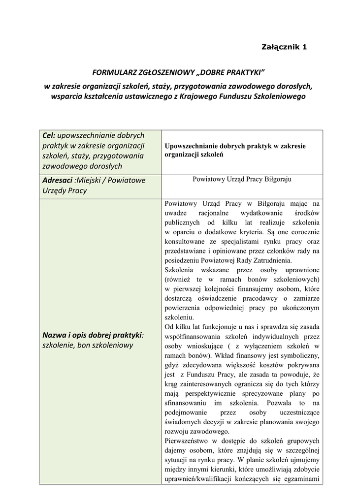 Załącznik 1 FORMULARZ ZGŁOSZENIOWY „DOBRE PRAKTYKI” w zakresie organizacji szkoleń, staży, przygotowania zawodowego dorosłych, wsparcia kształcenia ustawicznego z Krajowego Funduszu Szkoleniowego Cel: upowszechnianie dobrych praktyk w zakresie organizacji szkoleń, staży, przygotowania zawodowego dorosłych Adresaci :Miejski / Powiatowe Urzędy Pracy Nazwa i opis dobrej praktyki: szkolenie, bon szkoleniowy Upowszechnianie dobrych praktyk w zakresie organizacji szkoleń Powiatowy Urząd Pracy Biłgoraju Powiatowy Urząd Pracy w Biłgoraju mając na uwadze racjonalne wydatkowanie środków publicznych od kilku lat realizuje szkolenia w oparciu o dodatkowe kryteria. Są one corocznie konsultowane ze specjalistami rynku pracy oraz przedstawiane i opiniowane przez członków rady na posiedzeniu Powiatowej Rady Zatrudnienia. Szkolenia wskazane przez osoby uprawnione (również te w ramach bonów szkoleniowych) w pierwszej kolejności finansujemy osobom, które dostarczą oświadczenie pracodawcy o zamiarze powierzenia odpowiedniej pracy po ukończonym szkoleniu. Od kilku lat funkcjonuje u nas i sprawdza się zasada współfinansowania szkoleń indywidualnych przez osoby wnioskujące ( z wyłączeniem szkoleń w ramach bonów). Wkład finansowy jest symboliczny, gdyż zdecydowana większość kosztów pokrywana jest z Funduszu Pracy, ale zasada ta powoduje, że krąg zainteresowanych ogranicza się do tych którzy mają perspektywicznie sprecyzowane plany po sfinansowaniu im szkolenia. Pozwala to na podejmowanie przez osoby uczestniczące świadomych decyzji w zakresie planowania swojego rozwoju zawodowego. Pierwszeństwo w dostępie do szkoleń grupowych dajemy osobom, które znajdują się w szczególnej sytuacji na rynku pracy. W planie szkoleń ujmujemy między innymi kierunki, które umożliwiają zdobycie uprawnień/kwalifikacji kończących się egzaminami państwowymi, nadającymi tytuły czeladnika w zawodzie. Często są to uprawnienia honorowane na terenie UE. Nasze kilkuletnie doświadczenia potwierdzają, że wprowadzenie dodatkowych kryteriów, w tym współfinansowania spowodowało napływ wniosków przemyślanych, co w efekcie zwiększyło racjonalne wydatkowanie środków publicznych i znacznie podwyższyło poziom efektywności zatrudnieniowej. Nazwa realizatora: Strona internetowa: Osoba upoważniona do kontaktu (imię, nazwisko, telefon, e-mail): Powiatowy Urząd Pracy 23 – 400 Biłgoraj, ul. Boh. Monte Cassino 38 Tel. 84 685 00 00, ax 84 686 16 71 www.pupbilgoraj.pl Halina Bazan Kierownik Referatu Usług Rynku Pracy