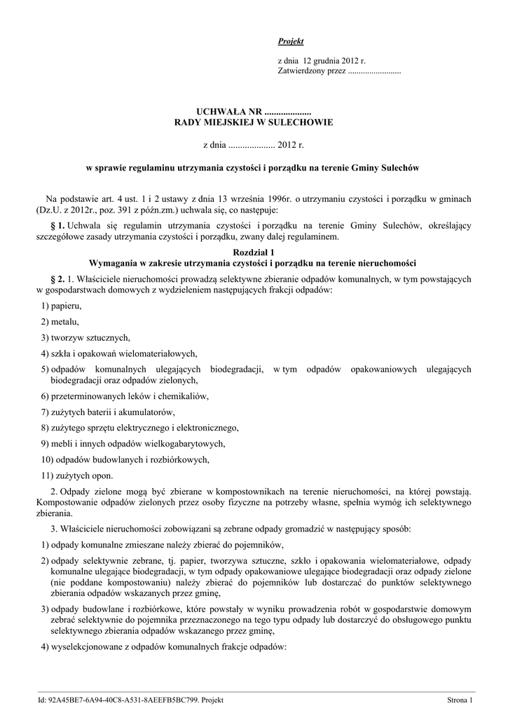 Projekt z dnia 12 grudnia 2012 r. Zatwierdzony przez ......................... UCHWAŁA NR .................... RADY MIEJSKIEJ W SULECHOWIE z dnia .................... 2012 r. w sprawie regulaminu utrzymania czystości i porządku na terenie Gminy Sulechów Na podstawie art. 4 ust. 1 i 2 ustawy z dnia 13 września 1996r. o utrzymaniu czystości i porządku w gminach (Dz.U. z 2012r., poz. 391 z późn.zm.) uchwala się, co następuje: § 1. Uchwala się regulamin utrzymania czystości i porządku na terenie Gminy Sulechów, określający szczegółowe zasady utrzymania czystości i porządku, zwany dalej regulaminem. Rozdział 1 Wymagania w zakresie utrzymania czystości i porządku na terenie nieruchomości § 2. 1. Właściciele nieruchomości prowadzą selektywne zbieranie odpadów komunalnych, w tym powstających w gospodarstwach domowych z wydzieleniem następujących frakcji odpadów: 1) papieru, 2) metalu, 3) tworzyw sztucznych, 4) szkła i opakowań wielomateriałowych, 5) odpadów komunalnych ulegających biodegradacji oraz odpadów zielonych, biodegradacji, w tym odpadów opakowaniowych ulegających 6) przeterminowanych leków i chemikaliów, 7) zużytych baterii i akumulatorów, 8) zużytego sprzętu elektrycznego i elektronicznego, 9) mebli i innych odpadów wielkogabarytowych, 10) odpadów budowlanych i rozbiórkowych, 11) zużytych opon. 2. Odpady zielone mogą być zbierane w kompostownikach na terenie nieruchomości, na której powstają. Kompostowanie odpadów zielonych przez osoby fizyczne na potrzeby własne, spełnia wymóg ich selektywnego zbierania. 3. Właściciele nieruchomości zobowiązani są zebrane odpady gromadzić w następujący sposób: 1) odpady komunalne zmieszane należy zbierać do pojemników, 2) odpady selektywnie zebrane, tj. papier, tworzywa sztuczne, szkło i opakowania wielomateriałowe, odpady komunalne ulegające biodegradacji, w tym odpady opakowaniowe ulegające biodegradacji oraz odpady zielone (nie poddane kompostowaniu) należy zbierać do pojemników lub dostarczać do punktów selektywnego zbierania odpadów wskazanych przez gminę, 3) odpady budowlane i rozbiórkowe, które powstały w wyniku prowadzenia robót w gospodarstwie domowym zebrać selektywnie do pojemnika przeznaczonego na tego typu odpady lub dostarczyć do obsługowego punktu selektywnego zbierania odpadów wskazanego przez gminę, 4) wyselekcjonowane z odpadów komunalnych frakcje odpadów: ————————————————————————————————————————————————————————— Id: 92A45BE7-6A94-40C8-A531-8AEEFB5BC799. Projekt Strona 1 a) meble i inne odpady wielkogabarytowe oraz zużyte opony, b) zużyty sprzęt elektryczny i elektroniczny, c) zużyte baterie i akumulatory, d) metale i chemikalia, - nie wymagają gromadzenia w pojemnikach i należy je wystawiać zebrane w sposób umożliwiający ich odbiór, nie wcześniej niż na dzień przed terminem określonym harmonogramem obwieszczonym przez gminę lub dostarczać do obsługowego punktu selektywnego zbierania odpadów wskazanego przez gminę, 5) przeterminowane leki oddawać do obsługowego punktu selektywnego zbierania odpadów komunalnych wskazanego przez gminę. 4. Właściciele nieruchomości zobowiązani są do przekazywania zmieszanych odpadów komunalnych oraz odpadów selektywnie zebranych, w częstotliwości i sposobie, o których mowa w rozdziale 3 niniejszego regulaminu. § 3. Właściciele nieruchomości dokonują uprzątnięcia błota, śniegu, lodu i innych zanieczyszczeń z części nieruchomości służących do użyku publicznego poprzez ich odgarnięcie do krawędzi chodnika, a w razie potrzeby ich pryzmowanie w sposób niepowodujący zakłóceń w ruchu pieszym i pojazdów, z zachowaniem swobodnego dostępu do wyznaczonych przejść dla pieszych oraz urządzeń energetycznych, gazowych, telekomunikacyjnych i innych. § 4. Ustala się wymagania w zakresie utrzymania czystości i porządku na terenie nieruchomości dotyczące mycia i naprawy pojazdów samochodowych, poza myjniami i warsztatami naprawczymi: 1) miejsce mycia pojazdów na nieruchomości ma być wyposażone w ujęcie wody o utwardzonej nawierzchni ze spadkiem zapewniającym spływ wody do sieci kanalizacji sanitarnej lub zbiornika bezodpływowego z tym zastrzeżeniem, że w przypadku mycia podwozia, silnika, skrzyni biegów i innych elementów konstrukcyjnych powstające ścieki należy poddać podczyszczeniu w urządzeniach tj. osadnik lub separator, 2) miejsce naprawy pojazdów na nieruchomości ma być utwardzone, a powstałe odpady, w zależności od ich rodzaju, należy gromadzić i pozbywać się w sposób przewidziany w przepisach szczególnych. Rozdział 2 Rodzaje i minimalna pojemność pojemników przeznaczonych do zbierania odpadów komunalnych na terenie nieruchomości oraz na drogach publicznych, warunki rozmieszczenia tych urządzeń i utrzymania w odpowiednim stanie sanitarnym, porządkowym i technicznym § 5. Określa się następujące rodzaje pojemników przeznaczonych do zbierania odpadów komunalnych: 1. na terenie nieruchomości: 1) pojemniki o minimalnej pojemności 120l, 2) kontenery o minimalnej pojemności 1100l, 3) worki o minimalnej pojemności 30l. 2. na drogach publicznych: 1) kosze uliczne o minimalnej pojemności 25l, 2) worki o minimalnej pojemności 20l. § 6. Minimalna pojemność pojemników do zbierania odpadów komunalnych na terenie nieruchomości, na której zamieszkują mieszkańcy musi odpowiadać iloczynowi liczby osób korzystających z tych pojemników i średniej ilości odpadów wytwarzanych w gospodarstwie domowym w ciągu tygodnia: 1) 30l/mieszkańca w razie braku selektywnego zbierania odpadów, 2) 20l/mieszkańca przy selektywnym zbieraniu odpadów. § 7. Minimalna pojemność pojemników do zbierania odpadów komunalnych na terenie nieruchomości, na której nie zamieszkują mieszkańcy, a na której pow
