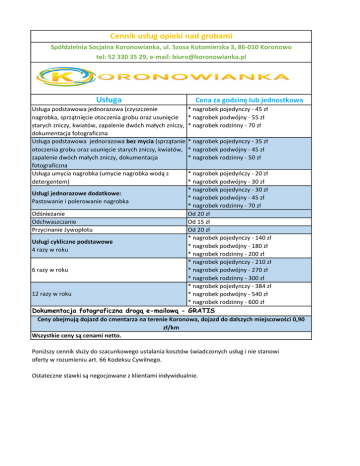 Cennik usług opieki nad grobami Spółdzielnia Socjalna Koronowianka, ul. Szosa Kotomierska 3, 86-010 Koronowo tel: 52 330 35 29, e-mail: [email protected] Usługa Usługa podstawowa jednorazowa (czyszczenie nagrobka, sprzątnięcie otoczenia grobu oraz usunięcie starych zniczy, kwiatów, zapalenie dwóch małych zniczy, dokumentacja fotograficzna Usługa podstawowa jednorazowa bez mycia (sprzątanie otoczenia grobu oraz usunięcie starych zniczy, kwiatów, zapalenie dwóch małych zniczy, dokumentacja fotograficzna Usługa umycia nagrobka (umycie nagrobka wodą z detergentem) Cena za godzinę lub jednostkowa * nagrobek pojedynczy - 45 zł * nagrobek podwójny - 55 zł * nagrobek rodzinny - 70 zł * nagrobek pojedynczy - 35 zł * nagrobek podwójny - 45 zł * nagrobek rodzinny - 50 zł * nagrobek pojedyńczy - 20 zł * nagrobek podwójny - 30 zł * nagrobek pojedynczy - 30 zł Usługi jednorazowe dodatkowe: * nagrobek podwójny - 45 zł Pastowanie i polerowanie nagrobka * nagrobek rodzinny - 70 zł Odśnieżanie Od 20 zł Odchwaszczanie Od 15 zł Przycinanie żywopłotu Od 20 zł * nagrobek pojedynczy - 140 zł Usługi cykliczne podstawowe * nagrobek podwójny - 180 zł 4 razy w roku * nagrobek rodzinny - 200 zł * nagrobek pojedynczy - 210 zł 6 razy w roku * nagrobek podwójny - 270 zł * nagrobek rodzinny - 300 zł * nagrobek pojedynczy - 384 zł 12 razy w roku * nagrobek podwójny - 540 zł * nagrobek rodzinny - 600 zł Dokumentacja fotograficzna drogą e-mailową - GRATIS Ceny obejmują dojazd do cmentarza na terenie Koronowa, dojazd do dalszych miejscowości 0,90 zł/km Wszystkie ceny są cenami netto. Poniższy cennik służy do szacunkowego ustalania kosztów świadczonych usług i nie stanowi oferty w rozumieniu art. 66 Kodeksu Cywilnego. Ostateczne stawki są negocjowane z klientami indywidualnie.