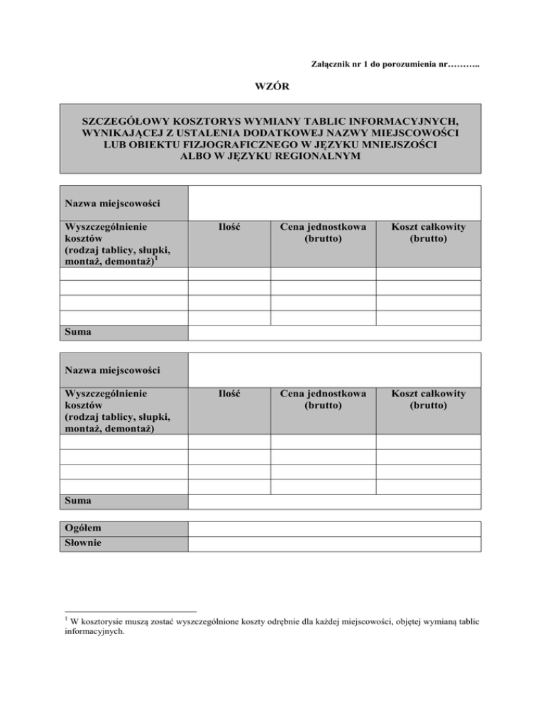 Załącznik nr 1 do porozumienia nr……….. WZÓR SZCZEGÓŁOWY KOSZTORYS WYMIANY TABLIC INFORMACYJNYCH, WYNIKAJĄCEJ Z USTALENIA DODATKOWEJ NAZWY MIEJSCOWOŚCI LUB OBIEKTU FIZJOGRAFICZNEGO W JĘZYKU MNIEJSZOŚCI ALBO W JĘZYKU REGIONALNYM Nazwa miejscowości Wyszczególnienie kosztów (rodzaj tablicy, słupki, montaż, demontaż)1 Ilość Cena jednostkowa (brutto) Koszt całkowity (brutto) Ilość Cena jednostkowa (brutto) Koszt całkowity (brutto) Suma Nazwa miejscowości Wyszczególnienie kosztów (rodzaj tablicy, słupki, montaż, demontaż) Suma Ogółem Słownie 1 W kosztorysie muszą zostać wyszczególnione koszty odrębnie dla każdej miejscowości, objętej wymianą tablic informacyjnych.