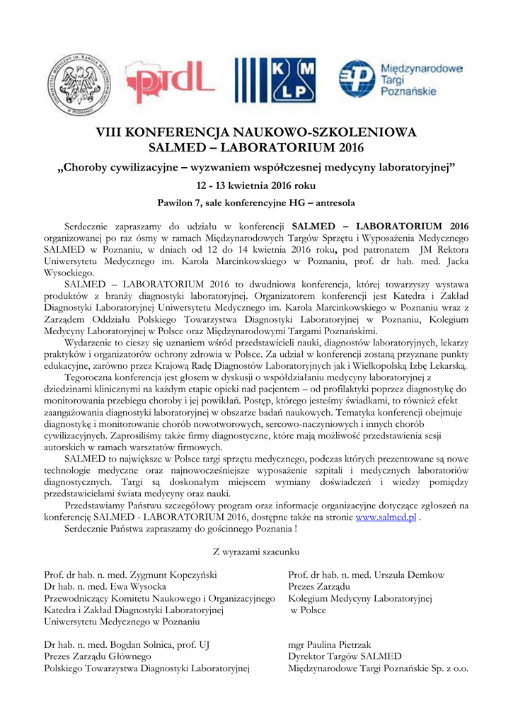 VIII KONFERENCJA NAUKOWO-SZKOLENIOWA SALMED – LABORATORIUM 2016 „Choroby cywilizacyjne – wyzwaniem współczesnej medycyny laboratoryjnej” 12 - 13 kwietnia 2016 roku Pawilon 7, sale konferencyjne HG – antresola Serdecznie zapraszamy do udziału w konferencji SALMED – LABORATORIUM 2016 organizowanej po raz ósmy w ramach Międzynarodowych Targów Sprzętu i Wyposażenia Medycznego SALMED w Poznaniu, w dniach od 12 do 14 kwietnia 2016 roku, pod patronatem JM Rektora Uniwersytetu Medycznego im. Karola Marcinkowskiego w Poznaniu, prof. dr hab. med. Jacka Wysockiego. SALMED – LABORATORIUM 2016 to dwudniowa konferencja, której towarzyszy wystawa produktów z branży diagnostyki laboratoryjnej. Organizatorem konferencji jest Katedra i Zakład Diagnostyki Laboratoryjnej Uniwersytetu Medycznego im. Karola Marcinkowskiego w Poznaniu wraz z Zarządem Oddziału Polskiego Towarzystwa Diagnostyki Laboratoryjnej w Poznaniu, Kolegium Medycyny Laboratoryjnej w Polsce oraz Międzynarodowymi Targami Poznańskimi. Wydarzenie to cieszy się uznaniem wśród przedstawicieli nauki, diagnostów laboratoryjnych, lekarzy praktyków i organizatorów ochrony zdrowia w Polsce. Za udział w konferencji zostaną przyznane punkty edukacyjne, zarówno przez Krajową Radę Diagnostów Laboratoryjnych jak i Wielkopolską Izbę Lekarską. Tegoroczna konferencja jest głosem w dyskusji o współdziałaniu medycyny laboratoryjnej z dziedzinami klinicznymi na każdym etapie opieki nad pacjentem – od profilaktyki poprzez diagnostykę do monitorowania przebiegu choroby i jej powikłań. Postęp, którego jesteśmy świadkami, to również efekt zaangażowania diagnostyki laboratoryjnej w obszarze badań naukowych. Tematyka konferencji obejmuje diagnostykę i monitorowanie chorób nowotworowych, sercowo-naczyniowych i innych chorób cywilizacyjnych. Zaprosiliśmy także firmy diagnostyczne, które mają możliwość przedstawienia sesji autorskich w ramach warsztatów firmowych. SALMED to największe w Polsce targi sprzętu medycznego, podczas których prezentowane są nowe technologie medyczne oraz najnowocześniejsze wyposażenie szpitali i medycznych laboratoriów diagnostycznych. Targi są doskonałym miejscem wymiany doświadczeń i wiedzy pomiędzy przedstawicielami świata medycyny oraz nauki. Przedstawiamy Państwu szczegółowy program oraz informacje organizacyjne dotyczące zgłoszeń na konferencję SALMED - LABORATORIUM 2016, dostępne także na stronie www.salmed.pl . Serdecznie Państwa zapraszamy do gościnnego Poznania ! Z wyrazami szacunku Prof. dr hab. n. med. Zygmunt Kopczyński Dr hab. n. med. Ewa Wysocka Przewodniczący Komitetu Naukowego i Organizacyjnego Katedra i Zakład Diagnostyki Laboratoryjnej Uniwersytetu Medycznego w Poznaniu Prof. dr hab. n. med. Urszula Demkow Prezes Zarządu Kolegium Medycyny Laboratoryjnej w Polsce Dr hab. n. med. Bogdan Solnica, prof. UJ Prezes Zarządu Głównego Polskiego Towarzystwa Diagnostyki Laboratoryjnej mgr Paulina Pietrzak Dyrektor Targów SALMED Międzynarodowe Targi Poznańskie Sp. z o.o. ZASADY UDZIAŁU W KONFERENCJI Konferencja płatna: 210 zł brutto – uczestnictwo w konferencji, 330 zł brutto – uczestnictwo w konferencji oraz w Wieczorze Branżowym – Gali Nowoczesnej Medycyny. Gala Nowoczesnej Medycyny odbędzie się 12 kwietnia 2016 o godzinie 19.00 w pawilonie nr 11, na terenie Międzynarodowych Targów Poznańskich. W ramach opłaty konferencyjnej uczestnicy mają zagwarantowane: identyfikator umożliwiający wstęp i zwiedzanie targów SALMED 2016 udział w konferencji i materiały konferencyjne, poczęstunek, udział w Gali Nowoczesnej Medycyny dla osób wnoszących opłatę: 330 zł brutto, certyfikat poświadczający uzyskanie punktów edukacyjnych. Wymagana rejestracja za pośrednictwem strony www.mtp24.pl lub na miejscu w kasie biletowej. JAK ZAREJESTROWAĆ SIĘ NA KONFERENCJĘ? Rejestracja i płatność poprzez stronę internetową www.mtp24.pl krok po kroku: 1. Jeśli mają Państwo konto na www.mtp24.pl , prosimy o zalogowanie się. Jeżeli odwiedzają Państwo stronę po raz pierwszy, wybieramy opcję „Rejestracja” w prawym górnym rogu strony, a następnie prosimy podążać za wskazaniami formularza. 2. Po zalogowaniu wybieramy wydarzenie „VIII Konferencja Naukowo-Szkoleniowa SALMED Laboratorium” 3. Następnie wybieramy wariant „Kup bilet elektroniczny”. 4. Uzupełniamy ankietę rejestracyjną. 5. Z listy dostępnych pozycji targowych wskazujemy: Konferencja + bilet wielokrotnego wstępu na targi SALMED (udział w samej konferencji) lub Konferencja + bilet wielokrotnego wstępu na targi SALMED + Gala Nowoczesnej Medycyny (jeśli planujemy udział również w Gali). 6. Zatwierdzamy wybór i dokonujemy płatności. 7. Po otrzymaniu płatności bilet będzie widoczny w Historii transakcji, dostępnej na głównej stronie pod wariantem: „Przejrzeć historię transakcji i wydrukować dokumenty”. 8. Następnie drukujemy bilet wstępu. Prosimy zabrać go na Targi SALMED. Uwaga! Rejestracja na konferencję poprzez wysyłkę listownego zgłoszenia oraz płatność przelewem nie są możliwe. Zapraszamy do skorzystania z rejestracji poprzez stronę www.mtp24.pl. Rejestracja w kasie biletowej podczas targów jest możliwa w dniach 12 - 13 kwietnia 2016 na jedną godzinę przed rozpoczęciem konferencji, tj. od godziny 9.00 – w każdej kasie MTP. Informujemy, że dostępna w kasie liczba miejsc na Galę Nowoczesnej Medycyny jest ograniczona. Aby zapewnić sobie udział w Gali, zapraszamy do skorzystania z rejestracji poprzez stronę www.mtp24.pl. W przypadku pytań dotyczących serwisu www.mtp24.pl prosimy o kontakt: tel. 61 869 2000 lub z p. Lidią Leitgeber tel. 61 869 21 69, [email protected]