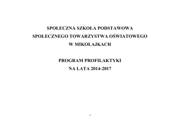SPOŁECZNA SZKOŁA PODSTAWOWA SPOŁECZNEGO TOWARZYSTWA OŚWIATOWEGO W MIKOŁAJKACH PROGRAM PROFILAKTYKI NA LATA 2014-2017 1 ZAŁOŻENIA SZKOLNEGO PROGRAMU PROFILAKTYKI 1. Szkolny Program Profilaktyki obejmuje działania mające na celu: a) kształtowanie pozytywnych zachowań uczniów zgodnych z zasadami kultury; b) rozwijanie umiejętności empatii, współpracy, komunikowania się i rozwiązywania konfliktów; c) umożliwienie wczesnego rozpoznania zagrożeń oraz rozwijanie strategii przeciwdziałania im; d) kształtowanie umiejętności samooceny uczniów i świadomej samodyscypliny; e) tworzenie pozytywnego wizerunku szkoły i poczucia odpowiedzialności za ład i porządek w szkole; g) rozwijanie współpracy z domem rodzinnym uczniów i wspólne rozwiązywanie problemów dzieci; h) naukę zdrowego stylu życia; i) bezpieczne funkcjonowanie ucznia w szkole i na zajęciach pozalekcyjnych. CELE SZKOLNEJ PROFILAKTYKI 1. Tworzenie przyjaznej atmosfery i poczucia bezpieczeństwa na terenie szkoły. 2. Uczenie postaw asertywnych wobec zagrożeń. 3. Kształtowanie postaw moralnych na przykładzie wzorców osobowych. 4. Kształtowanie nawyku zachowania porządku i dbałości o wspólny majątek. 5. Dbanie o bezpieczną drogę do szkoły. 6. Zachowanie bezpieczeństwa uczniów w drodze na różne zajęcia i podczas zajęć. 7. Promowanie zdrowego stylu życia. 8. Współpraca z rodzicami lub prawnymi opiekunami ucznia. 2 PODSTAWA PRAWNA 1. Konstytucja Rzeczpospolitej Polskiej z 2 kwietnia 1997r. 2. Konwencja Praw Dziecka 3. Ustawa o Systemie Oświaty z 7 września 1991r. (z późniejszymi zmianami) 4. Ustawa o ochronie zdrowia psychicznego z dnia 19 sierpnia 1994r. 5. Ustawa o ochronie zdrowia przed następstwami używania tytoniu i wyrobów tytoniowych z dnia 9 listopada 1995r. 6. Narodowy program ochrony zdrowia psychicznego – rozporządzenie RM z 28 grudnia 2010r. DOKUMENTY PRAWA WEWNĄTRZSZKOLNEGO 1. Statut szkoły 2. Program wychowawczy szkoły na lata 2014-2017 3 Cel główny Zadania szczegółowe Tworzenie przyjaznej atmosfery i poczucia bezpieczeństwa na terenie szkoły. Uczenie zasad kultury Przeciwdziałani e aktom przemocy. Zapobieganie patologii zachowań wśród dzieci: agresja słowna, fizyczna Osoby objęte zadaniem Wszyscy uczniowie, nauczyciele pracownicy obsługi i administracji Wszyscy uczniowie, nauczyciele, rodzice Sposób realizacji zadań Osoby odpowiedzialne za realizację wychowawcy klas Termin realizacji Dokumentacja wrzesień plany wychowawcze 2. Pogadanki na godzinach wychowawczych na temat kultury bycia. wychowawcy klas zapisy w e-dzienniku 3. Wymaganie od uczniów przestrzegania zasad kultury bycia i bezpiecznego zachowania się podczas przerw, w czasie wycieczek i imprez szkolnych. 4. Uczenie zasad wzajemnego szacunku. nauczyciele dyżurujący opiekunowie wycieczek wychowawcy, nauczyciele, pedagog według planów pracy wychowawców cały rok cały rok wpisy w e-dzienniku; plany wychowawcze 5. Uczenie pozytywnych zachowań podczas przerw i w czasie lekcji oraz wdrażanie do przestrzegania form grzecznościowych w kontaktach z dorosłymi i rówieśnikami. 1. Wzmożona kontrola uczniów przez nauczycieli podczas przerw między lekcjami ze szczególnym uwzględnieniem opieki nad uczniami klas pierwszych i osobami niepełnosprawnymi. 2. Analiza sytuacji wychowawczej na posiedzeniach zespołu wychowawczego. Wypracowanie wniosków. wychowawcy, nauczyciele, pedagog szkolny cały rok wpisy w e-dzienniku; plany wychowawcze nauczyciele dyżurujący cały rok plan pracy szkoły wychowawcy, pedagog wrzesień /październik protokoły z posiedzeń zespołu; dokumentacja pedagoga 3. Zajęcia z przedstawicielami policji na temat skutków stosowania przemocy. pedagog, dyrektor w roku szkolnym sprawozdanie pedagoga 4. Pedagogizacja rodziców: 4.1 Rola wychowawcza rodziców 4.2. Problemy okresu dojrzewania. oraz w nawiązaniu do potrzeb uczniów, rodziców i nauczycieli. pedagog, wychowawcy klas w roku szkolnym wpisy w e-dzienniku; protokoły z wywiadówek, dokumentacja pedagoga 1. Opracowanie szczegółowych zadań wychowawczych. 4 wpisy w e-dzienniku; Kształtowanie postaw asertywnych wobec zagrożeń. Kształtowanie umiejętności radzenia sobie w trudnych sytuacjach Kontrolowane kontakty z osobami obcymi na terenie szkoły Wszyscy uczniowie i nauczyciele oraz rodzice Uczniowie, nauczyciele, pracownicy szkoły 5. Zajęcia warsztatowe z pedagogiem w poszczególnych klasach oraz pogadanki na temat przeciwdziałania przemocy oraz wyładowywania złości. 6. Prowadzenie zajęć programu promocji zdrowia psychicznego "Przyjaciele Zippiego". 1. Szkoleniowa Rada Nauczycieli - temat w planie nadzoru. pedagog, wychowawcy klas w roku szkolnym pedagog cały rok dyrektor w roku szkolnym 2. Zachęcanie uczniów niepełnosprawnych do pełnego uczestnictwa w życiu klasy i szkoły. wychowawcy, pedagog cały rok plany wychowawcze, dokumentacja pedagoga 3. Pogadanki na temat: „Jak radzić sobie ze stresem w różnych sytuacjach" oraz "Praca nad emocjami". 4. Ankieta i obserwacje: Diagnoza przyczyn niepowodzeń szkolnych Wypracowanie form pomocy uczniom będącym w trudnej sytuacji. Realizacja ich założeń przez wszystkich nauczycieli. 1. Kontrola osób wchodzących do szkoły wychowawcy według planów wychowawczyc plany wychowawcze, zapis w e-dzienniku zespół wychowawczy, pedagog, nauczyciele cały rok nauczyciele dyżurni pracownicy niepedagogiczni cały rok ankieta i wypracowane po jej analizie wnioski, dokumentacja wychowawcy i pedagoga dokumentacja szkoły 2. Obecność nauczyciela podczas przerw spędzanych poza budynkiem szkoły. 3. Obserwacja otoczenia wokół szkoły, a szczególnie osób obcych. nauczyciele dyżurni cały rok nauczyciele, pracownicy niepedagogiczni dyrektor, wychowawcy, pedagog cały rok dokumentacja szkoły zebrania szkolne, godziny wychowawcze, godziny z pedagog. dokumentacja wychowawcy i pedagoga 4. Zapoznanie z procedurą postępowania nauczycieli, rodz