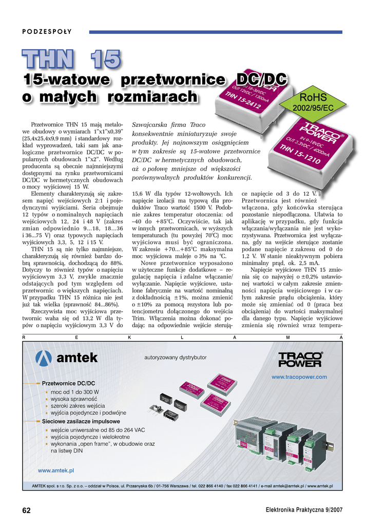 P O D Z E S P O ŁY THN 15 15-watowe przetwornice DC/DC o małych rozmiarach Przetwornice THN 15 mają metalowe obudowy o wymiarach 1”x1”x0,39” (25,4x25,4x9,9 mm) i standardowy rozkład wyprowadzeń, taki sam jak analogiczne przetwornice DC/DC w popularnych obudowach 1”x2”. Według producenta są obecnie najmniejszymi dostępnymi na rynku przetwornicami DC/DC w hermetycznych obudowach o mocy wyjściowej 15 W. Elementy charakteryzują się zakresem napięć wejściowych 2:1 i pojedynczymi wyjściami. Seria obejmuje 12 typów o nominalnych napięciach wejściowych 12, 24 i 48 V (zakres zmian odpowiednio 9...18, 18...36 i 36...75 V) oraz typowych napięciach wyjściowych 3,3, 5, 12 i 15 V. THN 15 są nie tylko najmniejsze, charakteryzują się również bardzo dobrą sprawnością, dochodzącą do 88%. Dotyczy to również typów o napięciu wyjściowym 3,3 V, zwykle znacznie odstających pod tym względem od przetwornic o większych napięciach. W przypadku THN 15 różnica nie jest już tak wielka (sprawność 84...86%). Rzeczywista moc wyjściowa przetwornic waha się od 13,2 W dla typów o napięciu wyjściowym 3,3 V do R 62 E Szwajcarska firma Traco konsekwentnie miniaturyzuje swoje produkty. Jej najnowszym osiągnięciem w tym zakresie są 15-watowe przetwornice DC/DC w hermetycznych obudowach, aż o połowę mniejsze od większości porównywalnych produktów konkurencji. ce napięcie od 3 do 12 V. Przetwornica jest również włączona, gdy końcówka sterująca pozostanie niepodłączona. Ułatwia to aplikację w przypadku, gdy funkcja włączania/wyłączania nie jest wykorzystywana. Przetwornica jest wyłączana, gdy na wejście sterujące zostanie podane napięcie z zakresu od 0 do 1,2 V. W stanie nieaktywnym pobiera minimalny prąd, ok. 2,5 mA. Napięcie wyjściowe THN 15 zmienia się co najwyżej o ±0,2% ustawionej wartości w całym zakresie zmienności napięcia wejściowego i w całym zakresie prądu obciążenia, który może się zmieniać od 0 (praca bez obciążenia) do wartości maksymalnej dla danego typu. Napięcie wyjściowe zmienia się również wraz tempera- 15,6 W dla typów 12-woltowych. Ich napięcie izolacji ma typową dla produktów Traco wartość 1500 V. Podobnie zakres temperatur otoczenia: od –40 do +85°C. Oczywiście, tak jak w innych przetwornicach, w wyższych temperaturach (tu powyżej 70°C) moc wyjściowa musi być ograniczona. W zakresie +70...+85°C maksymalna moc wyjściowa maleje o 3% na °C. Nowe przetwornice wyposażono w użyteczne funkcje dodatkowe – regulację napięcia i zdalne włączanie/ wyłączanie. Napięcie wyjściowe, ustalone fabrycznie na wartość nominalną z dokładnością ±1%, można zmienić o ±10% za pomocą rezystora lub potencjometru dołączonego do wejścia Trim. Włączenia można dokonać podając na odpowiednie wejście sterująK L A M A Elektronika Praktyczna 9/2007 P O D Z E S P O ŁY THN 15-1211 THN 15-1212 THN 15-1213 THN 15-2410 THN 15-2411 THN 15-2412 THN 15-2413 THN 15-4810 THN 15-4811 THN 15-4812 THN 15-4813 Sprawność [%] THN 15-1210 Napięcie wejściowe [V] Napięcie wyjściowe [V] Maksymalny prąd wyjściowy [A] Typ Tab. 1. Podstawowe parametry przetwornic z serii THN 15 3,3 84 9-18 (nominalnie 12) 18-36 (nominalnie 24) 36-75 (nominalnie 48) 4,0 5 3,0 86 12 1,3 85 15 1,0 87 3,3 4,0 86 5 3,0 86 12 1,3 86 15 1,0 88 3,3 4,0 86 5 3,0 88 12 1,3 88 15 1,0 88 przekraczają 100 mVp-p (w paśmie 20 MHz). Wejścia przetwornic są zabezpieczone przed nadmiernym spadkiem napięcia, o progu zadziałania 8, 14,5 lub 30,5 V, odpowiednio dla typów o roboczym zakresie napięć wejściowych 9...18, 18...36 i 36...75 V. Wyjścia są zabezpieczone przed Rys. 1. Zalecany układ aplikacyjny zapewniający przeciążeniami i zwarcia- odpowiednią redukcję zakłóceń na wejściu oraz mi. Zabezpieczenie ma tętnień i szumów na wyjściu przetwornicy charakterystykę „z podcięciem” (foldback) i włącza się przy w technologii bezołowiowej, zgodnie prądzie 1,5 raza większym od maksyz unijną dyrektywą RoHS. Potwierdzemalnego prądu pracy danego typu. Po niem ich jakości i niezawodności jest ustąpieniu przeciążenia lub zwarcia 3-letnia gwarancja producenta. przetwornica automatycznie powraca KK do normalnej pracy. Obwody wyjścioDodatkowe informacje we zabezpieczono również przed nadmiernym wzrostem napięcia. Dystrybutorem jest Amtek spol. s r.o. Sp. z o.o. tel. 022 866 41 40 Przetwornice THN 15 spełniają e–mail: [email protected], www.amtek.pl międzynarodowe normy bezpieczeństwa (IEC/EN/UL 60950-1) oraz emisji Karta katalogowa przetwornic THN 15 jest dostępna pod adresem: zakłóceń (EN 55022, level A – z zehttp://dsb.tracopower.com/upload/DSBUserFile/ wnętrznym kondensatorem filtrująCPN_TracoPower/0_thn15.pdf cym jak na rys. 1). Są wykonywane turą, w stosunku ±0,02 %/°C. Poza tym elementy charakteryzują się dość małymi tętnieniami i szumami wyjściowymi, które w typowym układzie aplikacyjnym, z odpowiednimi kondensatorami filtrującymi (patrz rys. 1), nie R E Elektronika Praktyczna 9/2007 K L A M A 63