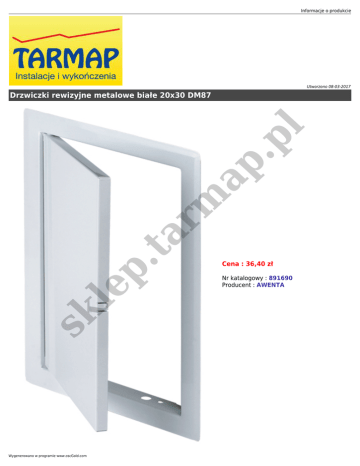 Informacje o produkcie Utworzono 08-03-2017 sk le p .t a rm ap .p l Drzwiczki rewizyjne metalowe białe 20x30 DM87 Wygenerowano w programie www.oscGold.com Cena : 36,40 zł Nr katalogowy : 891690 Producent : AWENTA Wymiary wewnętrzne: 200mmx300mm Wymiary zewnętrzne: 250mmx350mm Dł. kołnierza: 25mm Kolor: biały sk le p .t a rm ap .p l Drzwiczki rewizyjne metalowe spełniają tę samą funkcję, co drzwiczki z tworzywa serii DT - umożliwiają dostęp do otworów rewizyjnych. Występują w wersjach DM i DMN. Drzwiczki DM wykonane są z blachy stalowej i pokryte powłoką epoksydową w kolorze białym.