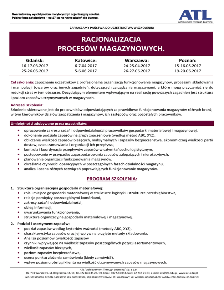 Gwarantowany wysoki poziom merytoryczny i organizacyjny szkoleń. Polska firma szkoleniowa – od 17 lat na rynku szkoleń dla biznesu. ZAPRASZAMY PAŃSTWA DO UCZESTNICTWA W SZKOLENIU: RACJONALIZACJA PROCESÓW MAGAZYNOWYCH. Gdańsk: Katowice: Warszawa: Poznań: 16-17.03.2017 25-26.05.2017 6-7.04.2017 5-6.06.2017 24-25.04.2017 26-27.06.2017 15-16.05.2017 19-20.06.2017 Cel szkolenia: zapoznanie uczestników z profesjonalną organizacją funkcjonowania magazynów, procesami składowania i manipulacji towarów oraz innych zagadnień, dotyczących zarządzania magazynami, a które mogą przyczyniać się do redukcji strat w tym obszarze. Decydującym elementem wpływającym na realizację powyższych zagadnień jest struktura i poziom zapasów utrzymywanych w magazynach. Adresaci szkolenia: Szkolenie skierowane jest do pracowników odpowiadających za prawidłowe funkcjonowania magazynów różnych branż, w tym kierowników działów zaopatrzenia i magazynów, ich zastępców oraz pozostałych pracowników. Umiejętności zdobywane przez uczestników: • • • • • • • • opracowanie zakresu zadań i odpowiedzialności pracowników gospodarki materiałowej i magazynowej, dokonanie podziału zapasów na grupy znaczeniowe (według metod ABC, XYZ), obliczanie wielkości zapasów bieżących, maksymalnych i zapasów bezpieczeństwa, ekonomicznej wielkości partii dostaw, czasu zamawiania i organizacji ich przepływu, kontrola i koordynacja przepływów zapasów w całym łańcuchu logistycznym, postępowanie w przypadku zagospodarowania zapasów zalegających i nierotacyjnych, planowanie organizacji funkcjonowania magazynów, określanie czynności operacyjnych w poszczególnych fazach działalności magazynu, analiza i ocena różnych rozwiązań poprawiających funkcjonowanie magazynów. PROGRAM SZKOLENIA: 1. Struktura organizacyjna gospodarki materiałowej: • rola i miejsce gospodarki materiałowej w strukturze logistyki i strukturze przedsiębiorstwa, • relacje pomiędzy poszczególnymi komórkami, • zakresy zadań i odpowiedzialności, • obieg informacji, • uwarunkowania funkcjonowania, • struktura organizacyjna gospodarki materiałowej i magazynowej. 2. Podział i asortyment zapasów: • podział zapasów według kryteriów ważności (metody ABC, XYZ), • charakterystyka zapasów oraz jej wpływ na przyjęte metody składowania. • Analiza poziomów (wielkości) zapasów • czynniki wpływające na wielkość zapasów poszczególnych pozycji asortymentowych, • wielkość zapasów bieżących, • poziom zapasów bezpieczeństwa, • ocena punktu złożenia zamówienia (kiedy zamówić?), • wpływ poziomu obsługi klienta na wielkość utrzymywanych zapasów magazynowych. ATL “Achievement Through Learning” Sp. z o.o. 02-793 Warszawa, ul. Belgradzka 14/14; tel.: 22 853 35 23, tel. kom.: 607 573 053, faks: 22 247 21 83, e-mail: [email protected], www.atl.edu.pl NIP: 5213358018, REGON: 140233796 KRS: 0000241906, SĄD REJONOWY DLA M. ST. WARSZAWY, XIII WYDZIAŁ GOSPODARCZY KAPITAŁ ZAKŁADOWY: 80.000 PLN Gwarantowany wysoki poziom merytoryczny i organizacyjny szkoleń. Polska firma szkoleniowa – od 17 lat na rynku szkoleń dla biznesu. 3. Ekonomika dostaw: • ekonomiczna wielkość dostawy (EWD) - optymalizacja dostaw dla poszczególnych pozycji zapasów (ile zamówić?), • wielkość zapasów maksymalnych. 4. Zagospodarowanie zapasów zalegających i nierotacyjnych: • wielkość zapasów zalegających i nierotacyjnych, • sposoby postępowania z zapasami zalegającymi i nierotacyjnymi. 5. Mierniki i wskaźniki oceny zapasów magazynowych: • podział mierników i wskaźników wykorzystywanych w ocenie zapasów, • wskaźniki rotacji zapasów magazynowych, • możliwości i potrzeby oceny struktury i poziomów zapasów. 6. Miejsce, rola i zadania magazynów w przedsiębiorstwie w realiach gospodarki rynkowej: • zadania magazynów w zintegrowanych łańcuchach dostaw. • Technologia operacji magazynowych: • charakterystyka technologicznego procesu magazynowania, • organizacja prac magazynowych w przedsiębiorstwie, • dostosowanie operacji magazynowych do rodzaju magazynów i poszczególnych ich elementów. 7. Odpowiedzialność materialna pracowników za powierzone mienie: • dokumenty normujące odpowiedzialność materialną, • uwarunkowania prawne normujące kwestie odpowiedzialności materialnej pracowników za powierzone mienie, • praktyczne rozwiązania dot. odpowiedzialności materialnej. 8. Inwentaryzacja składników majątku w gospodarce magazynowej: • rodzaje inwentaryzacji stosowane w gospodarce magazynowej, • dokumenty normujące sposób przeprowadzenia inwentaryzacji, • metody i sposób przeprowadzenia inwentaryzacji, • realizacja procedur inwentaryzacyjnych, • błędy w realizacji procesów inwentaryzacyjnych. 9. Metody rozmieszczenia i kompletacji zapasów: • metoda stałych miejsc składowych, • metoda wolnych miejsc składowych, • metody mieszane, • metody kompletacji zapasów. • Metody składowania zapasów: • organizacja tradycyjnych metod składowania, • nowoczesne rozwiązania składowania zapasów, • rozmieszczenie zapasów w magazynach. 10. System znakowania i identyfikacji miejsc składowania, towarów w opakowaniach jednostkowych i zbiorczych: • zasady znakowania ładunków w magazynach, • oznakowanie miejsc składowania zapasów, • organizacja systemu kodów kreskowych zgodna z systemem EAN, • wykorzystanie fal radiowych do identyfikacji towarów w magazynach - technika RFID. ATL “Achievement Through Learning” Sp. z o.o. 02-793 Warszawa, ul. Belgradzka 14/14; tel.: 22 853 35 23, tel. kom.: 607 573 053, faks: 22 247 21 83, e-mail: [email protected], www.atl.edu.pl NIP: 5213358018, REGON: 140233796 KRS: 0000241906, SĄD REJONOWY DLA M. ST. WARSZAWY, XIII WYDZIAŁ GOSPODARCZY KAPITAŁ ZAKŁADOWY: 80.000 PLN Gwarantowany wysoki poziom merytoryczny i organizacyjny szkoleń. Po
