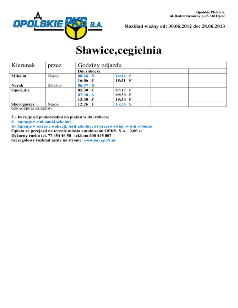 Opolskie PKS S.A. ul. Rodziewiczówny 1, 45-348 Opole Rozkład ważny od: 30.06.2012 do: 28.06.2013 Sławice,cegielnia Kierunek przez Mikolin Narok Narok Opole,d.a. Żelazna Skorogoszcz Narok Godziny odjazdu Dni robocze 08:26 H 16:06 F 06:37 H 05:30 F 07:20 S 13:30 F 12:26 F 14:46 S 18:31 F 07:17 09:30 19:30 13:36 F F F S OZNACZENIA KURSÓW: F - kursuje od poniedziałku do piątku w dni robocze S - kursuje w dni nauki szkolnej H- kursuje w okresie wakacji, ferii szkolnych i przerw świąt. w dni robocze Opłata za przejazd na terenie miasta autobusami OPKS S.A. 2,00 zł Dyżurny ruchu tel. 77 454 46 50 tel.kom.600 445 007 Szczegółowy rozkład jazdy na stronie: www.pks.opole.pl